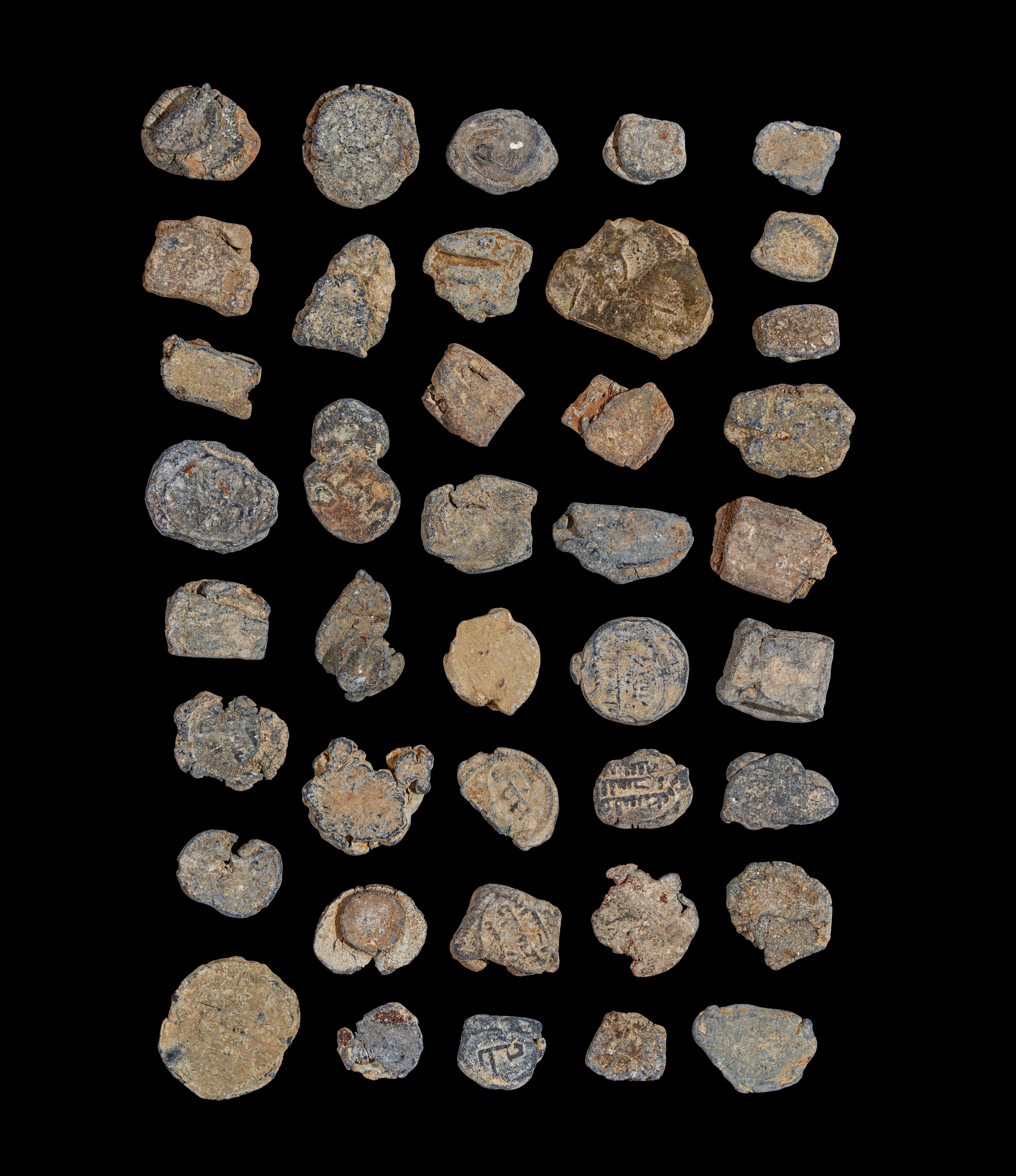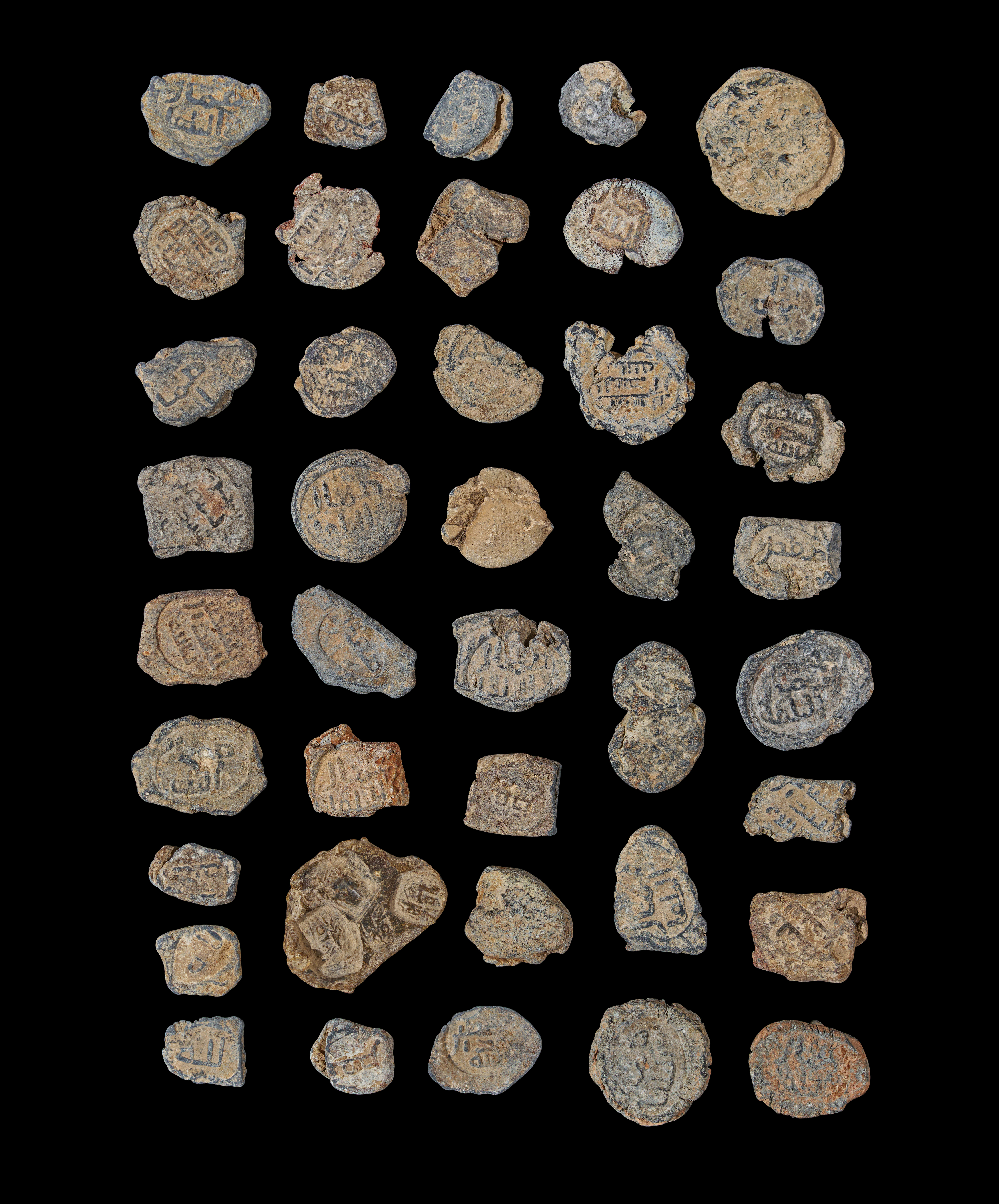 The seals vary in shape and size, with many bearing inscriptions, symbols, and impressions typical of Abbasid bureaucratic practice. Some appear to have been struck with personal names, while others likely represent official or institutional marks. Their rugged surfaces and earthen patina testify to centuries of burial and use, adding to their archaeological character.