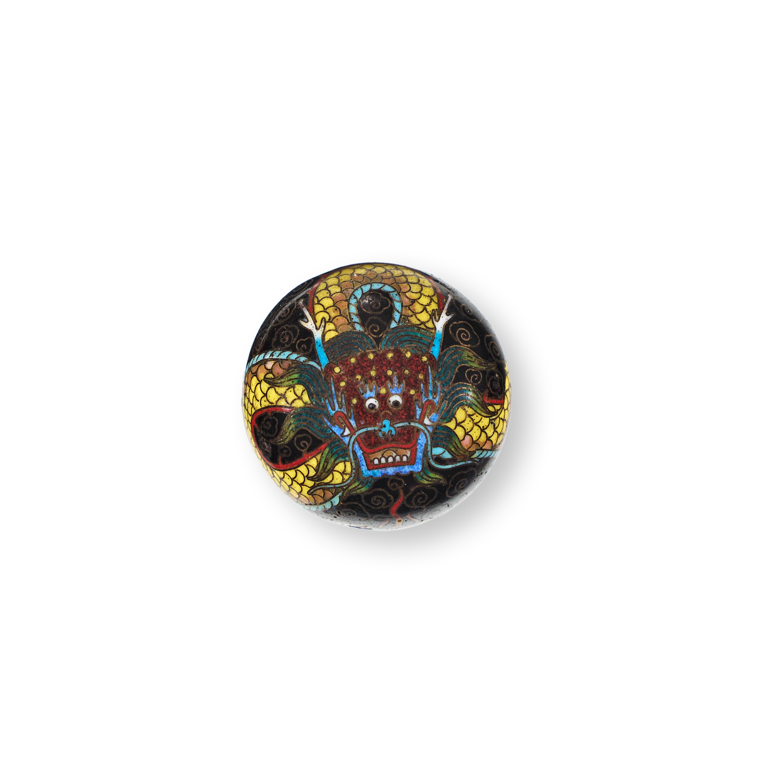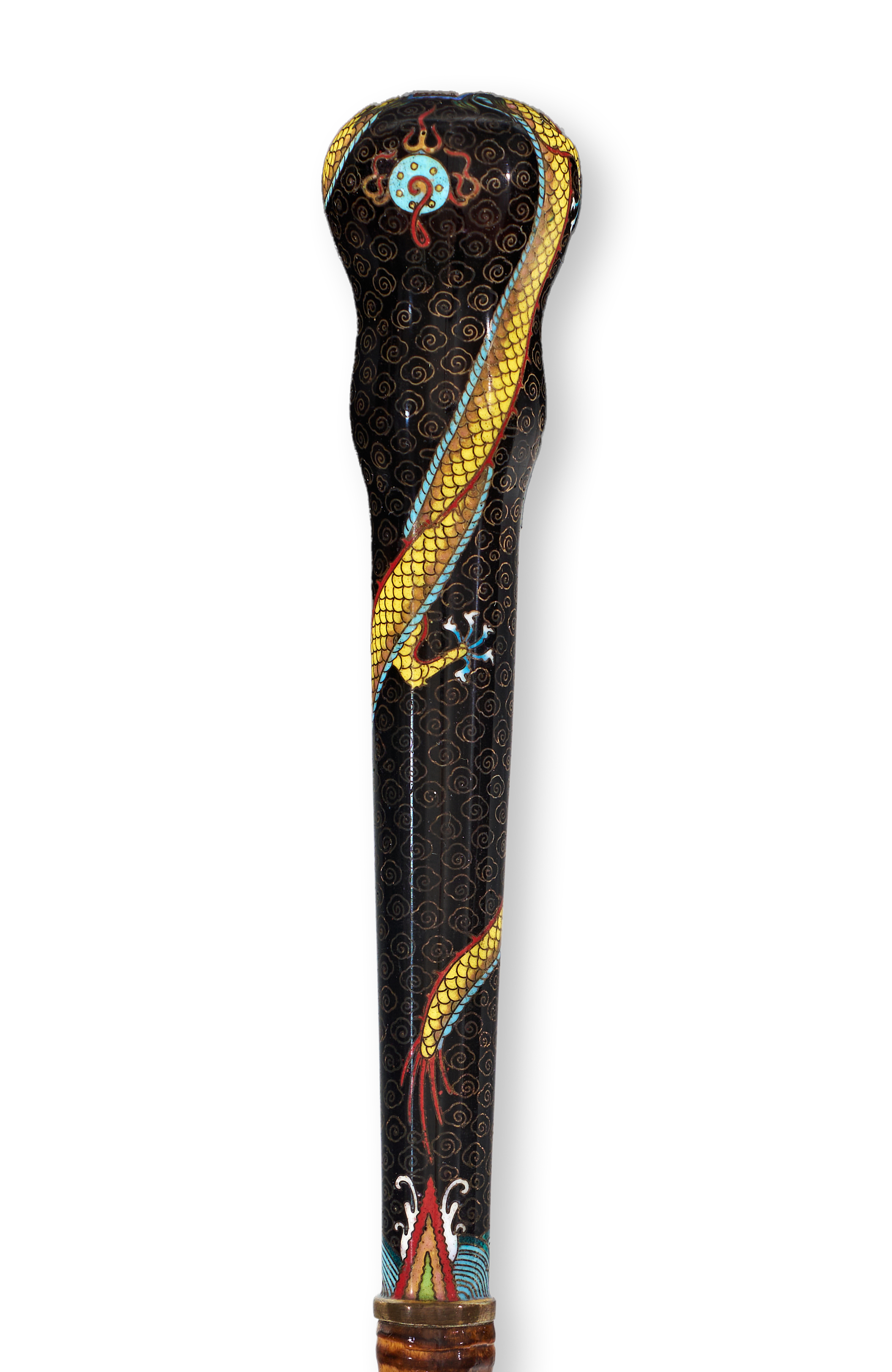 of tapering form, decorated with a scaly five-clawed dragon entwined around the handle, all reserved on a ruyi-cloud diaper black ground, 14.5cm long