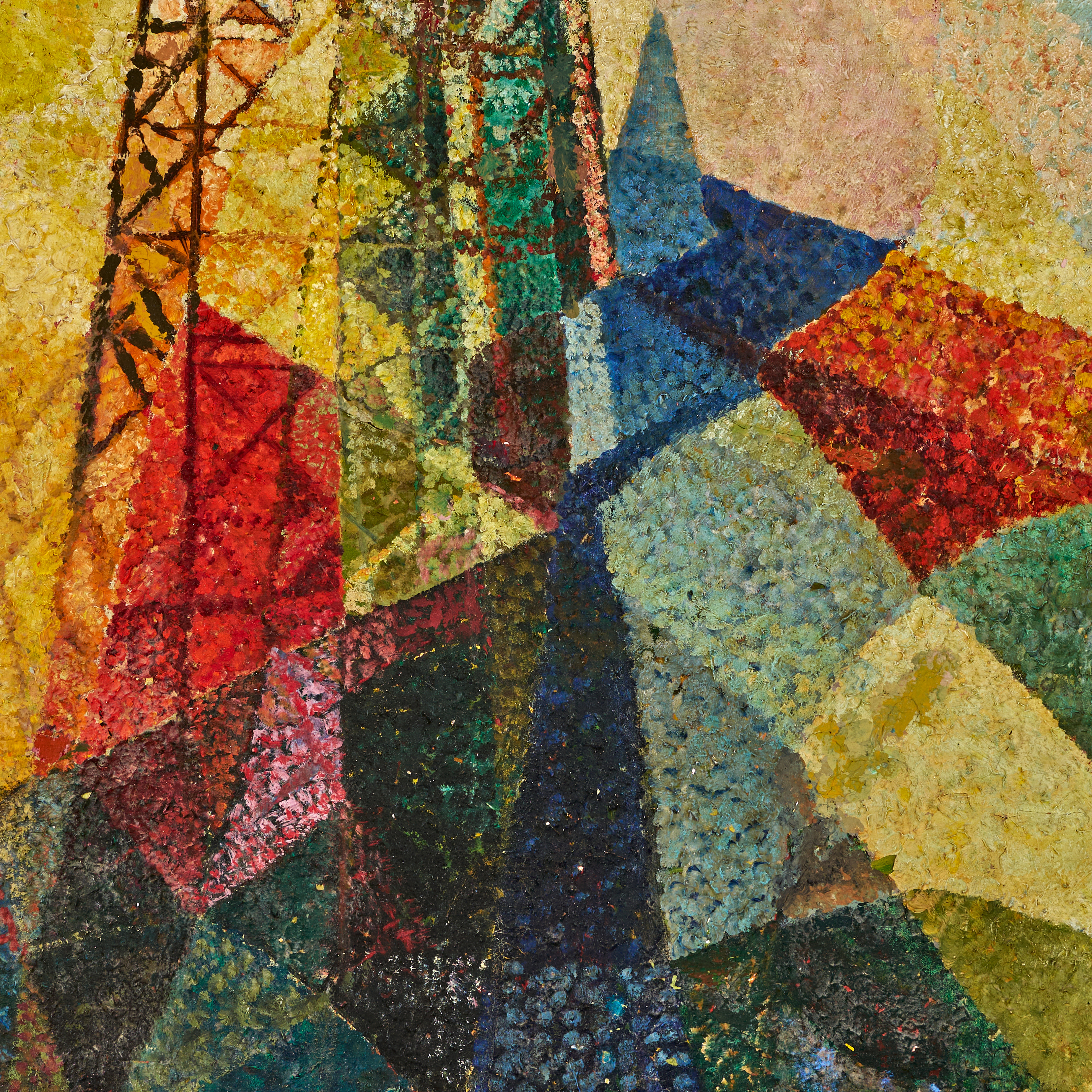 This vibrant, dynamic oil painting exemplifies the distinctive modernist style of Hafidh al-Droubi, one of Iraq’s most influential 20th-century artists and a pioneer of Baghdad’s modern art movement. Rendered in a faceted, prismatic composition reminiscent of Cubism and Futurist fragmentation, the work uses bold geometric planes and radiant color fields to create a sense of rhythmic energy and architectural uplift.