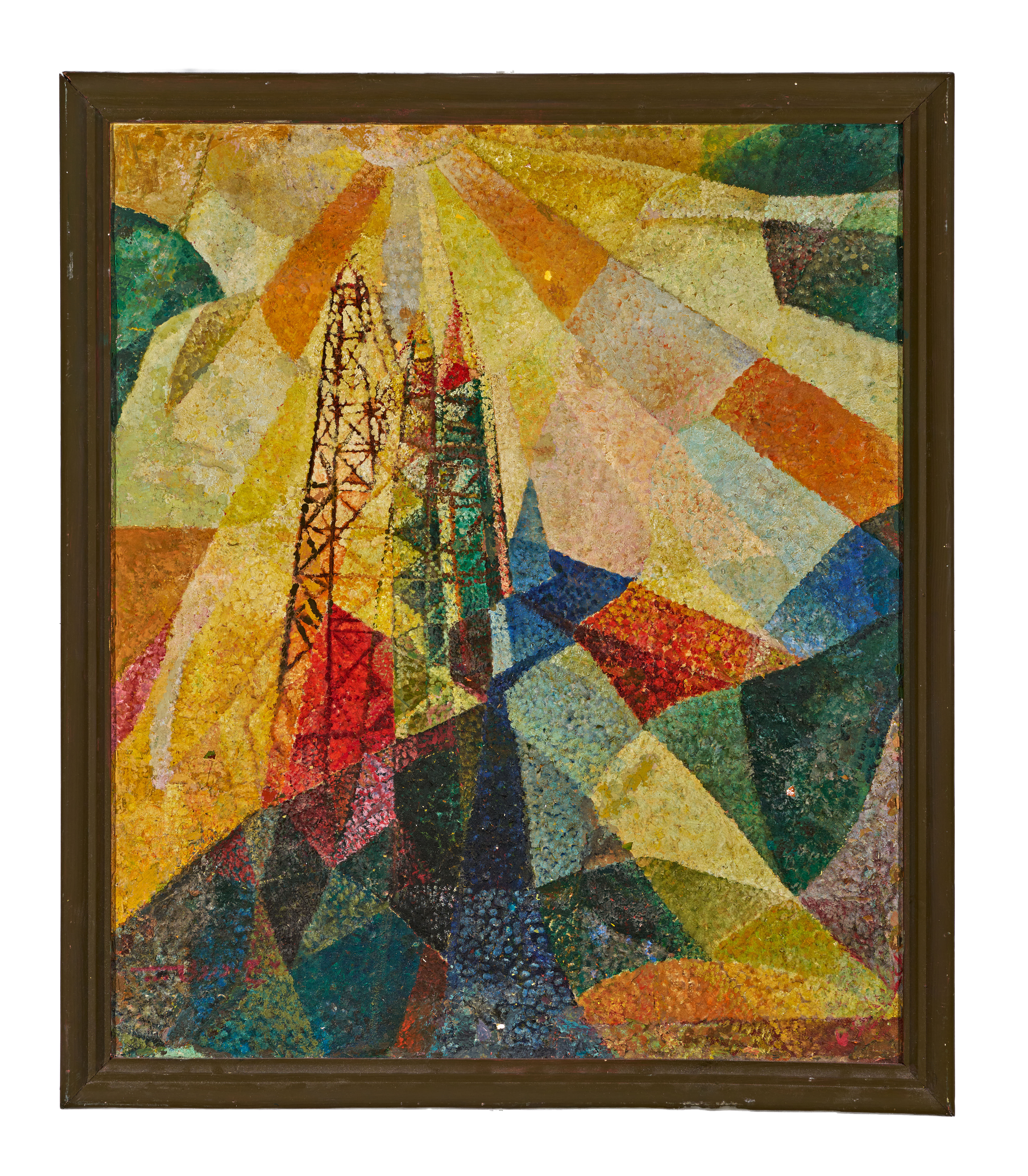 At the center, abstracted vertical structures rise upward, possibly referencing urban development, radio towers, oil rigs, or symbols of industrial progress — themes Al-Droubi explored within Baghdad’s rapidly modernizing landscape. Radiating beams of yellow, orange, and soft pastel tones evoke sunlight, adding dramatic luminosity to the composition.