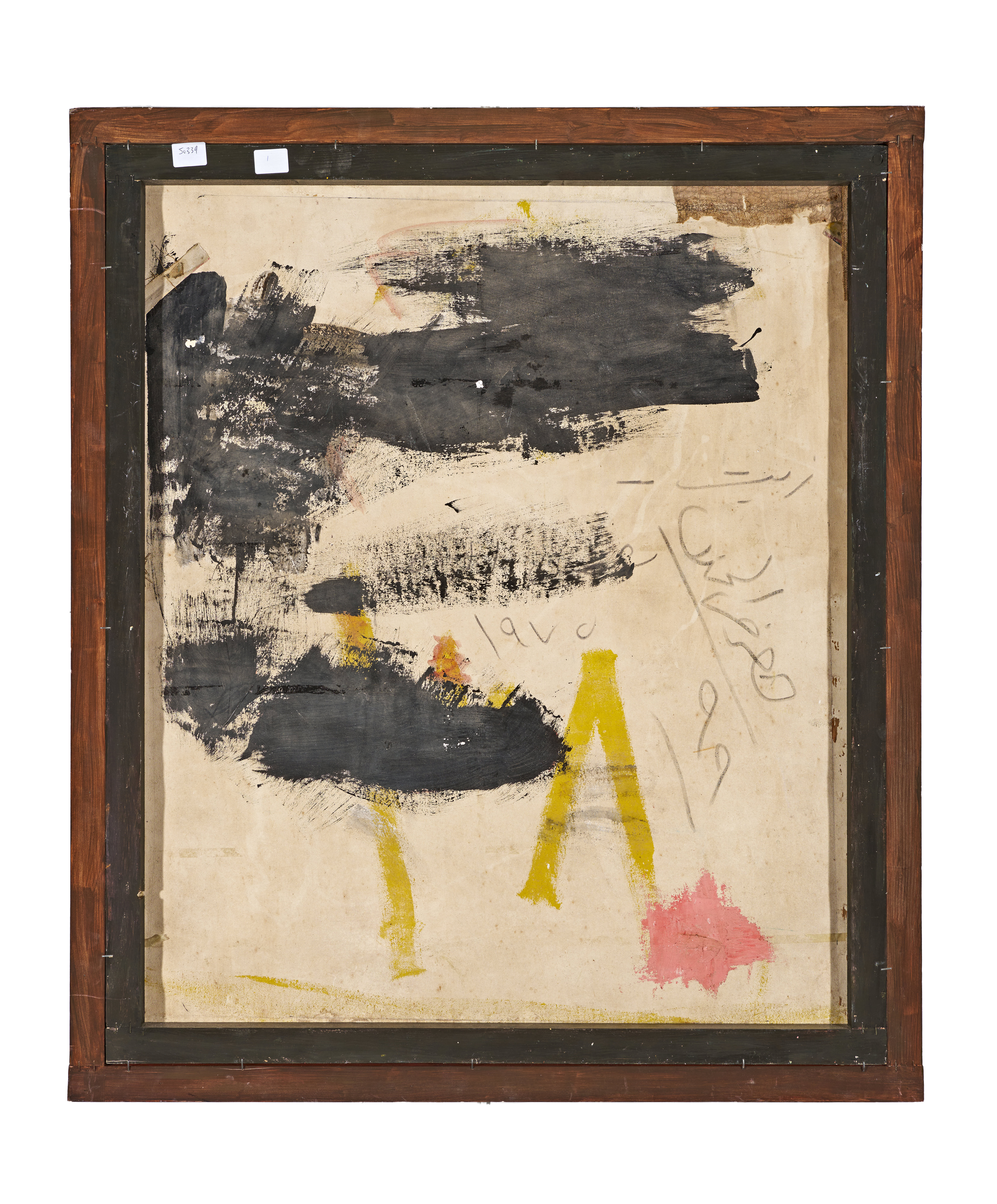 The reverse of the canvas includes expressive strokes of black and yellow pigment, painter’s notes, markings, and Arabic inscriptions, offering insight into the artist’s process.