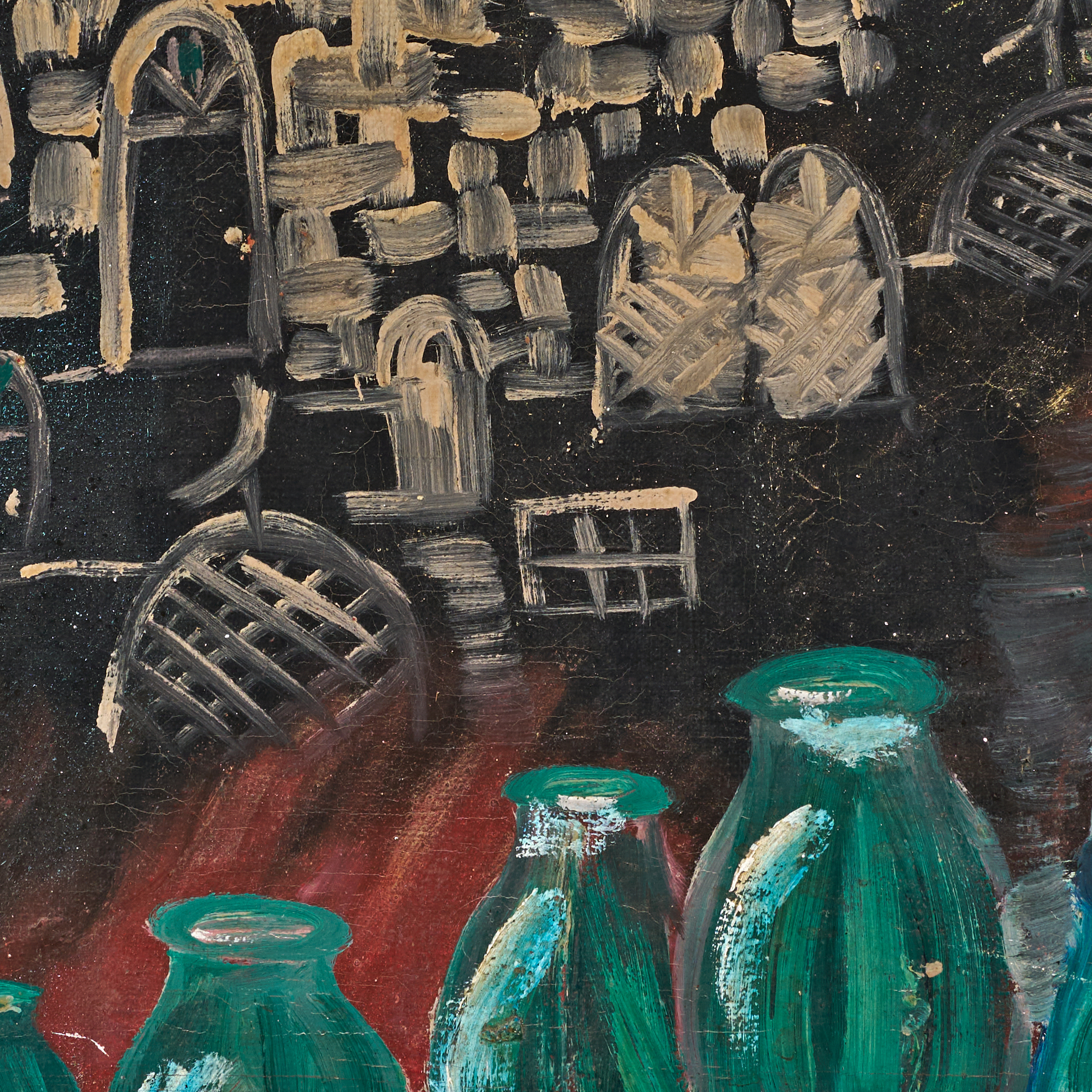 In the foreground, a row of large vessels painted in vibrant turquoise and green hues provides a striking chromatic contrast, anchoring the composition and creating a sense of depth. The unconventional triangular canvas format enhances the artwork’s modernist sensibility and adds to its visual impact.