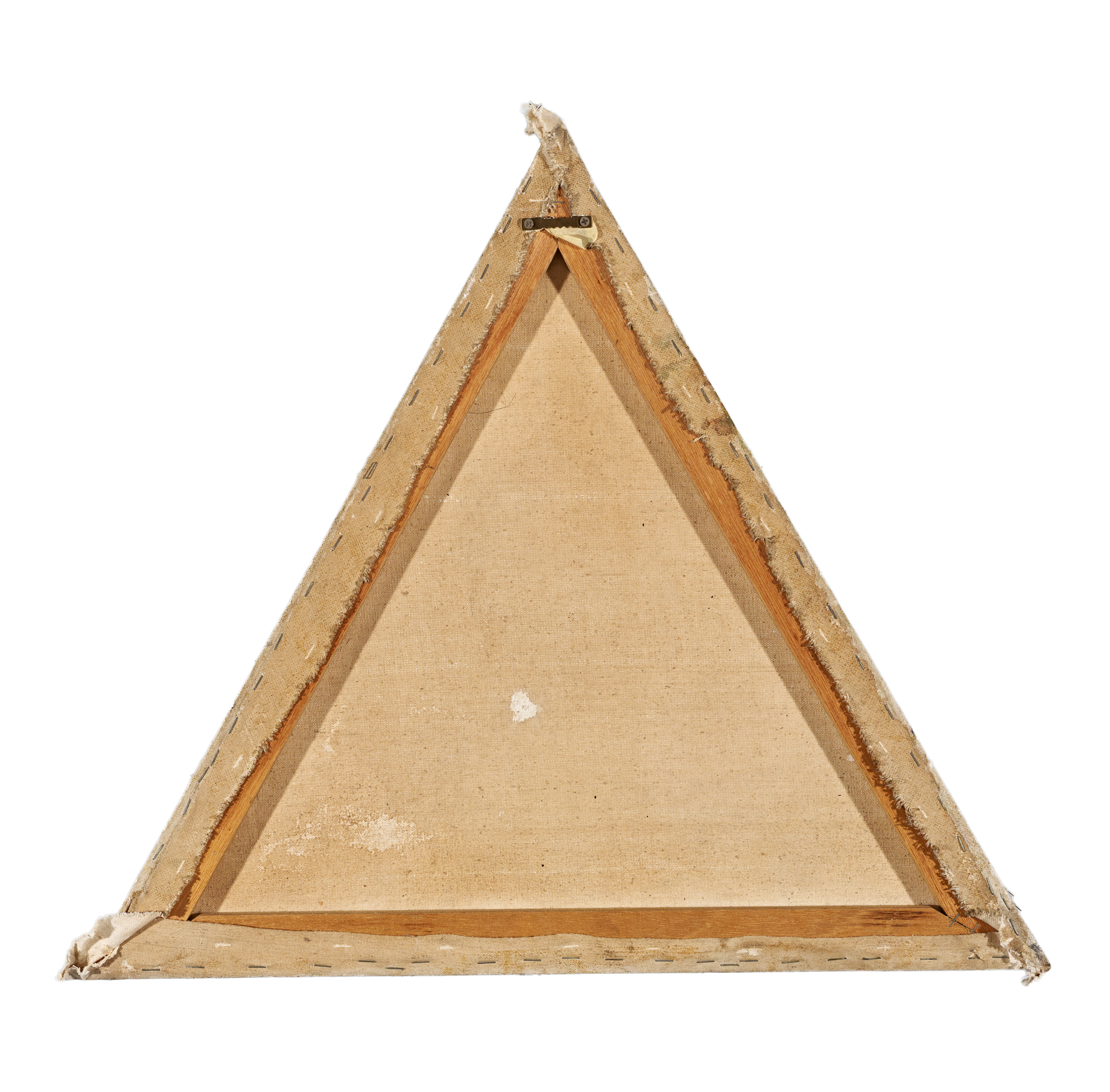 The painting is executed on its original canvas, stretched over a triangular wooden frame. The reverse shows age-related wear, small areas of canvas fraying, and minor losses along the edges, consistent with handling and storage over time. The surface exhibits scattered abrasions and paint texture typical of Selim’s expressive working method.
