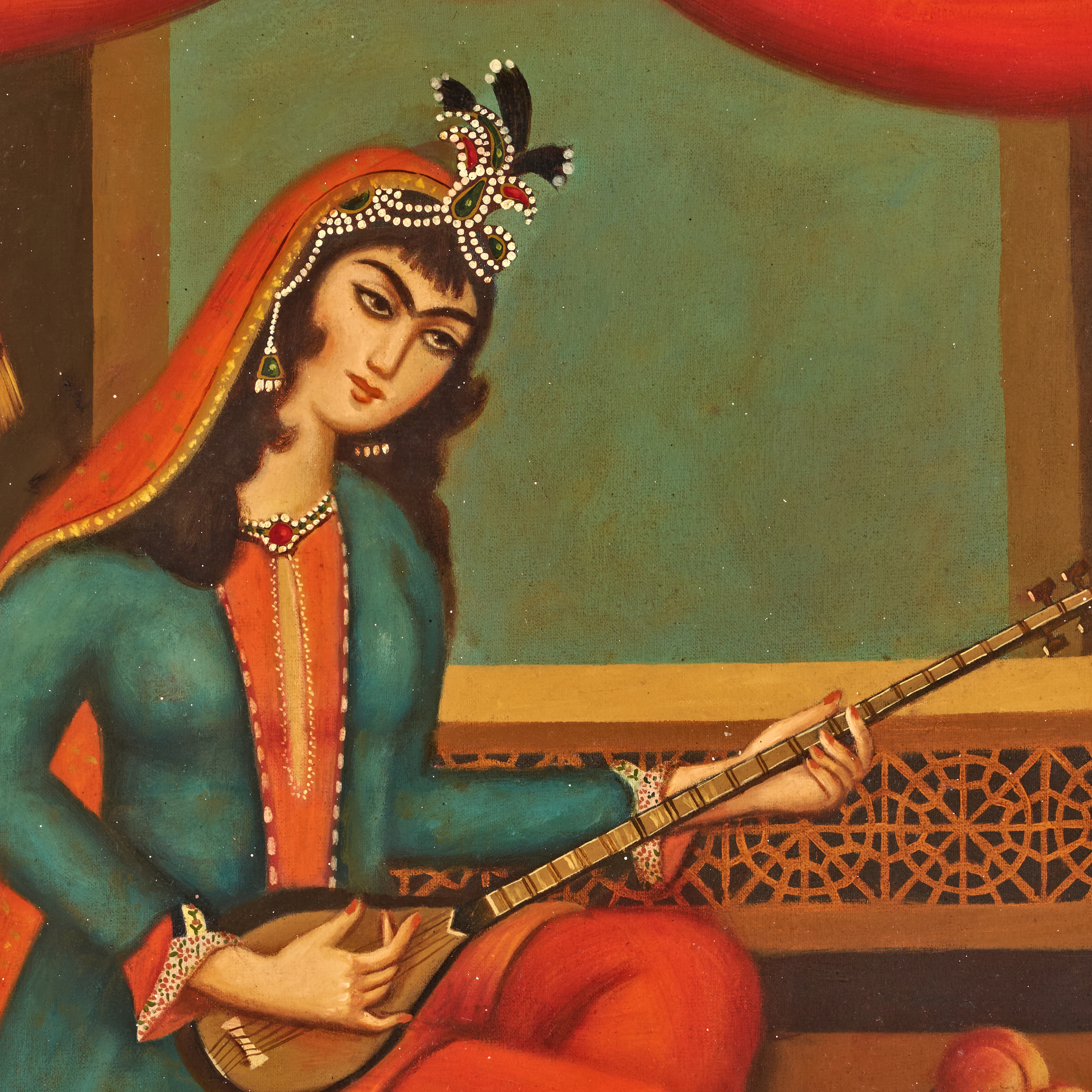 A vibrant Persian oil on canvas painting portraying a refined Qajar-era lady seated gracefully while playing a long-necked musical instrument, likely a setar or tanbur. Dressed in richly coloured garments of turquoise, red, and gold, she is adorned with an elaborate headdress embellished with jewels, pearls, and decorative plumes—hallmarks of Qajar courtly aesthetics. Her expressive features, arched brows, and stylised beauty reflect the distinctive artistic conventions of the period.