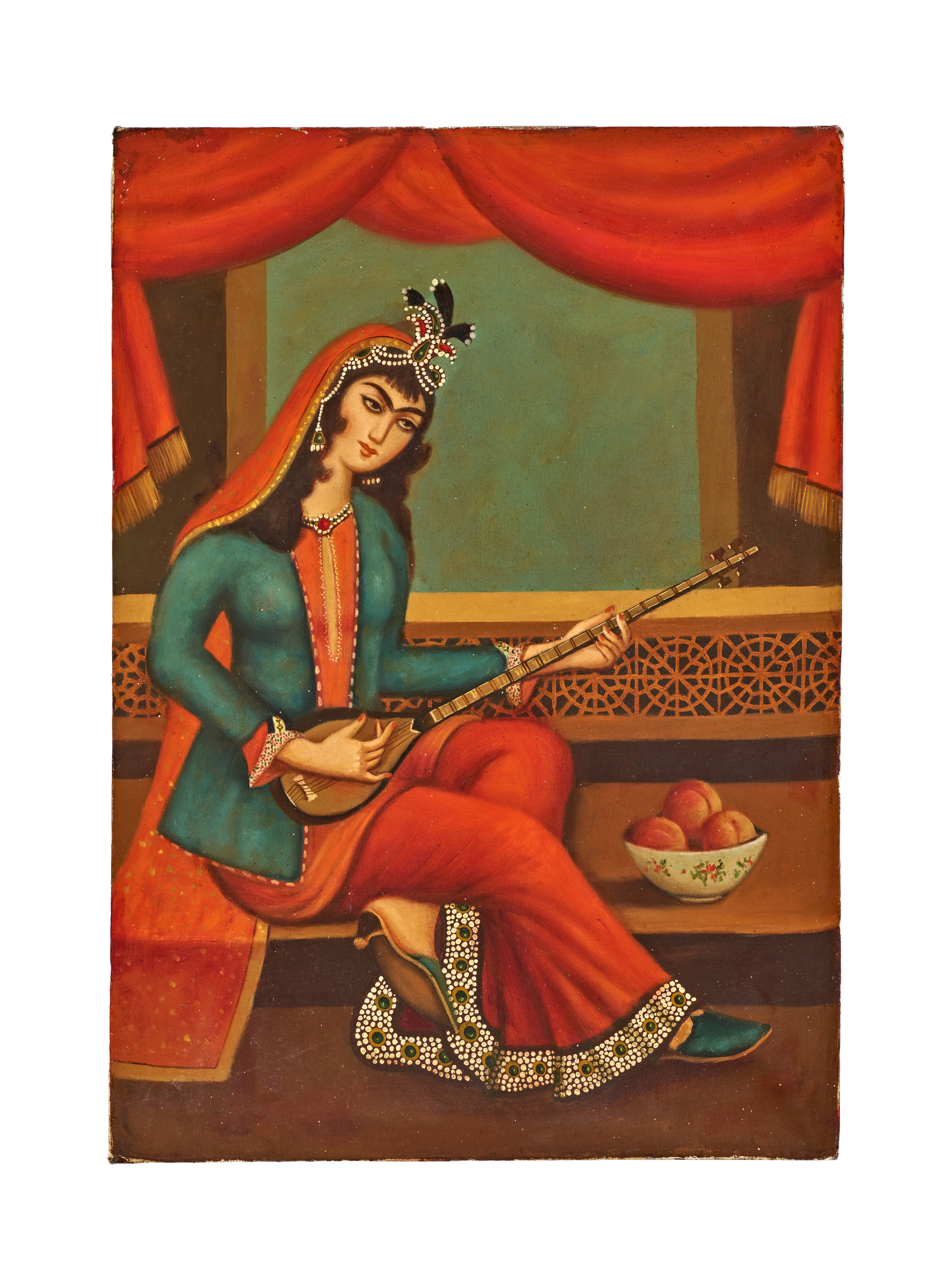 The scene is set within an intimate interior framed by heavy red drapery, with a low bench featuring intricate geometric latticework. A bowl of fruit placed beside her adds warmth and domestic charm to the composition. The artist employs bold colours and smooth, even brushwork to create a decorative and enchanting portrayal of leisure and music in a Qajar setting.