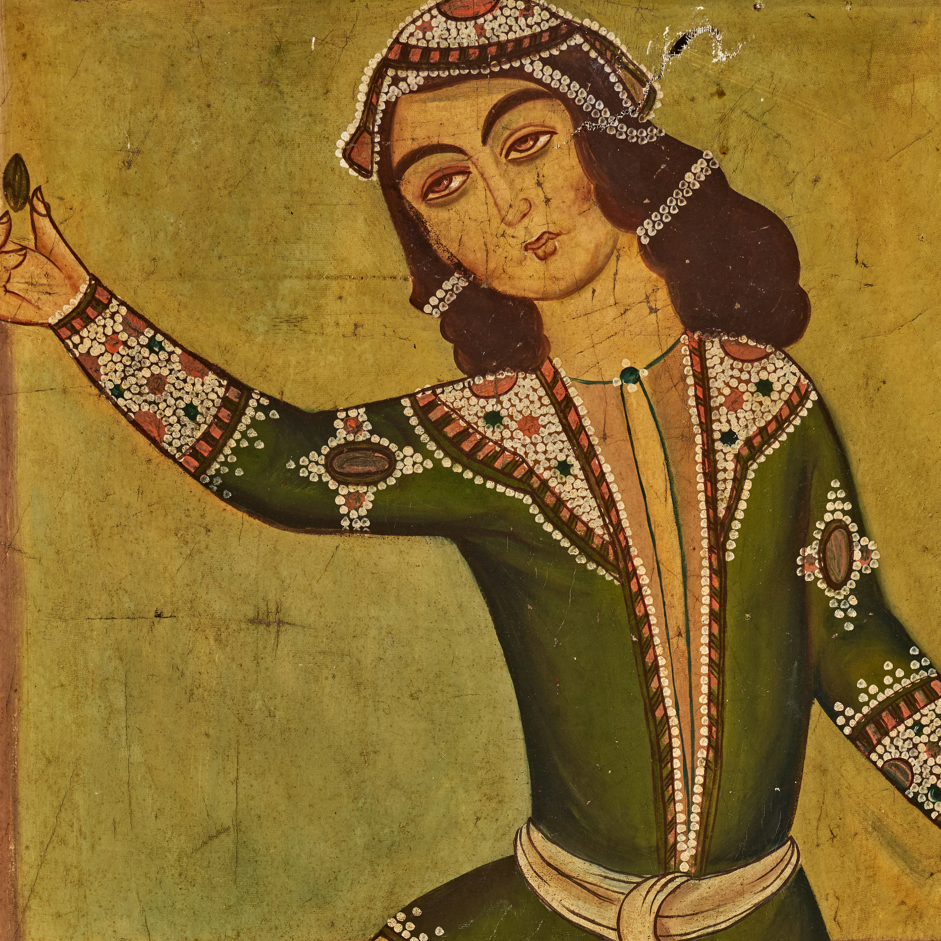 A decorative and evocative example of Qajar-period figurative painting, capturing the elegance and charm of courtly dance.