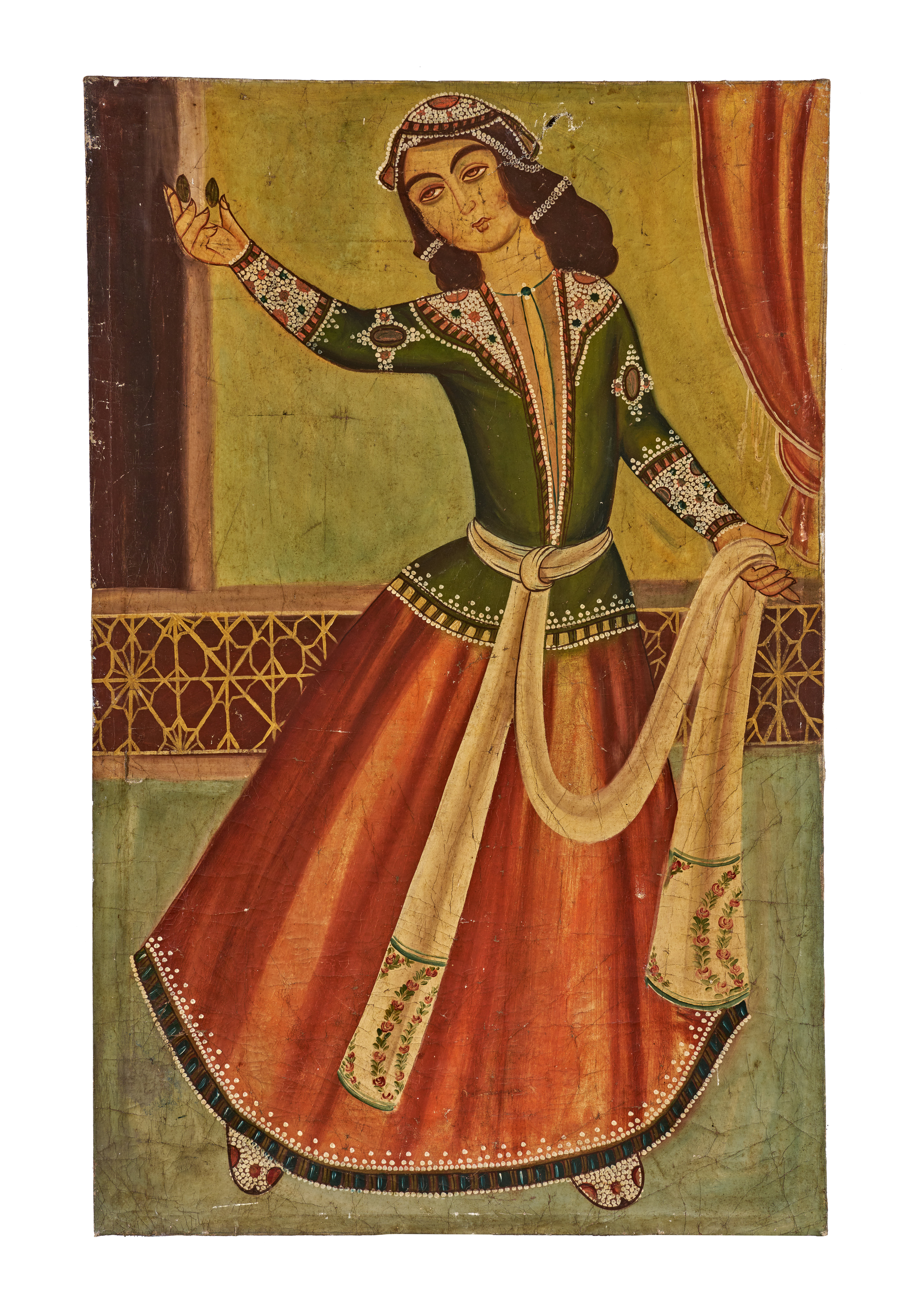 A charming Persian oil on canvas portraying a graceful Qajar-era dancing lady, richly adorned and captured in mid-movement. Wearing a vibrant ensemble of a deep green jacket and a flowing red skirt, she is embellished with characteristic Qajar jewellery—pearl-like beading, ornate cuffs, and a bejewelled headdress. Her expressive face, arched brows, and elongated eyes reflect the stylised beauty ideals of the period.