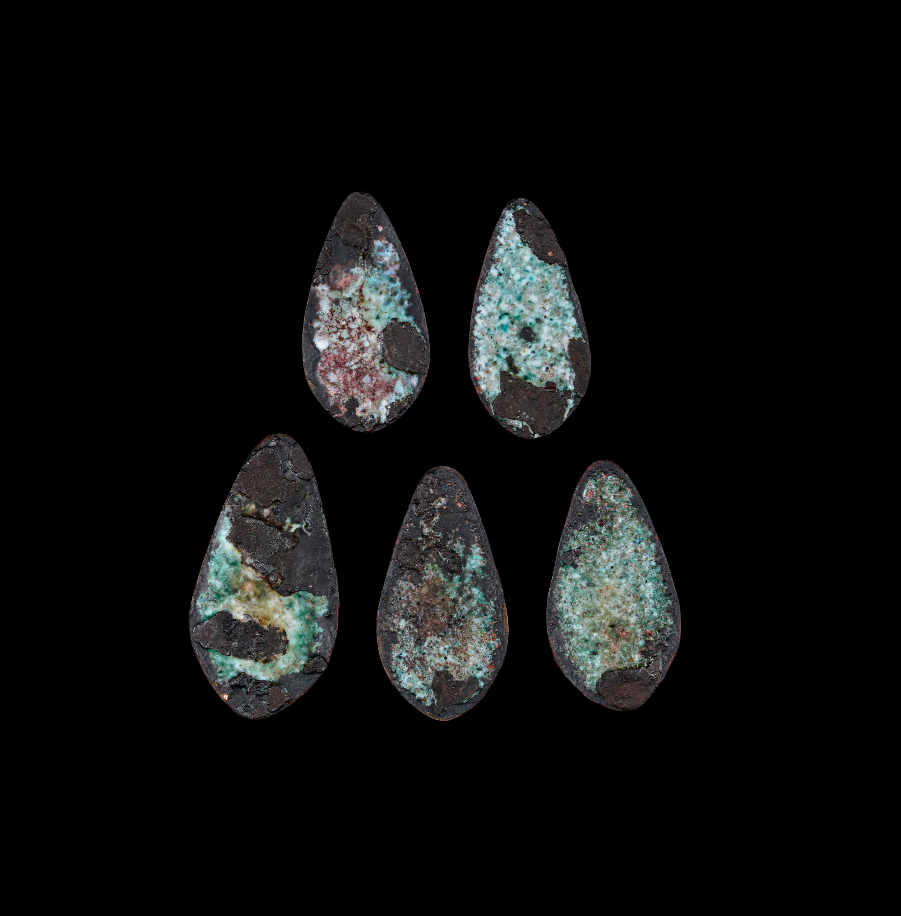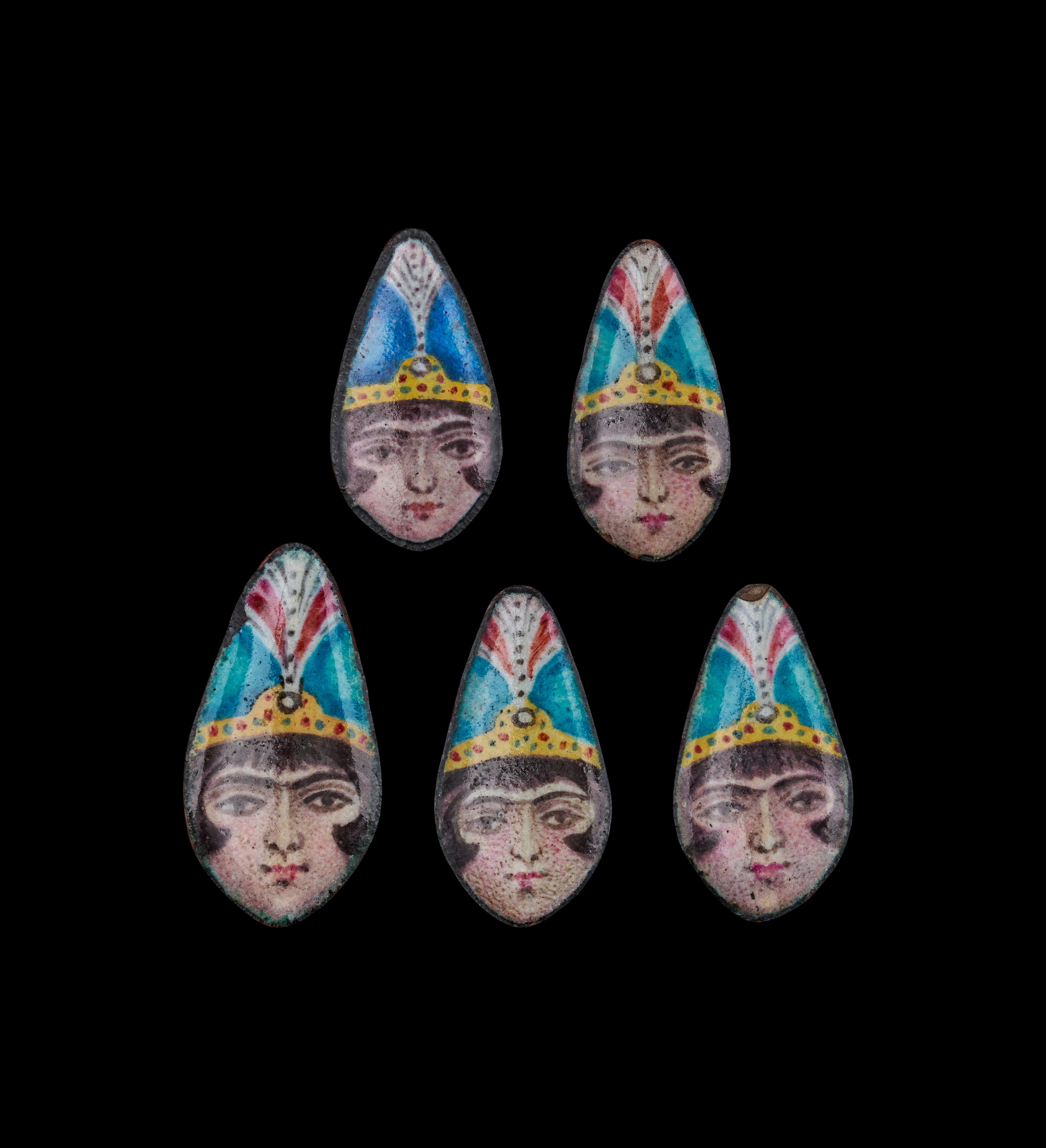 A group of five finely painted Qajar-period enamel ornaments, each executed in vibrant polychrome enamel over a copper base. The pieces are fashioned in an elongated droplet form, featuring delicately rendered female faces wearing tall, feathered headdresses typical of late Qajar decorative aesthetics. The expressive features—arched brows, almond-shaped eyes, and softly tinted cheeks—are characteristic of Persian enamel portraiture of the period.