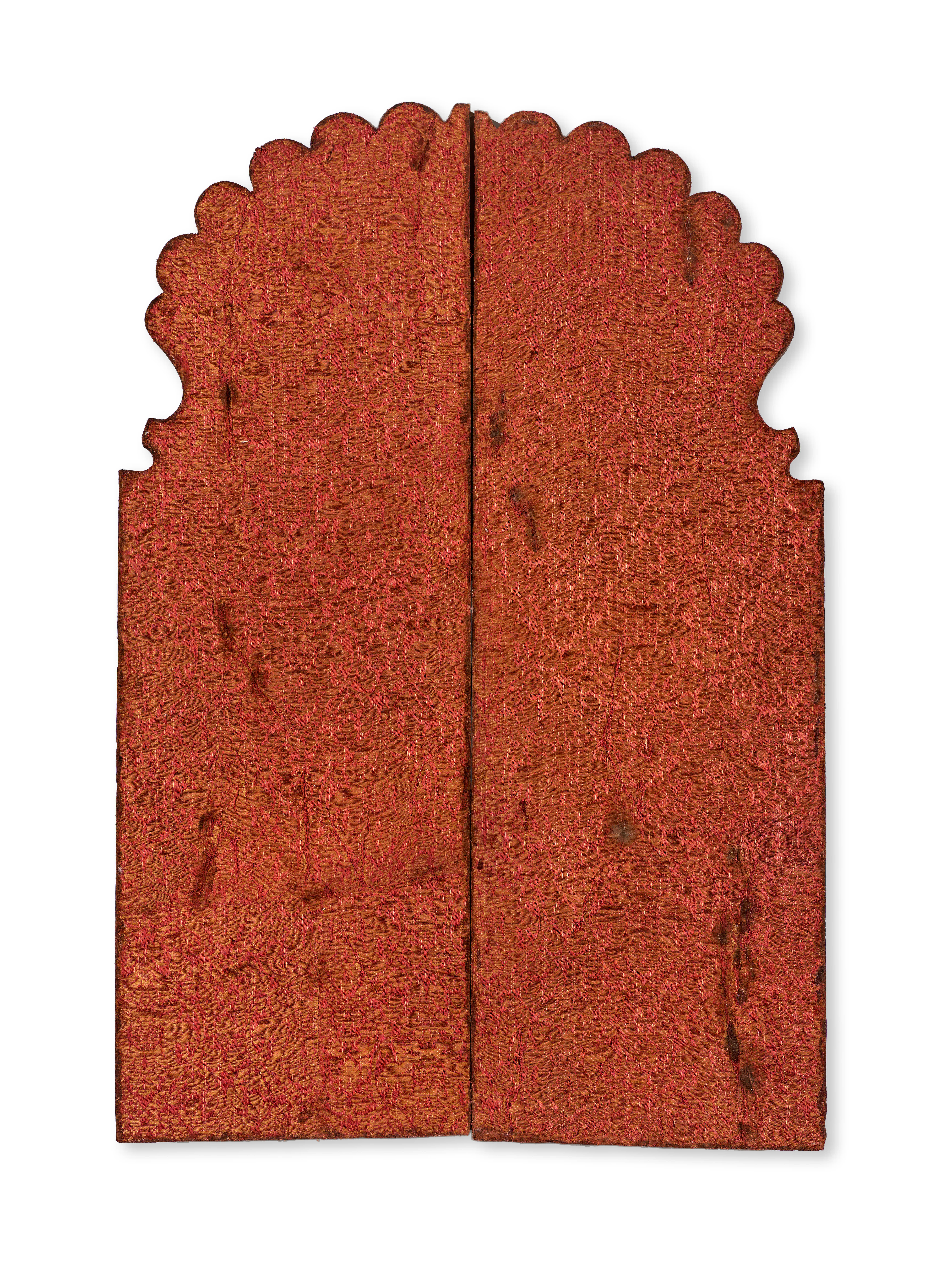 The doors retain their original metal fittings, including circular ring handles and decorative bosses, all patinated with age. The reverse is covered in a rich red textile lining with a subtle woven pattern, offering a striking contrast to the opalescent façade.