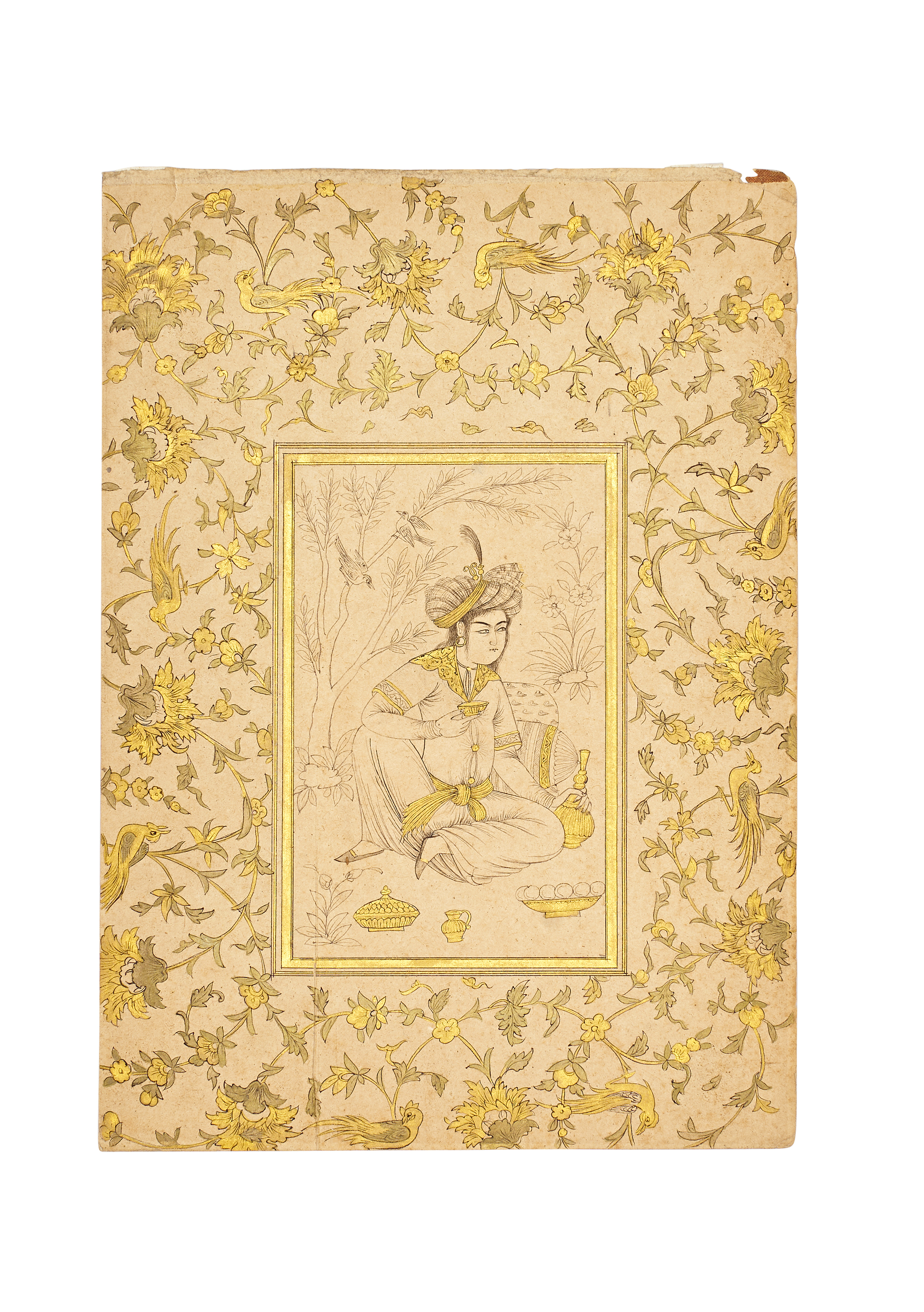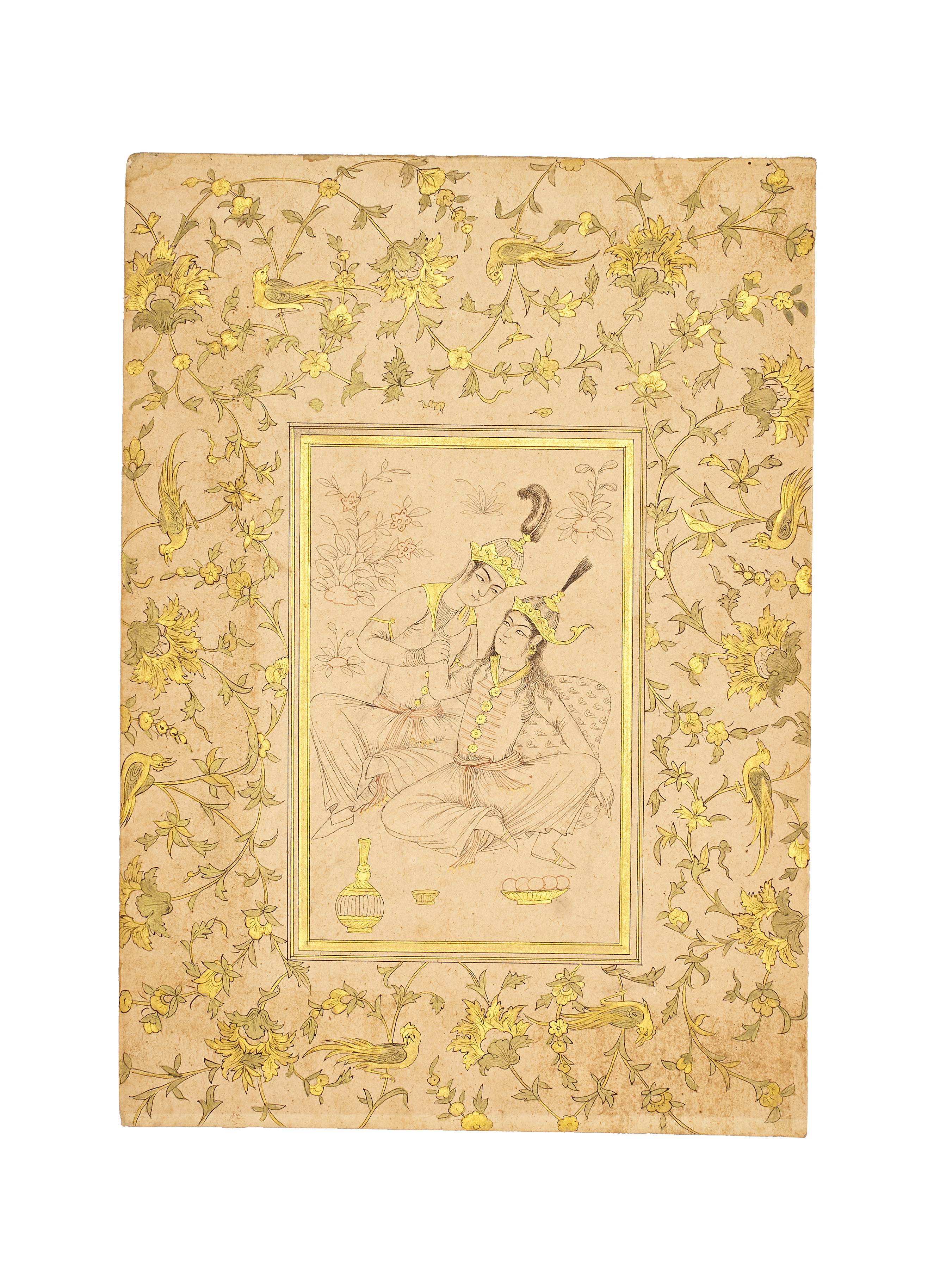 A fine pair of Persian miniature paintings executed in the Safavid revival style, depicting elegantly dressed courtly figures in intimate and contemplative poses. Each painting features delicate ink and gold detailing within finely illuminated floral and avian borders on paper, demonstrating exceptional control and harmony typical of 19th-century Qajar-era craftsmanship inspired by Safavid aesthetics.