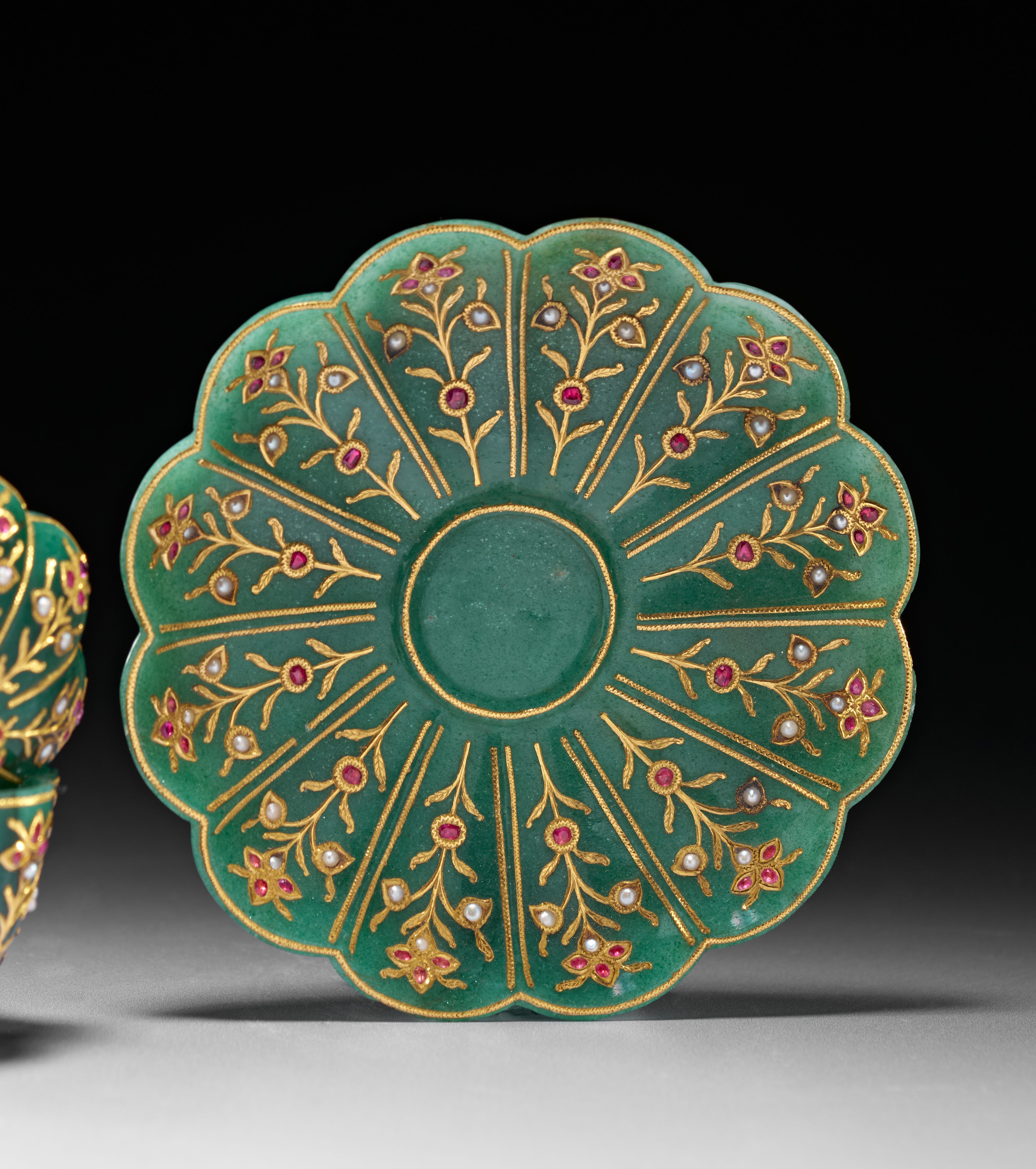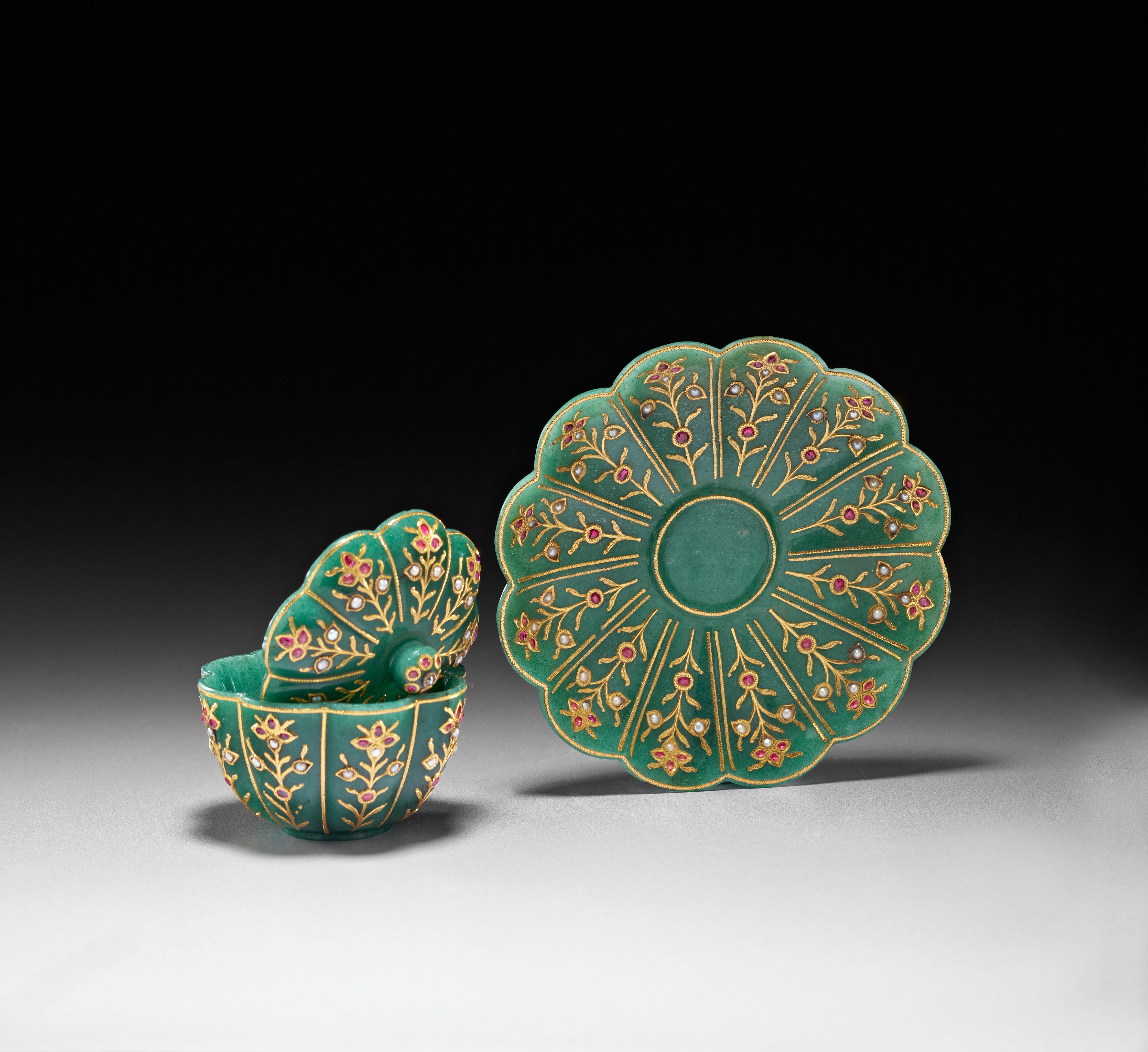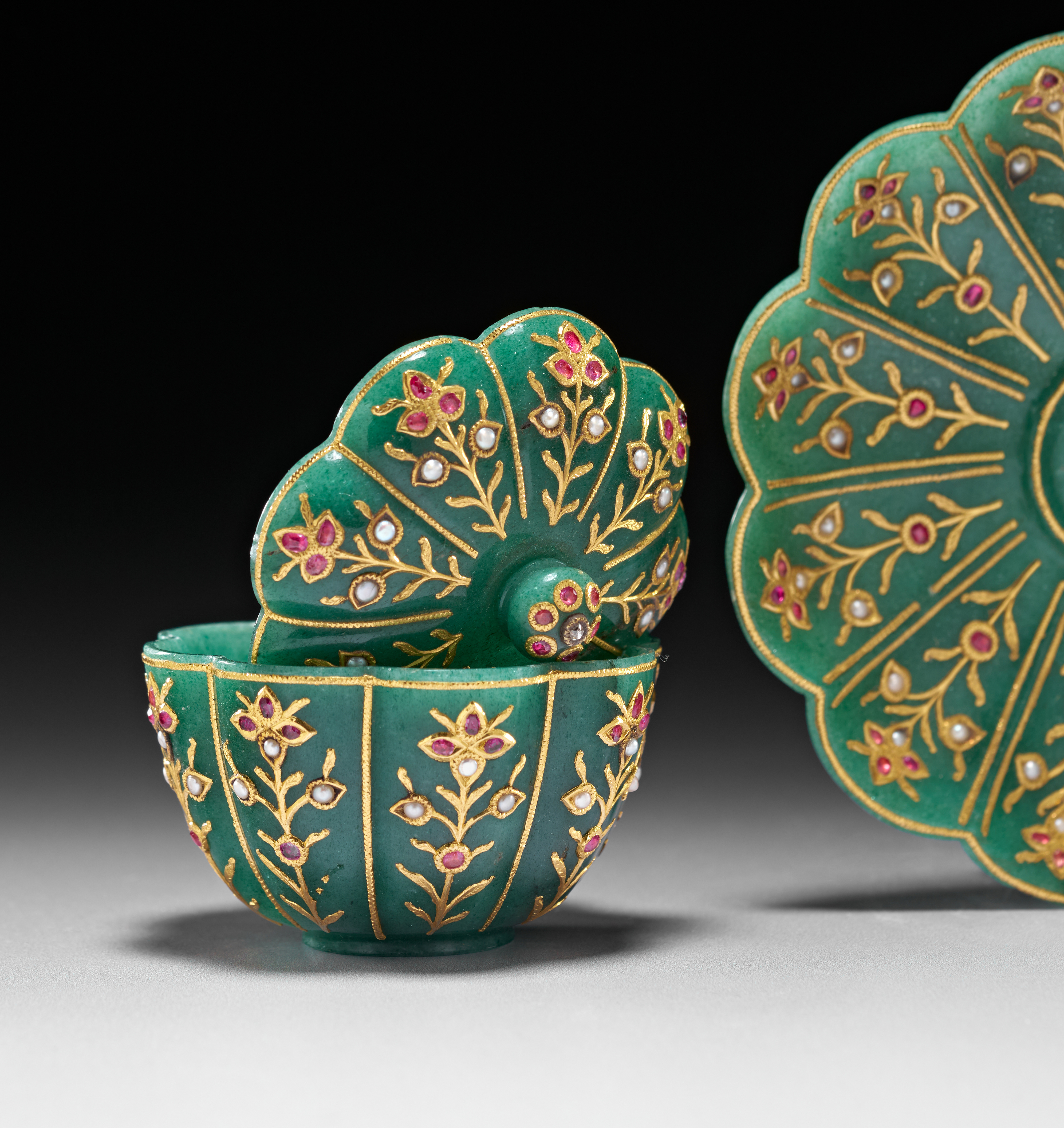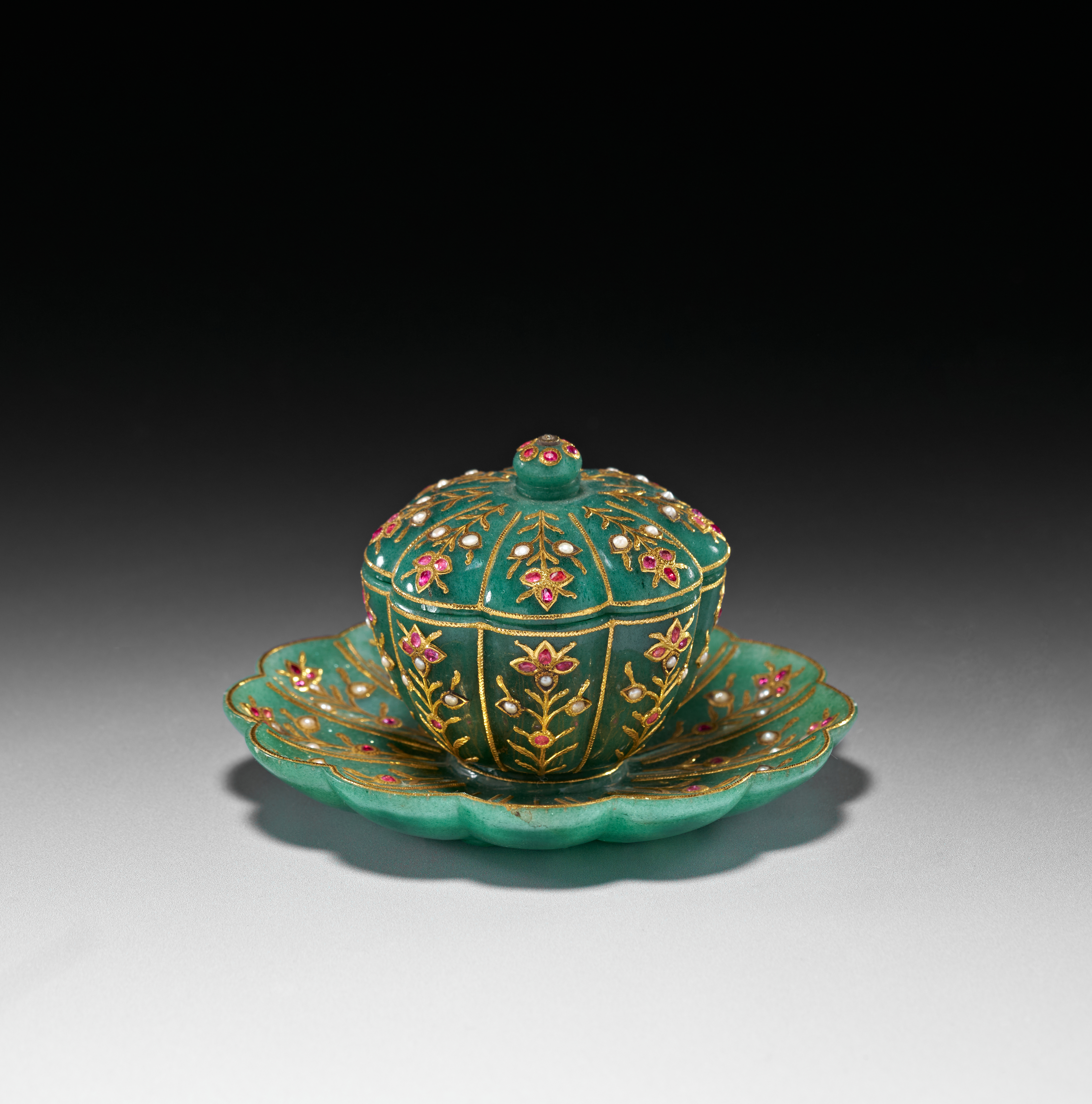 The accompanying saucer is carved in a scalloped form, also radiating with gold-inlaid floral motifs that complement the decoration on the bowl. The surface retains a smooth polish, allowing the verdant hue of the stone to contrast beautifully with the warm gold and vibrant gemstones.saucer 11.6cm. diameter. bowl and saucer 7.5cm. high (2)