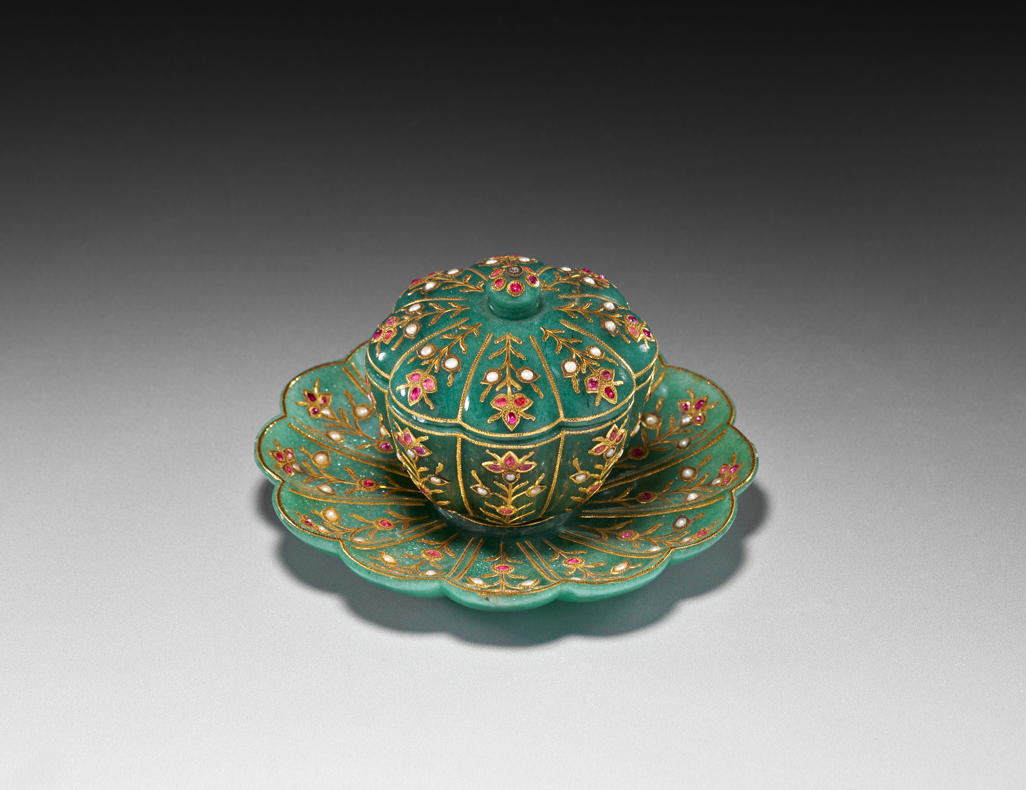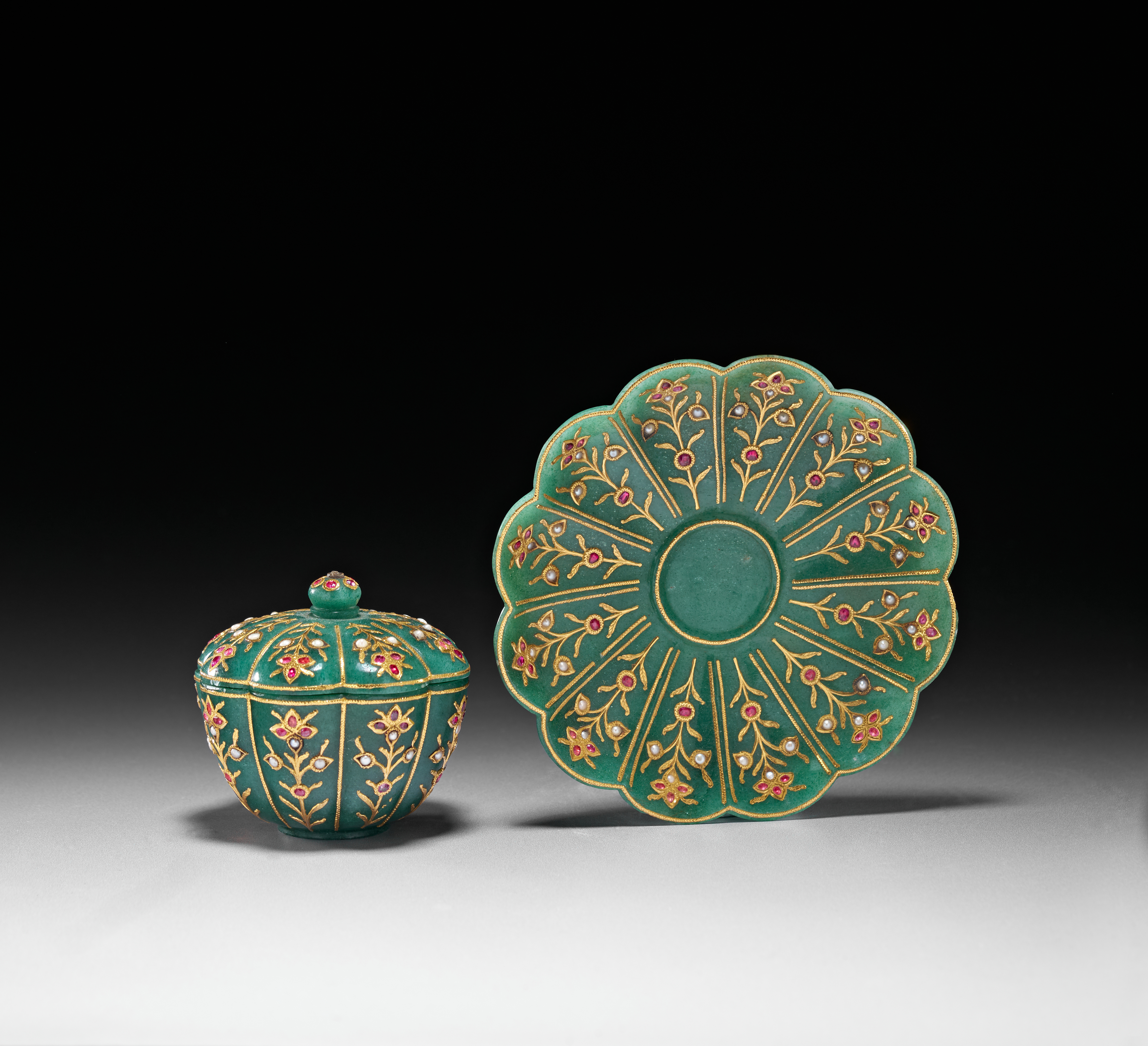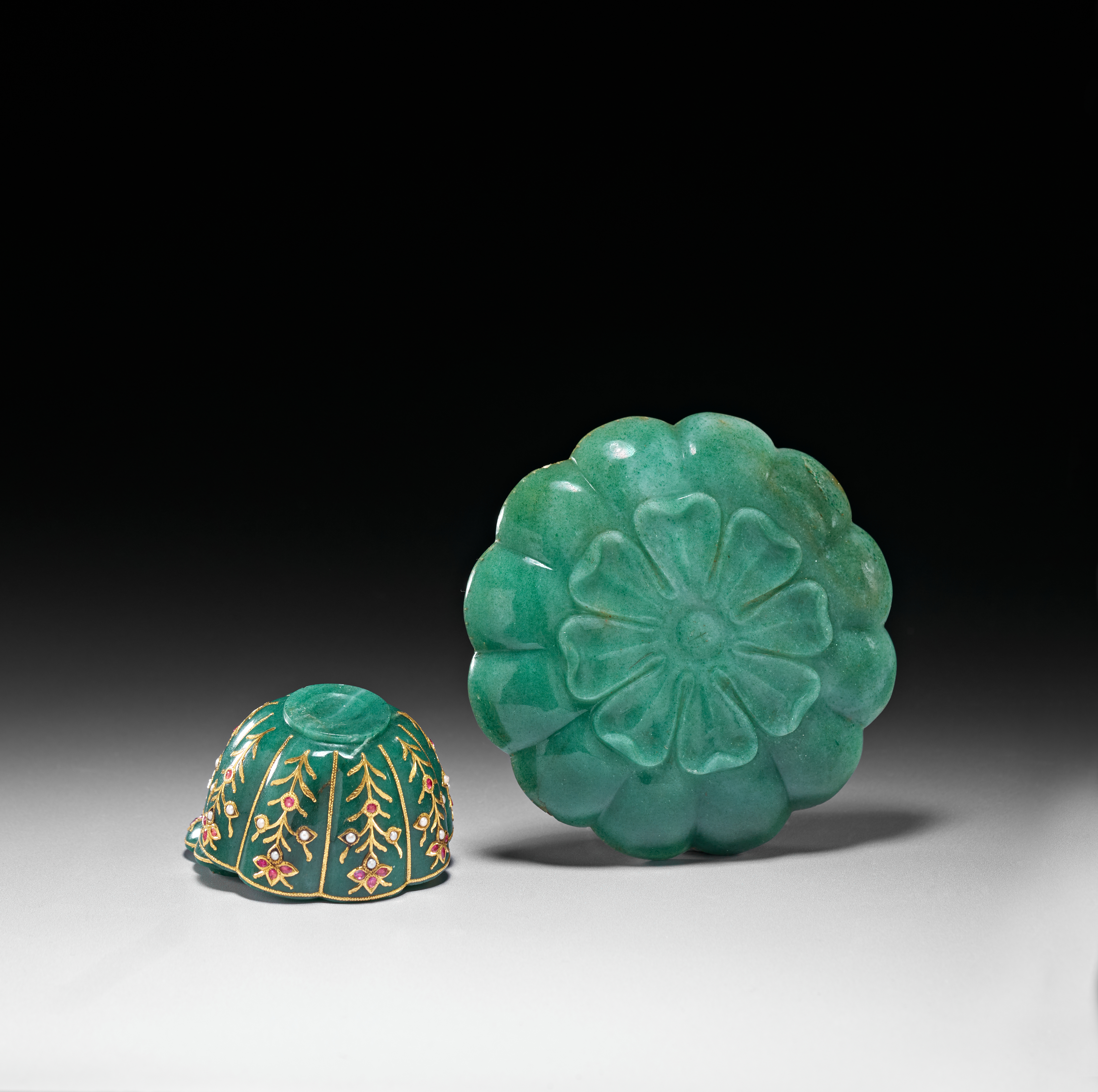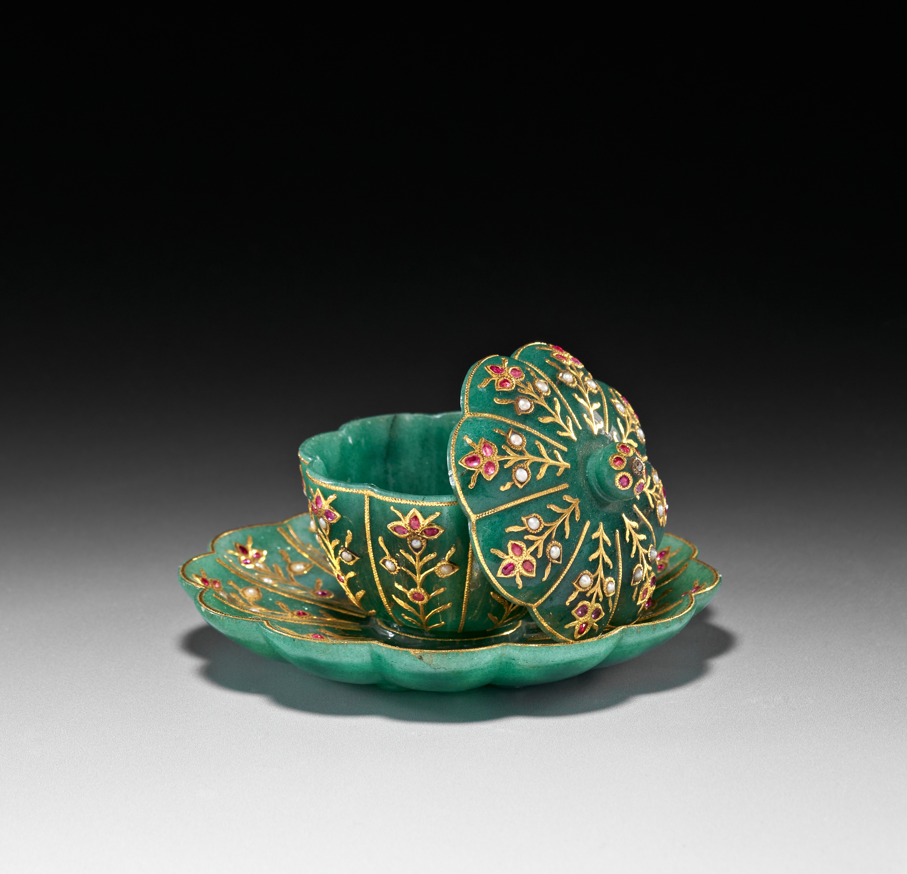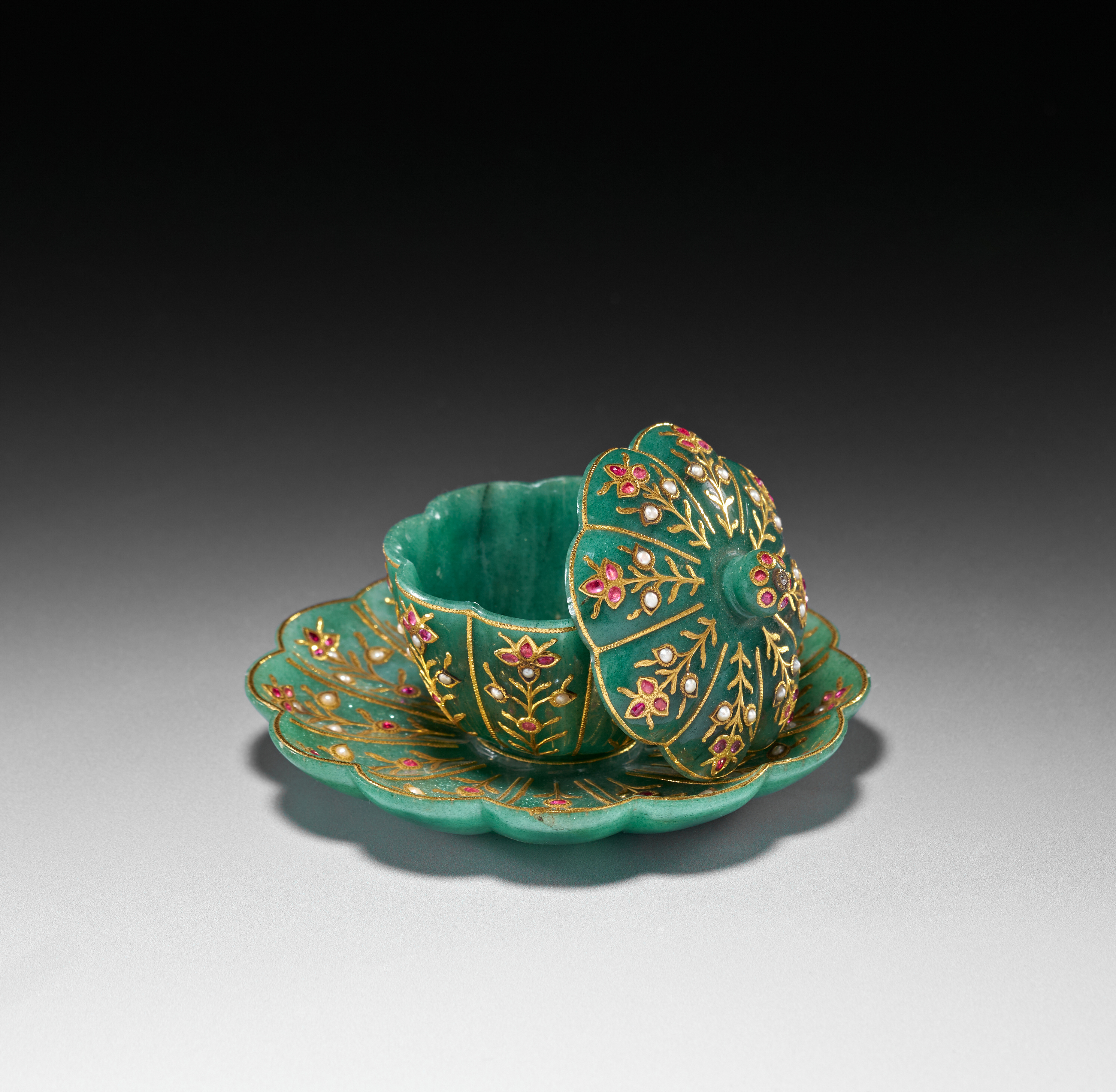 The accompanying saucer is carved in a scalloped form, also radiating with gold-inlaid floral motifs that complement the decoration on the bowl. The surface retains a smooth polish, allowing the verdant hue of the stone to contrast beautifully with the warm gold and vibrant gemstones.saucer 11.6cm. diameter. bowl and saucer 7.5cm. high (2)