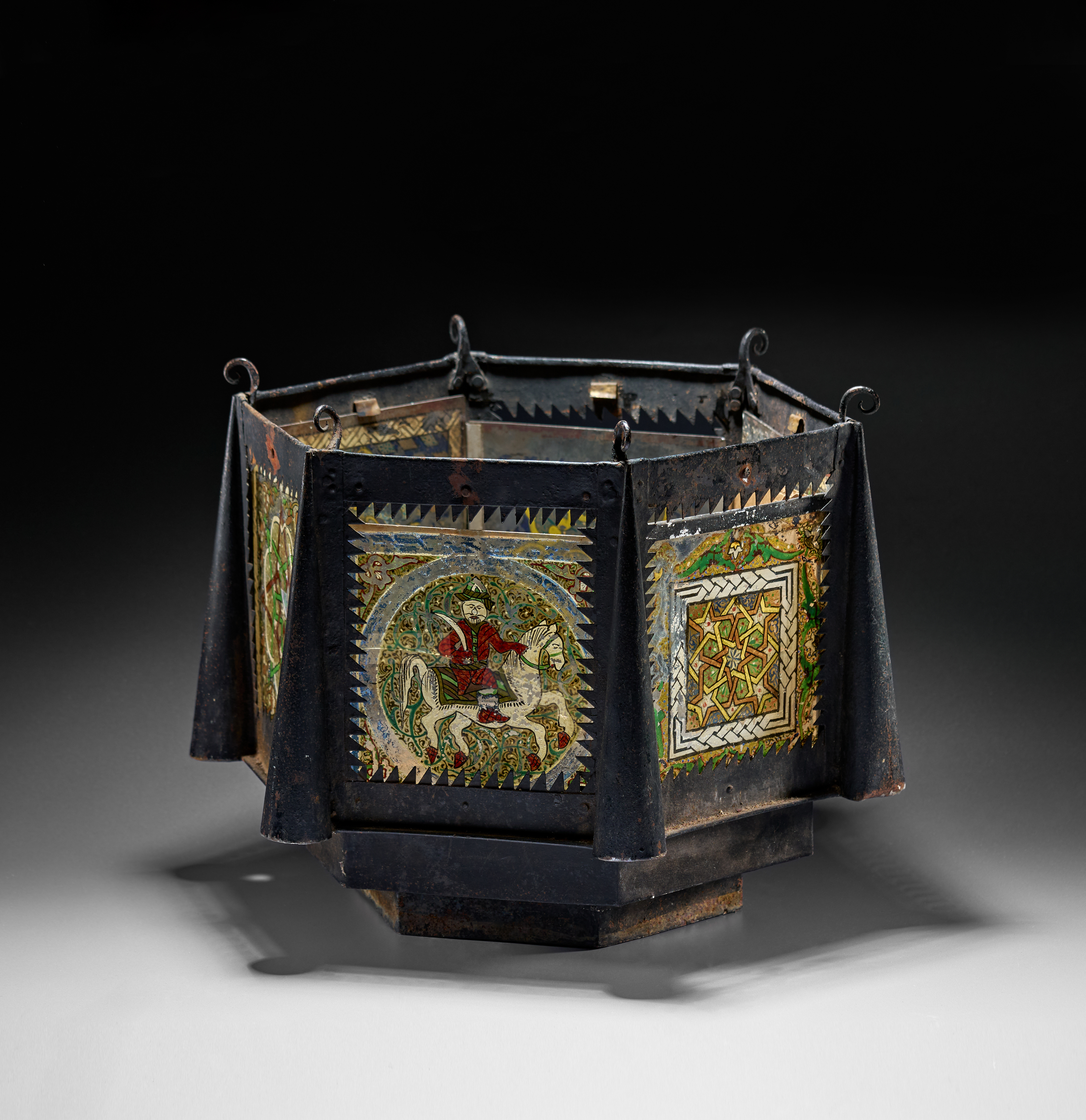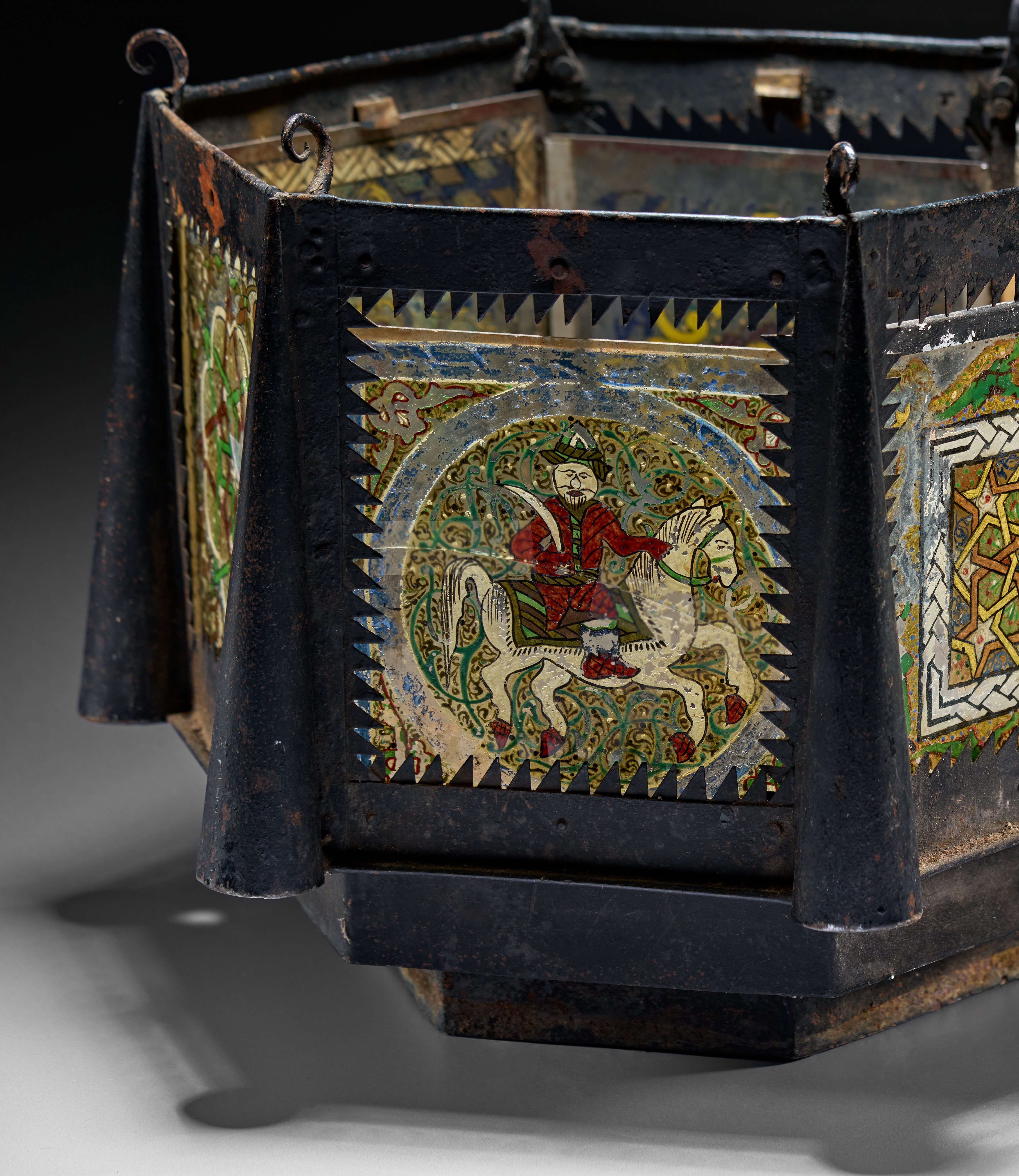 Drawing inspiration from 12th–13th century Ayyubid aesthetics, the lamp exhibits an intricate interplay of Islamic geometric patterns, finely pierced woodwork, and colored glasswork that illuminates with a soft, jewel-like glow. One panel features the figure of a nobleman or dignitary, rendered in silhouette and bordered by vegetal arabesques — a rare iconographic inclusion that may reflect local devotional or commemorative practices. The design evokes the historic grandeur of Mamluk and Ayyubid-era mosque furnishings while showcasing the revivalist craftsmanship of the late Ottoman period, particularly in Egypt or Greater Syria. The blend of wood, metal, and glass elements reveals the multicultural influences and refined artistry characteristic of this transitional era.