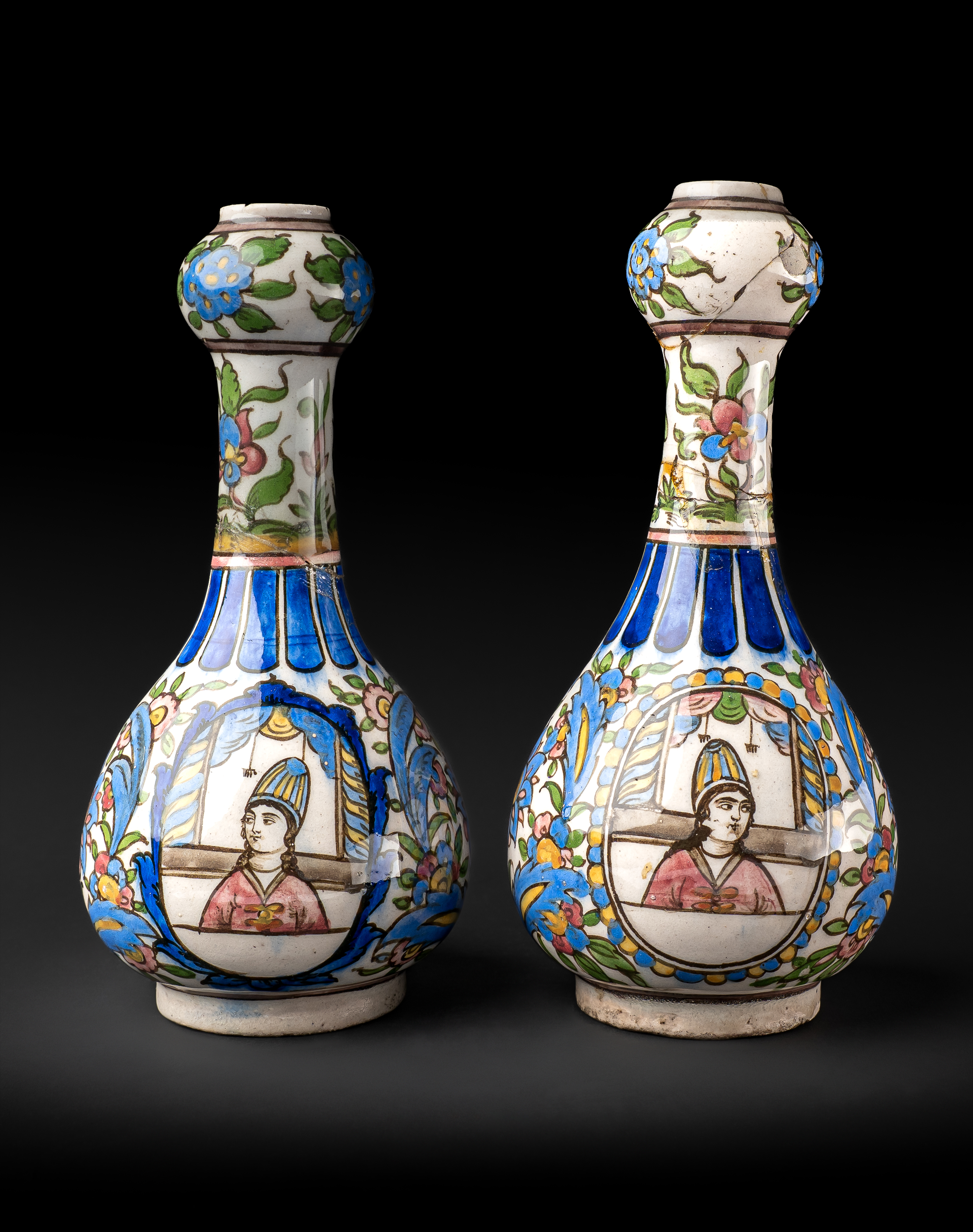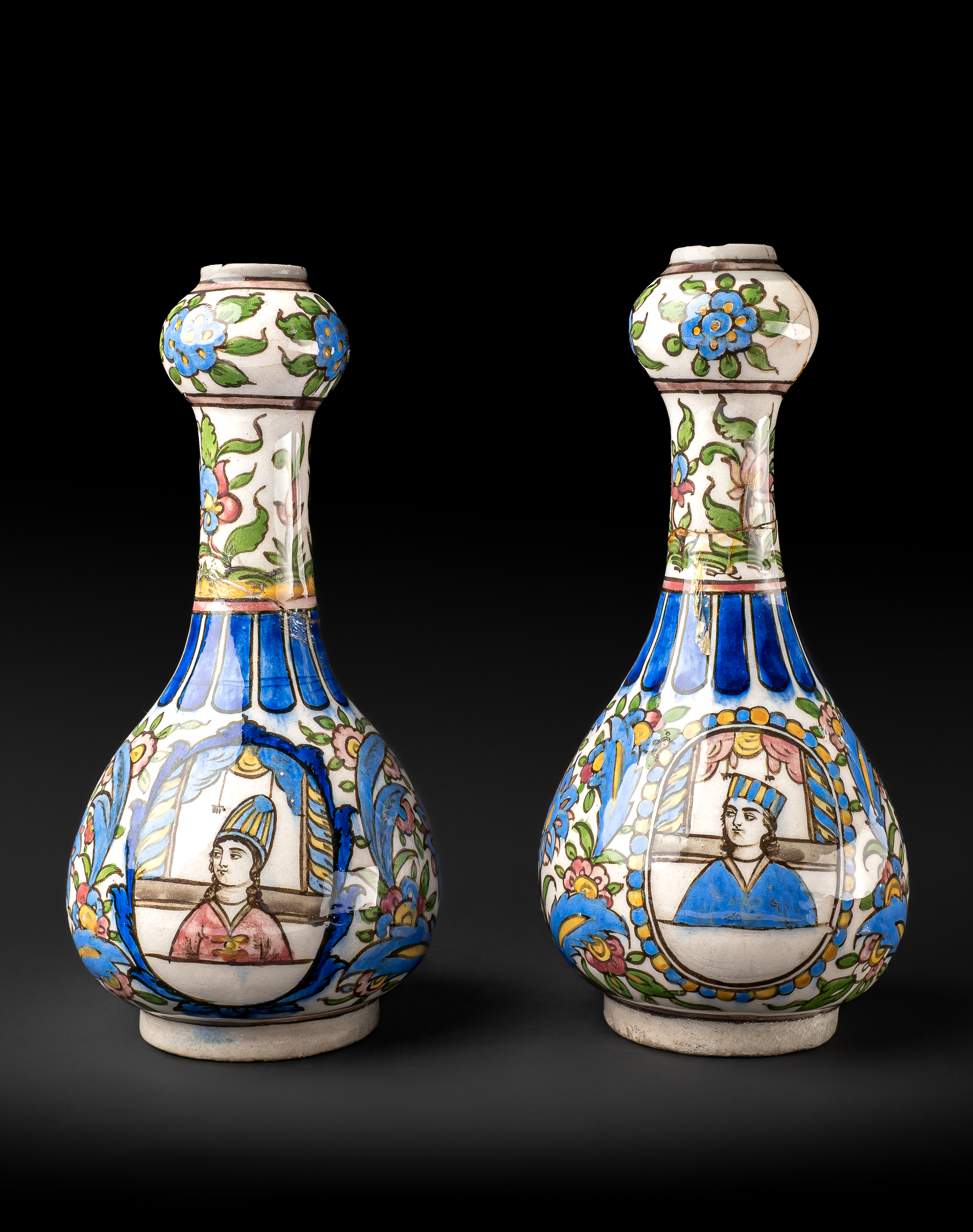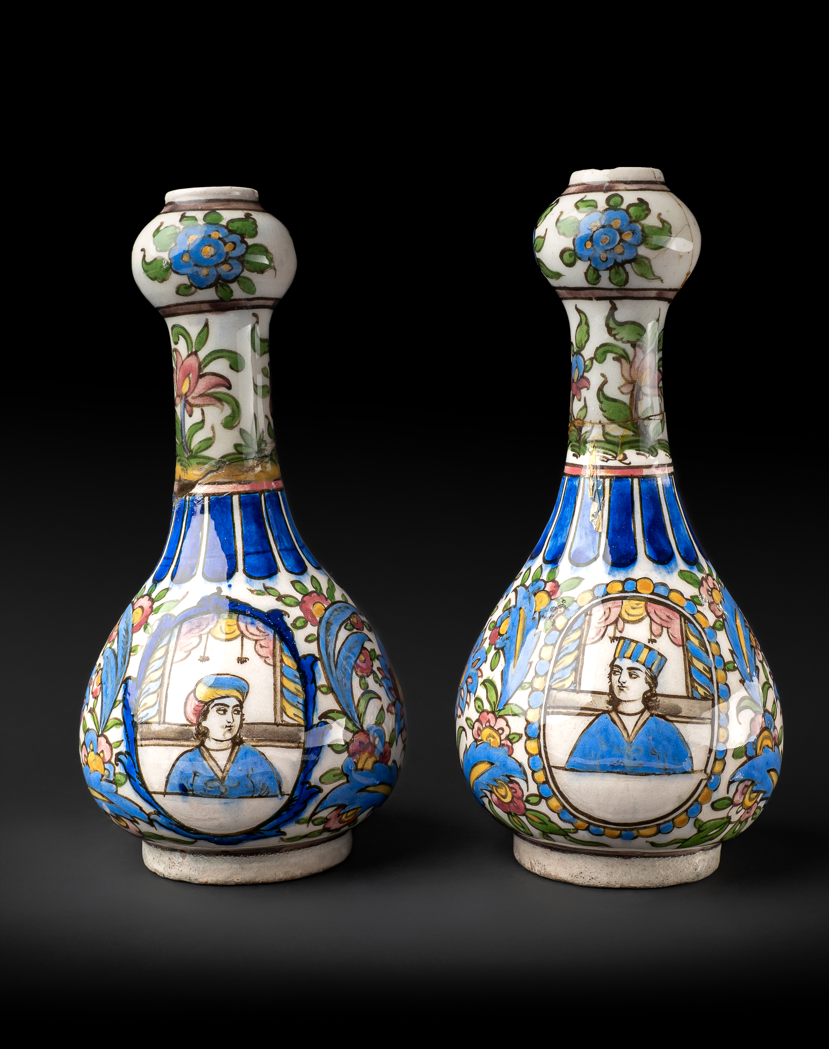 Of baluster form with tapering necks and rounded knops, painted in polychrome enamels beneath a clear glaze. The bodies alternate between oval portrait medallions of courtly figures and panels of floral sprays, framed by bold cobalt-blue scrolls. The necks are decorated with blossoms and foliage. Typical of Tehran production in the Qajar period.