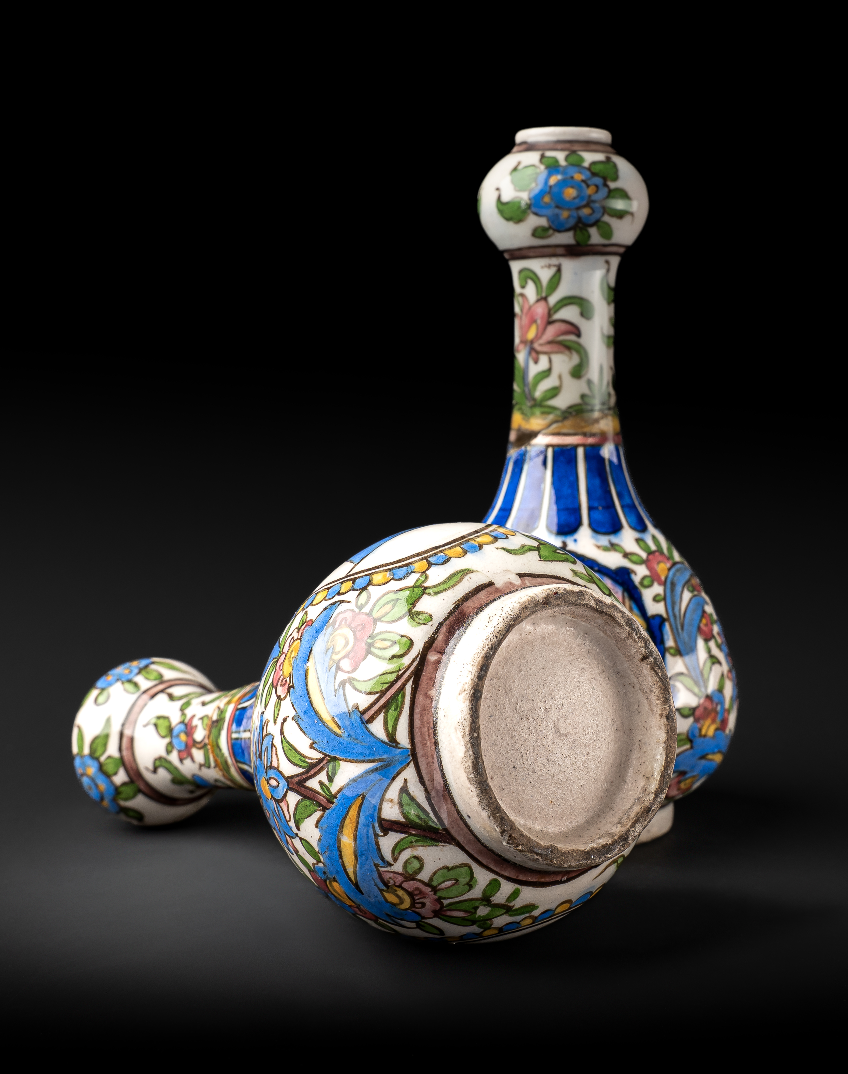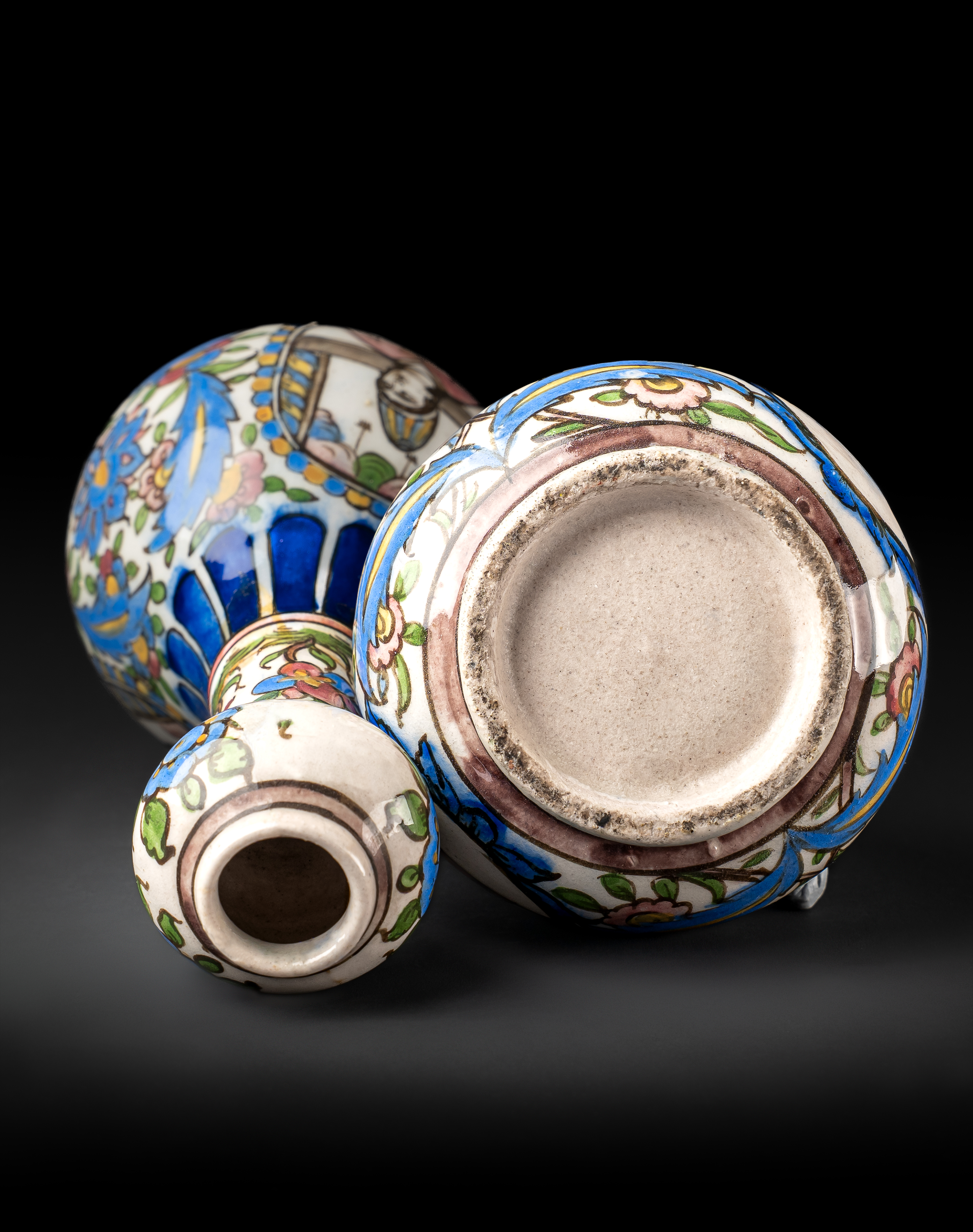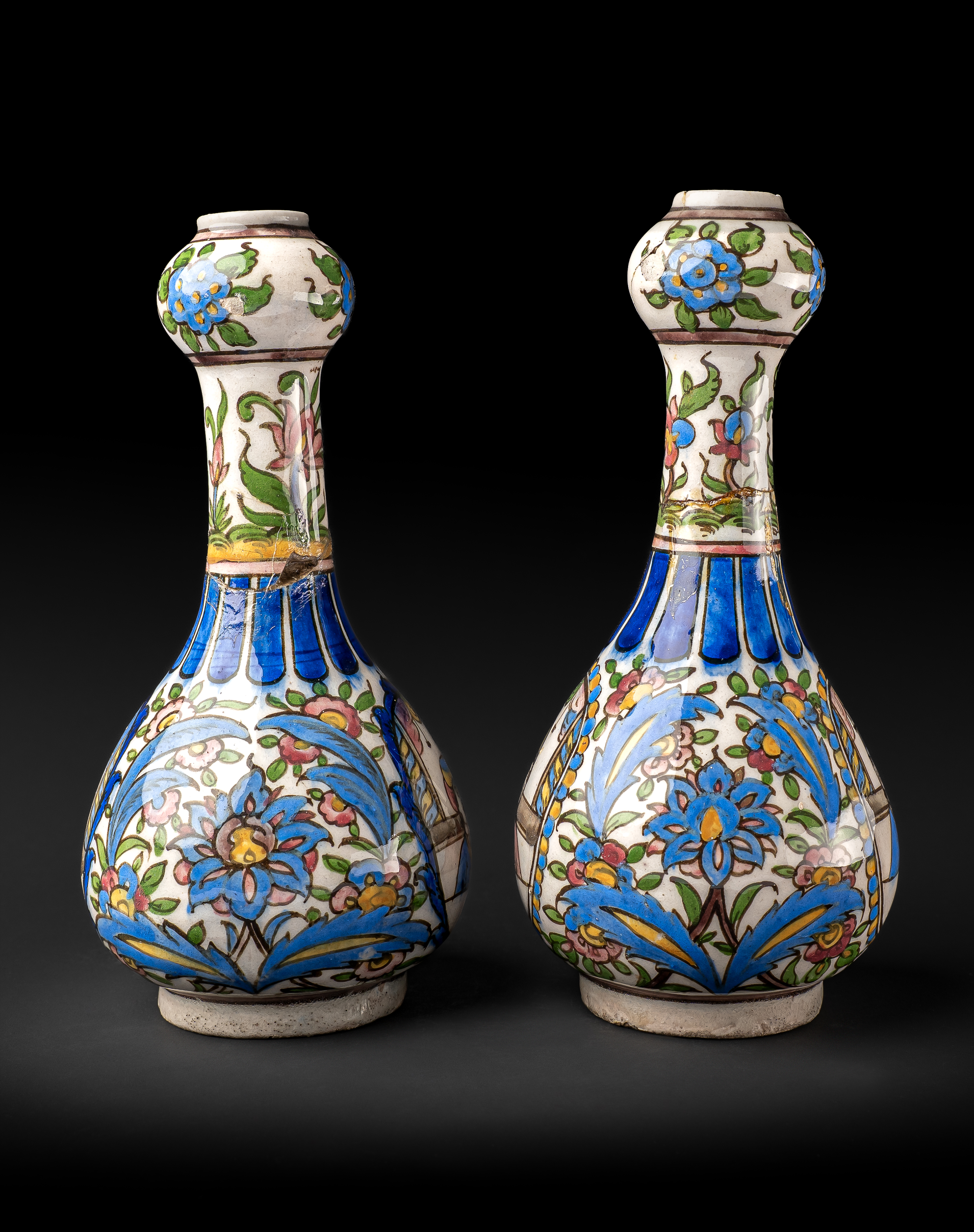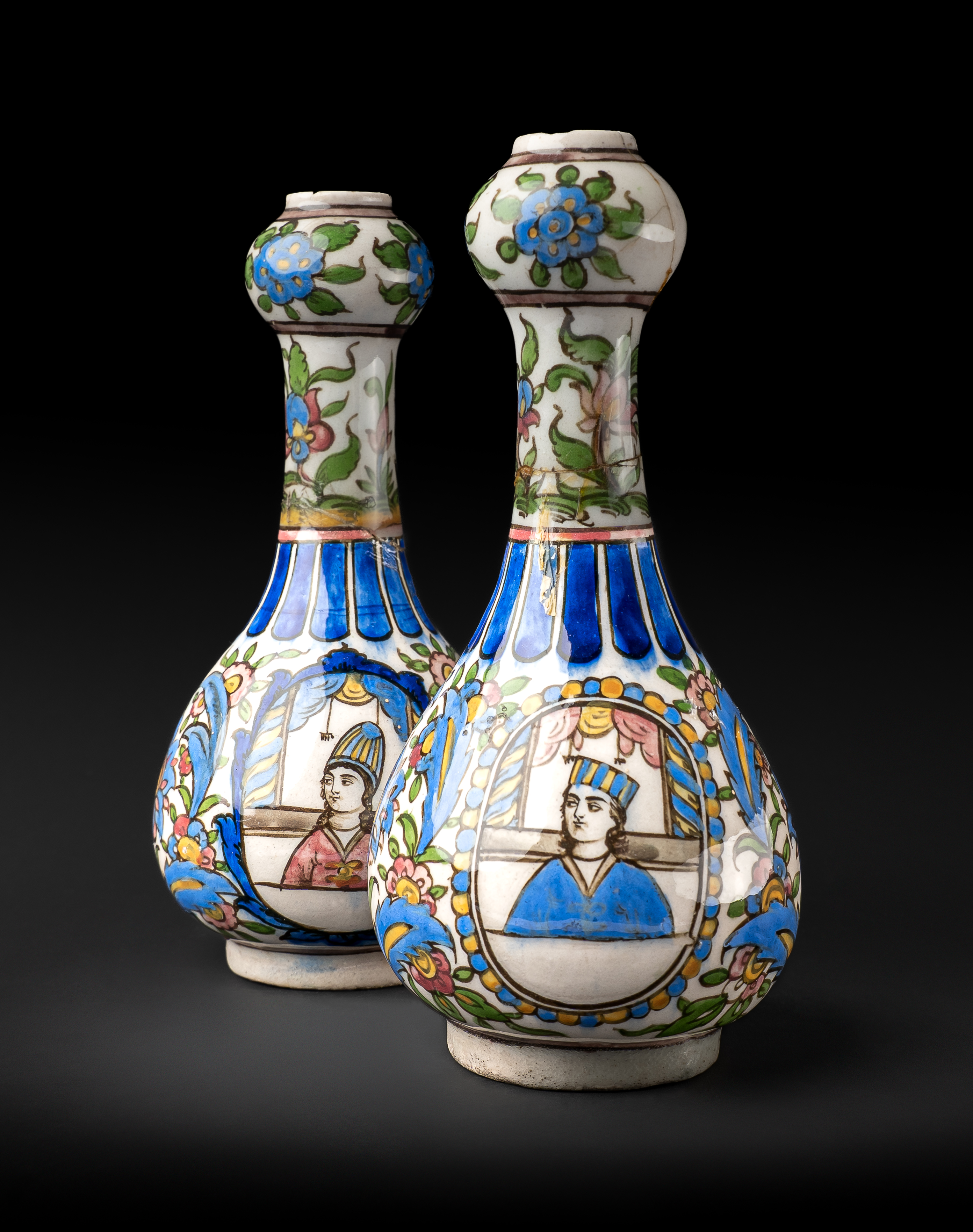 Of baluster form with tapering necks and rounded knops, painted in polychrome enamels beneath a clear glaze. The bodies alternate between oval portrait medallions of courtly figures and panels of floral sprays, framed by bold cobalt-blue scrolls. The necks are decorated with blossoms and foliage. Typical of Tehran production in the Qajar period.