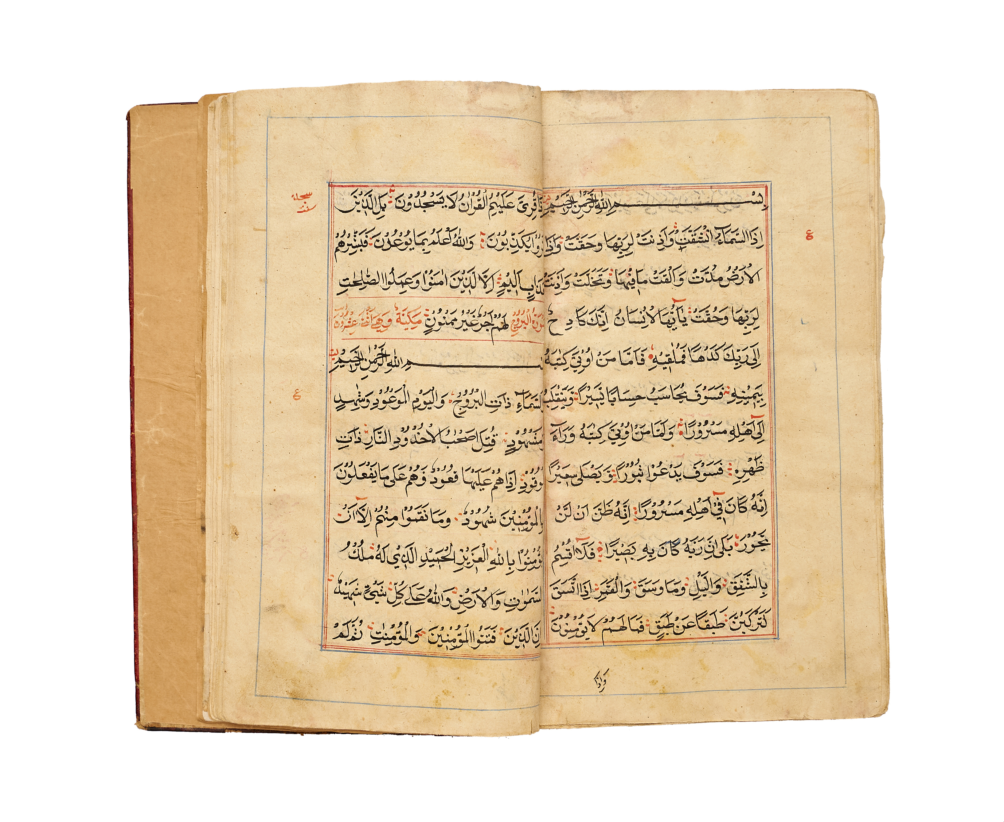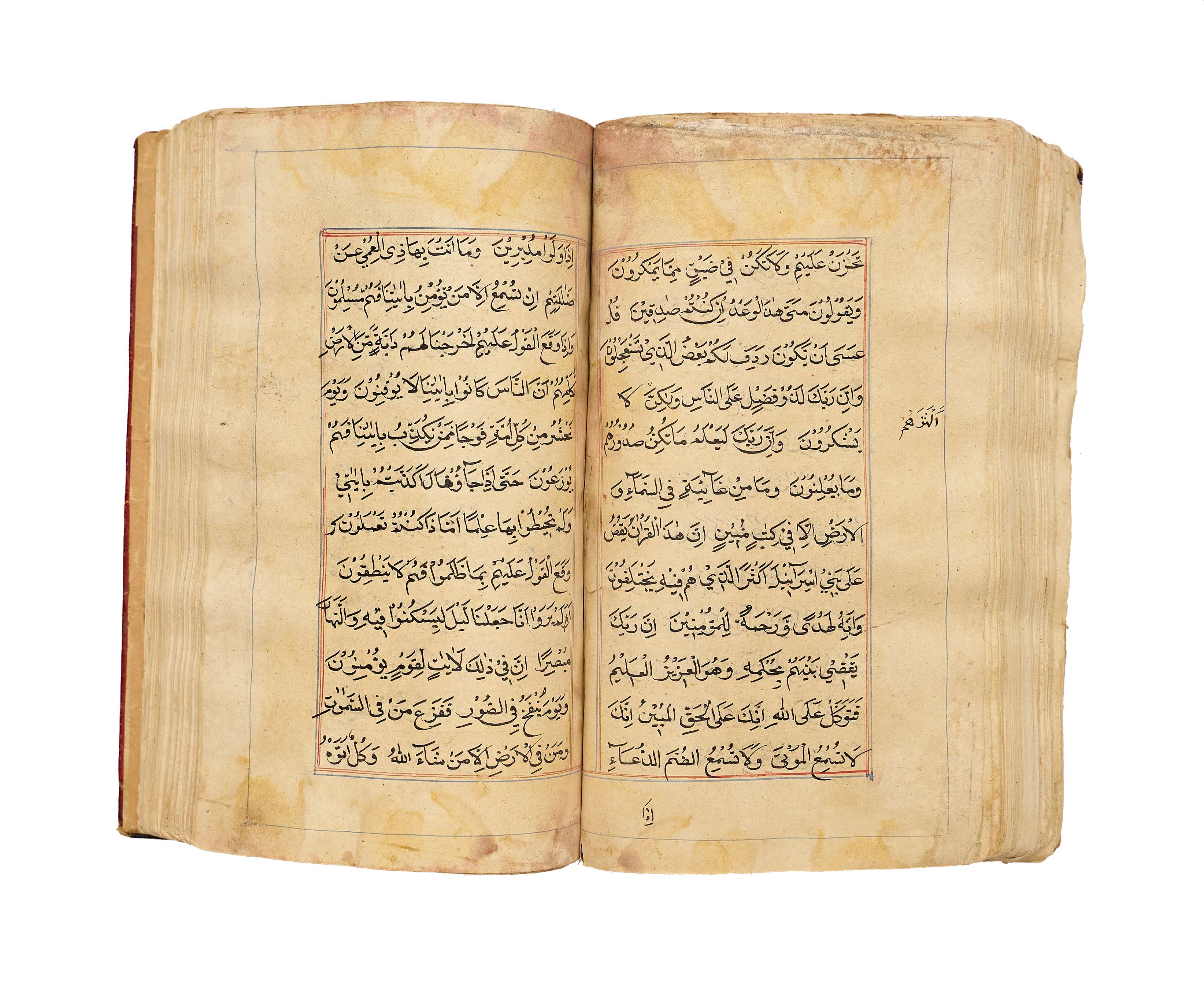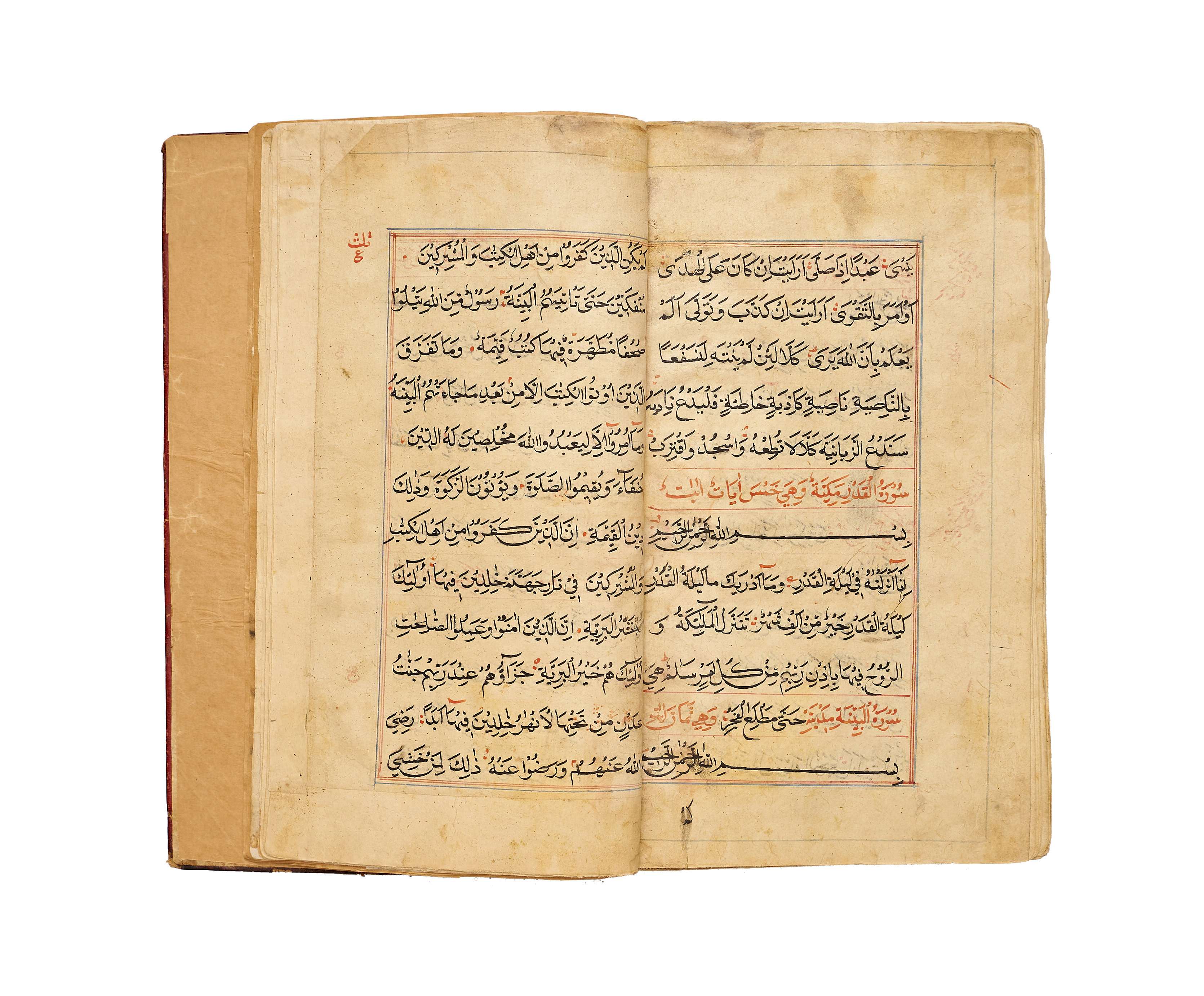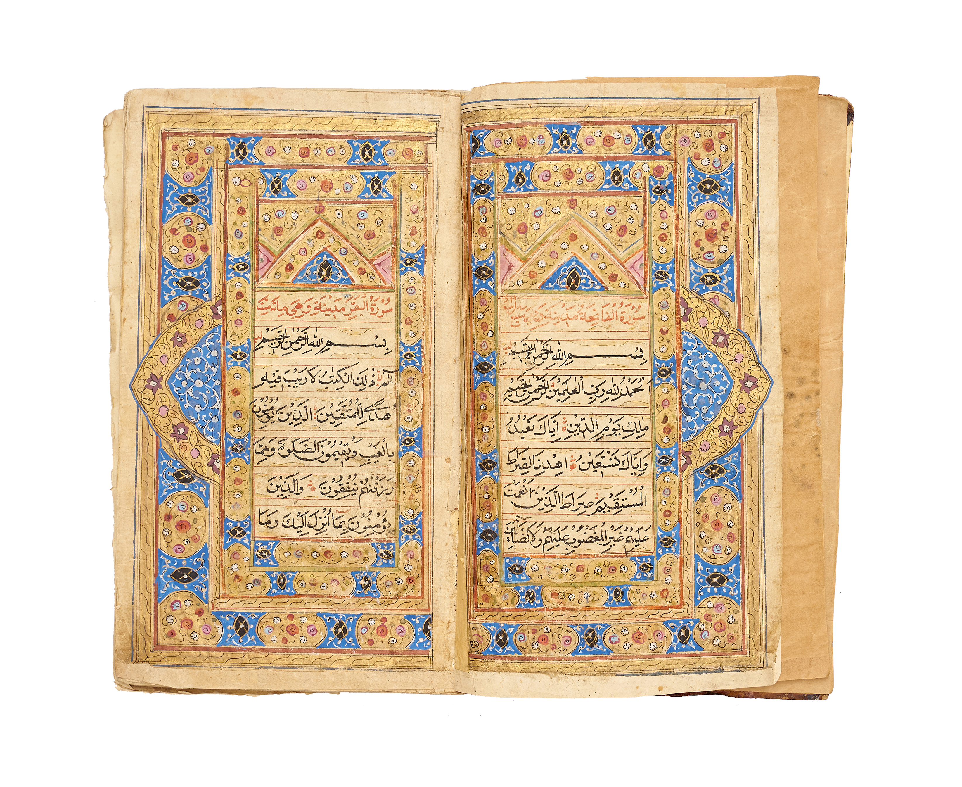 A finely produced Kashmiri Qur’an manuscript, written in bold naskh script in black ink with red vocalization and commentary headings. The opening bifolio features a magnificent illuminated frontispiece, richly decorated in gold, blue, and pink with intricate geometric and vegetal motifs, showcasing the distinct artistry of 19th-century Kashmir.