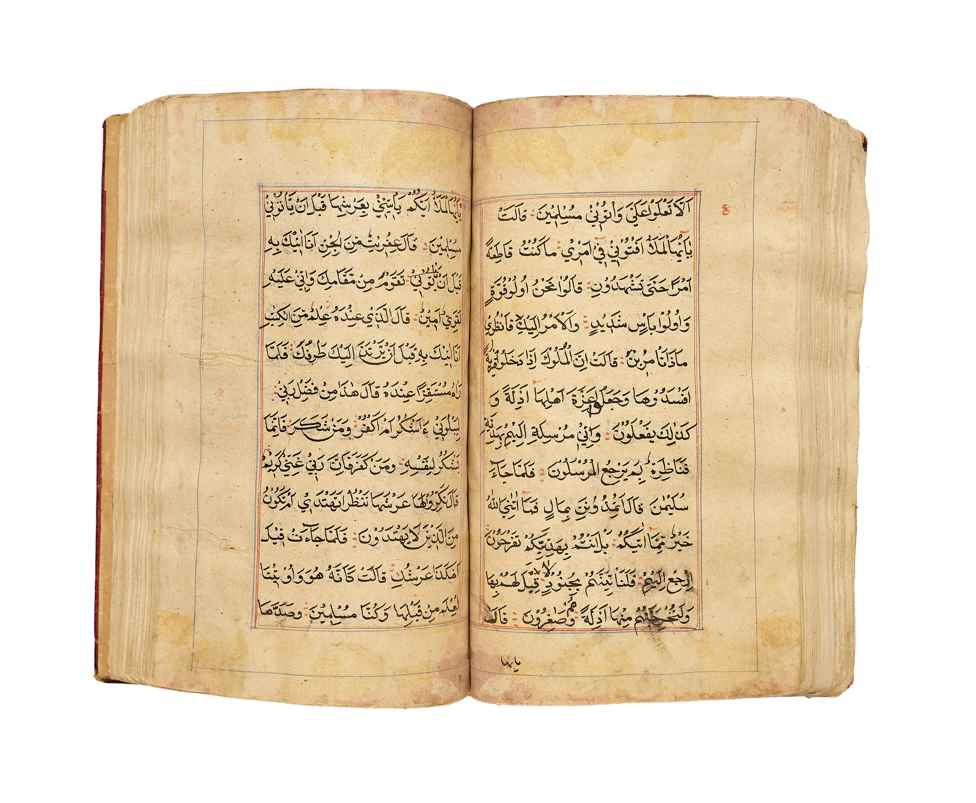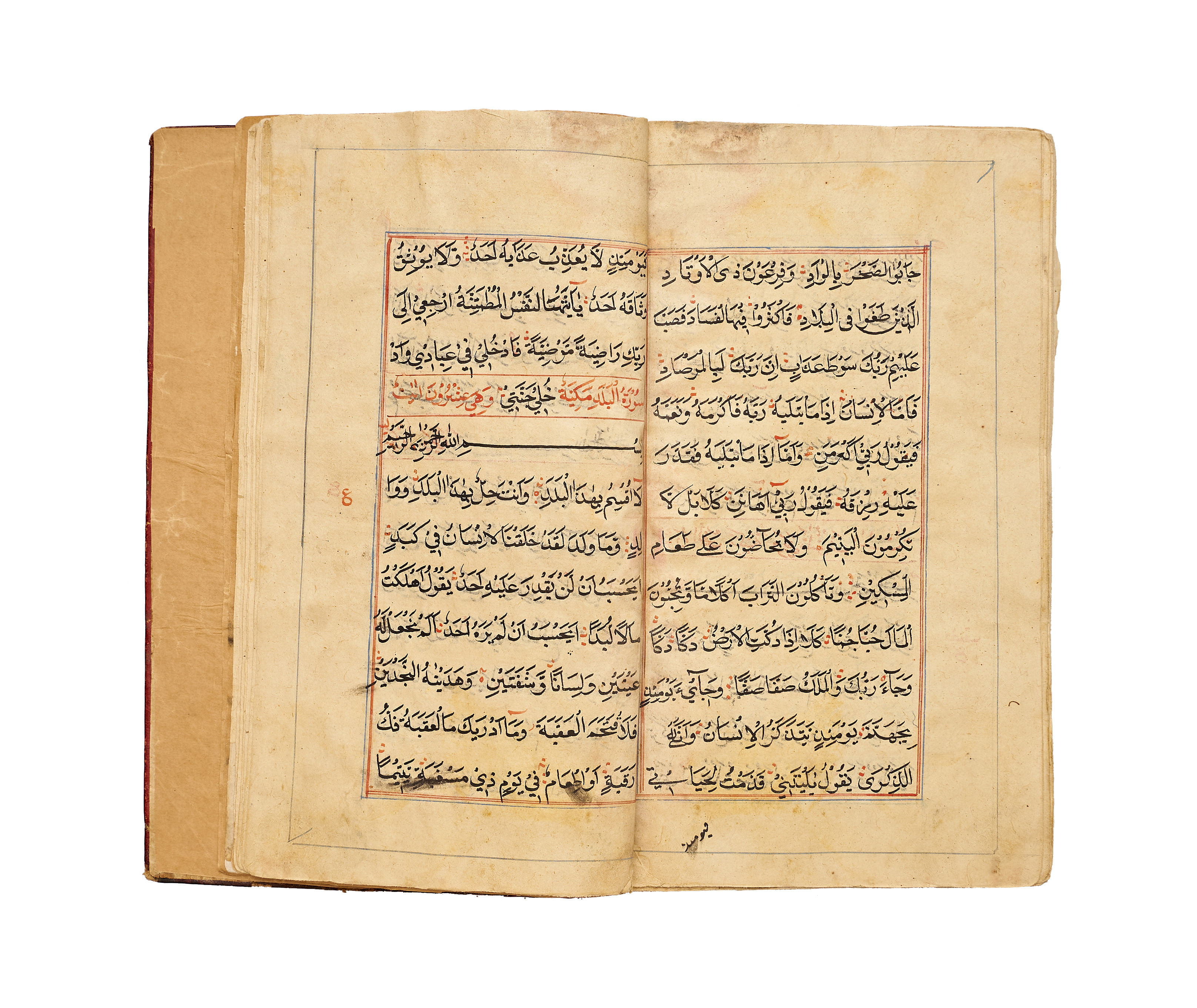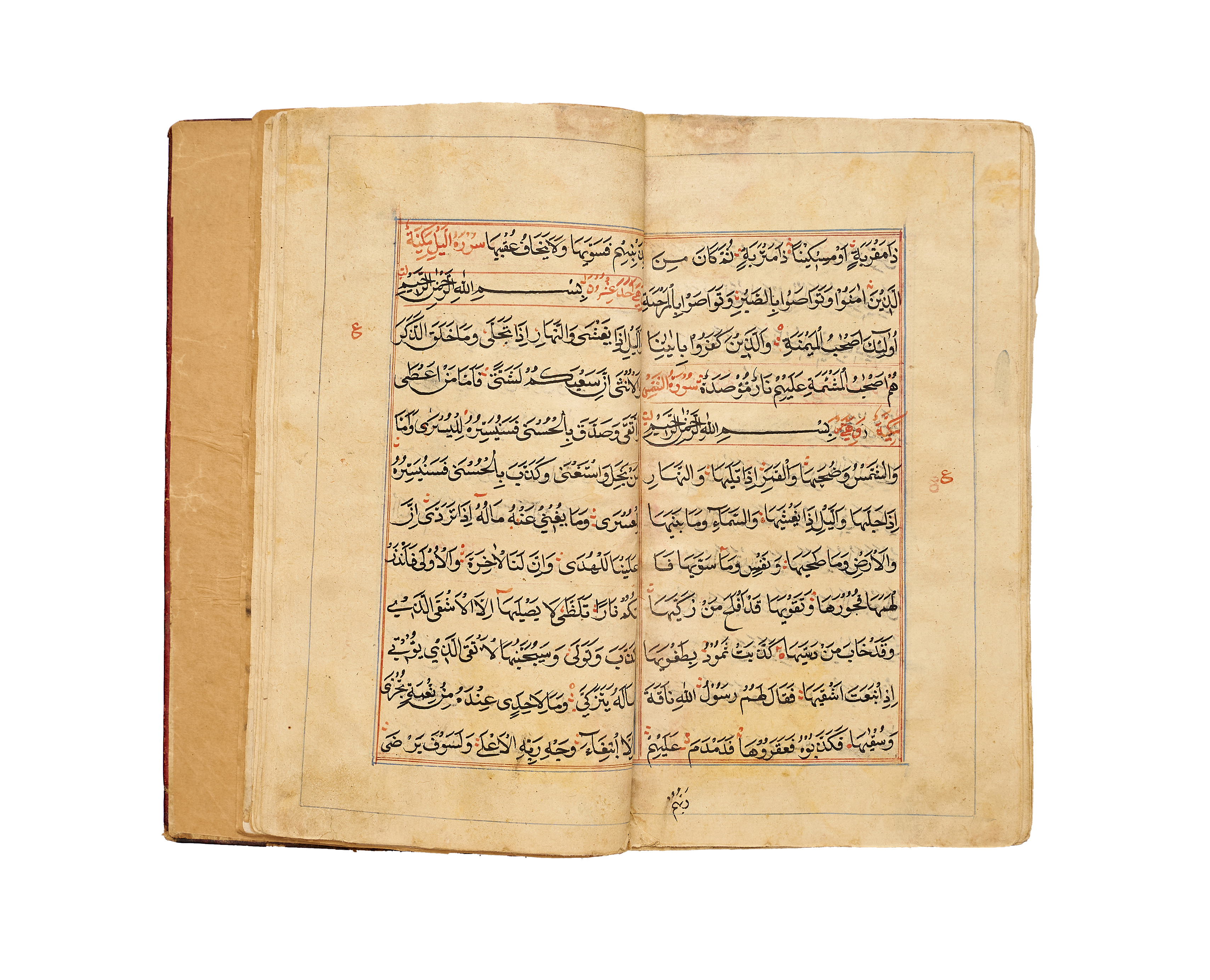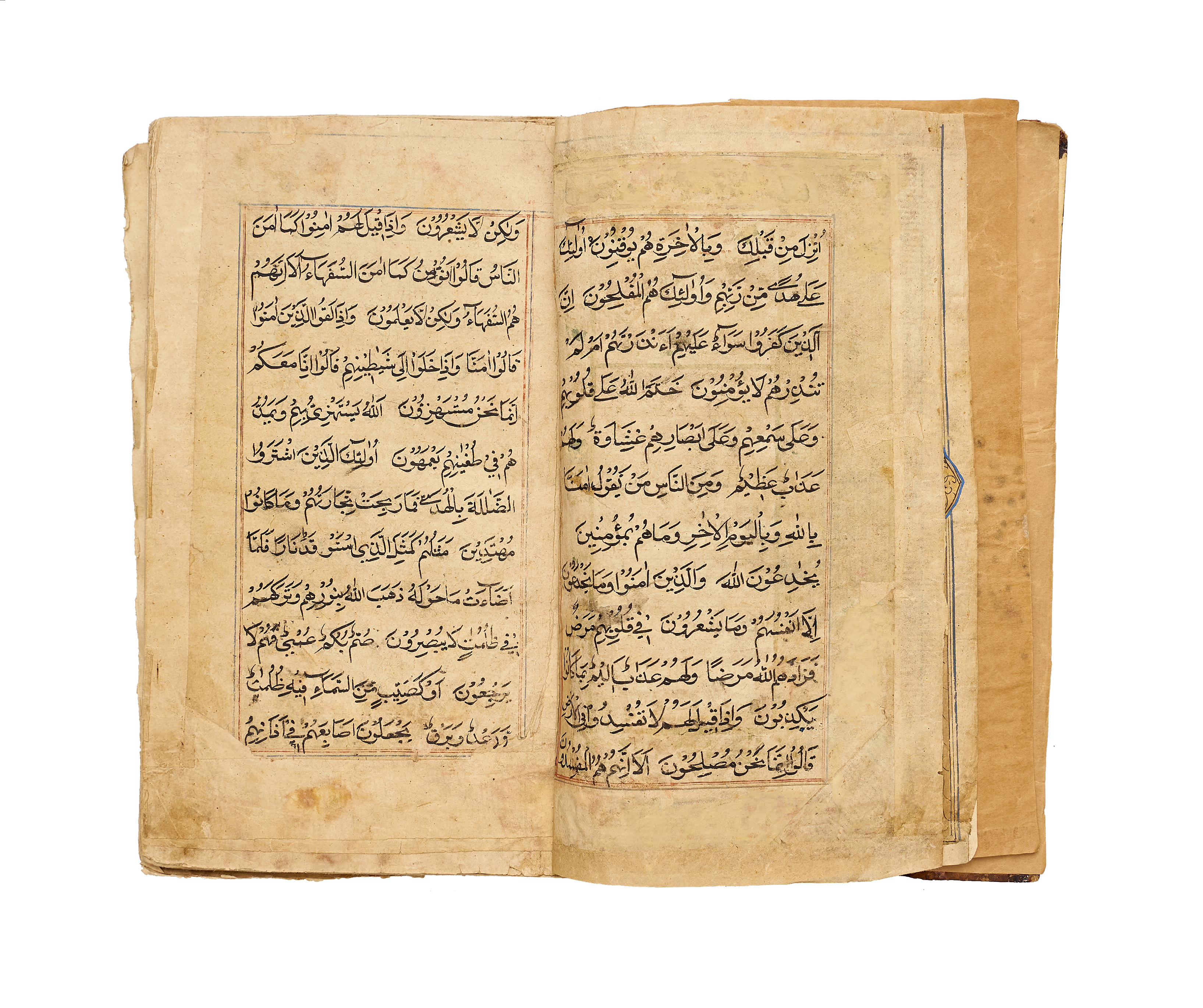 A finely produced Kashmiri Qur’an manuscript, written in bold naskh script in black ink with red vocalization and commentary headings. The opening bifolio features a magnificent illuminated frontispiece, richly decorated in gold, blue, and pink with intricate geometric and vegetal motifs, showcasing the distinct artistry of 19th-century Kashmir.