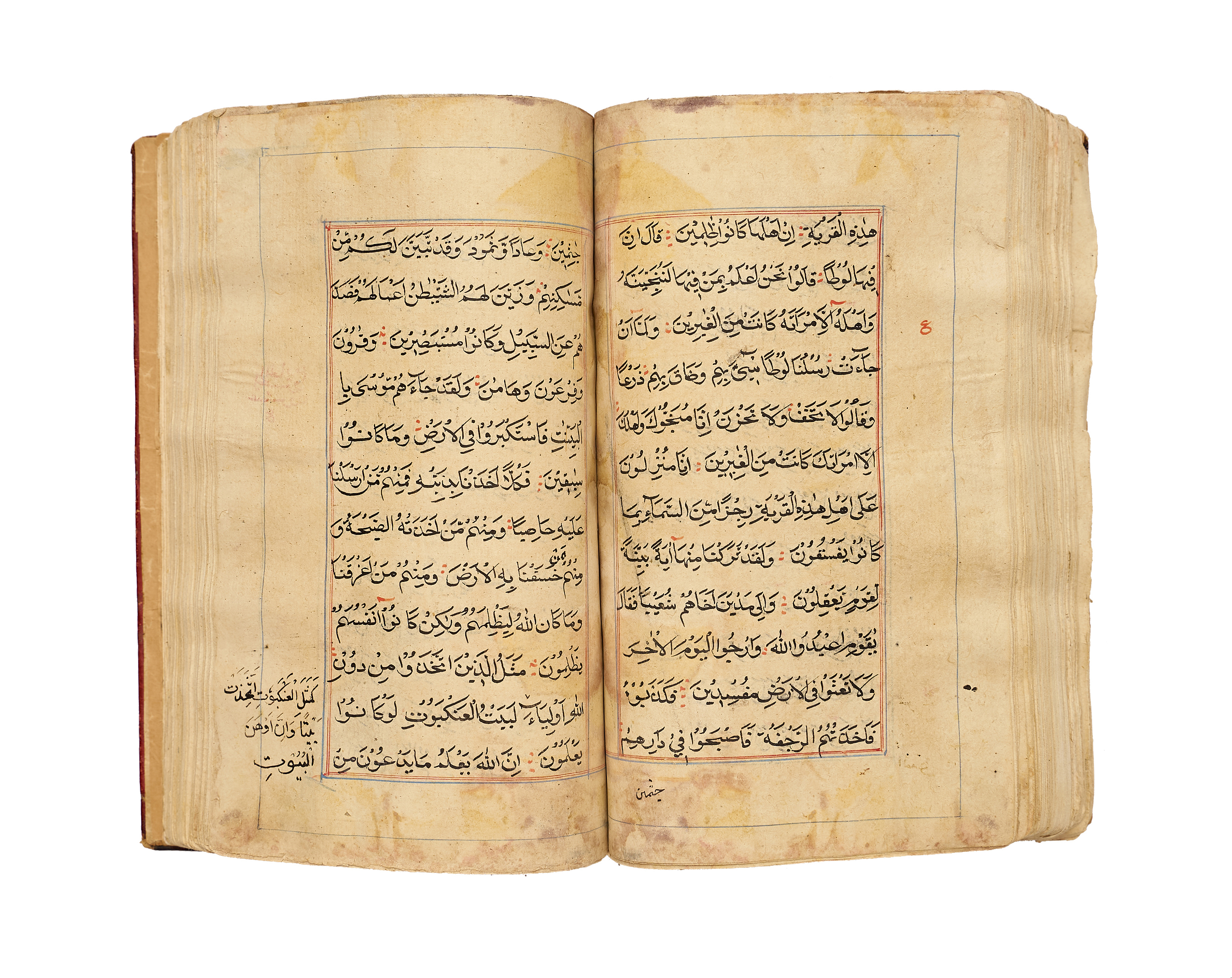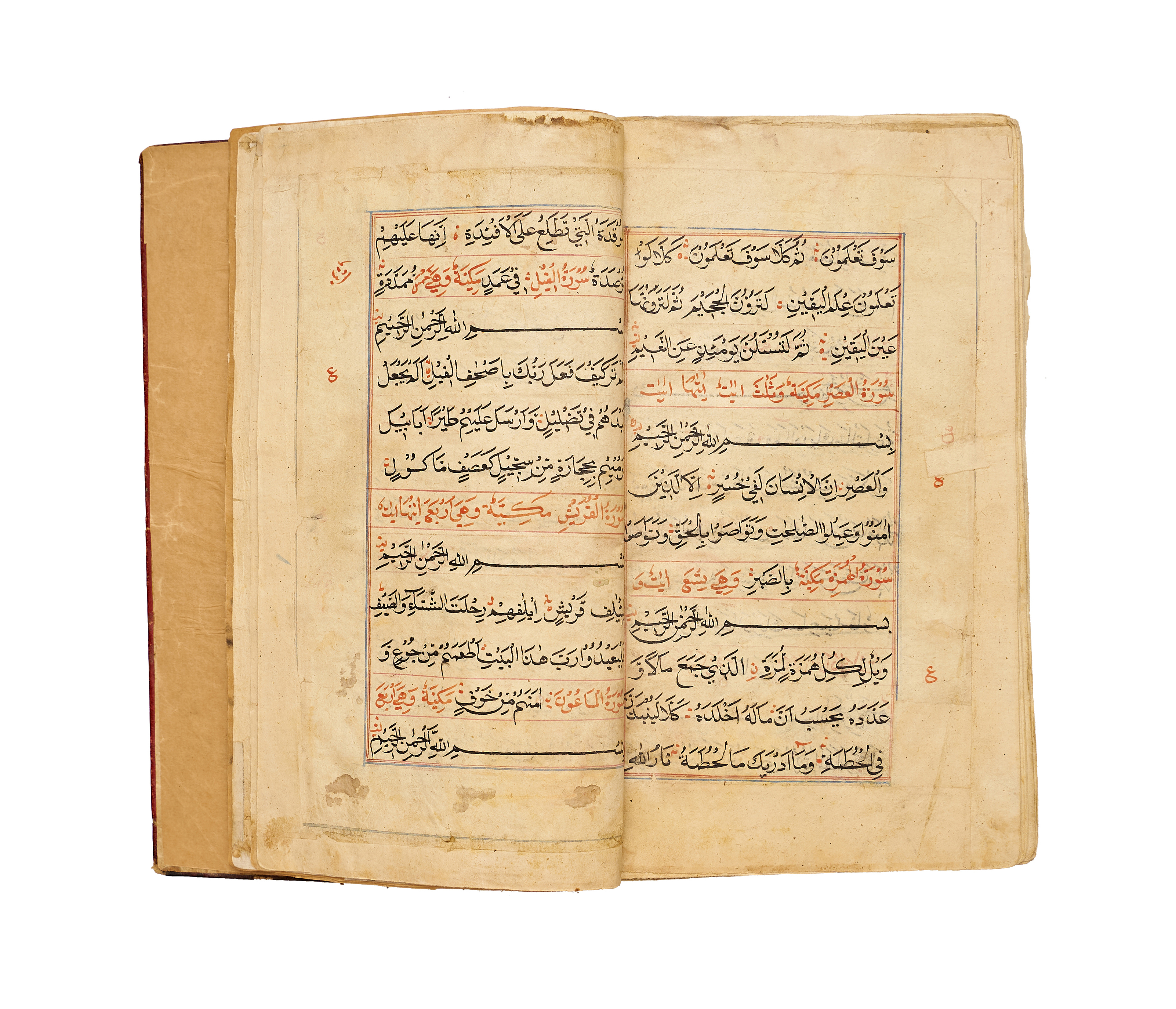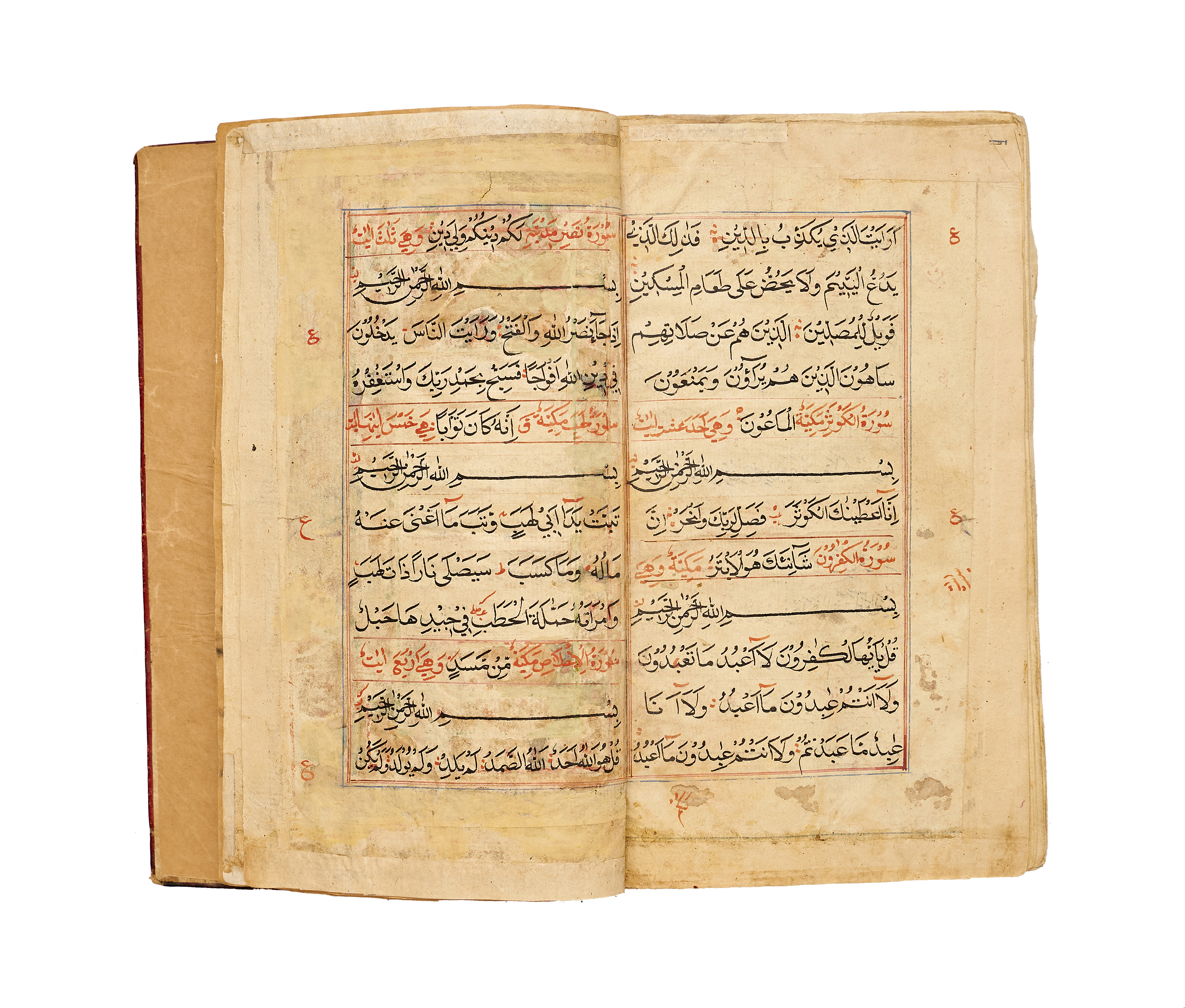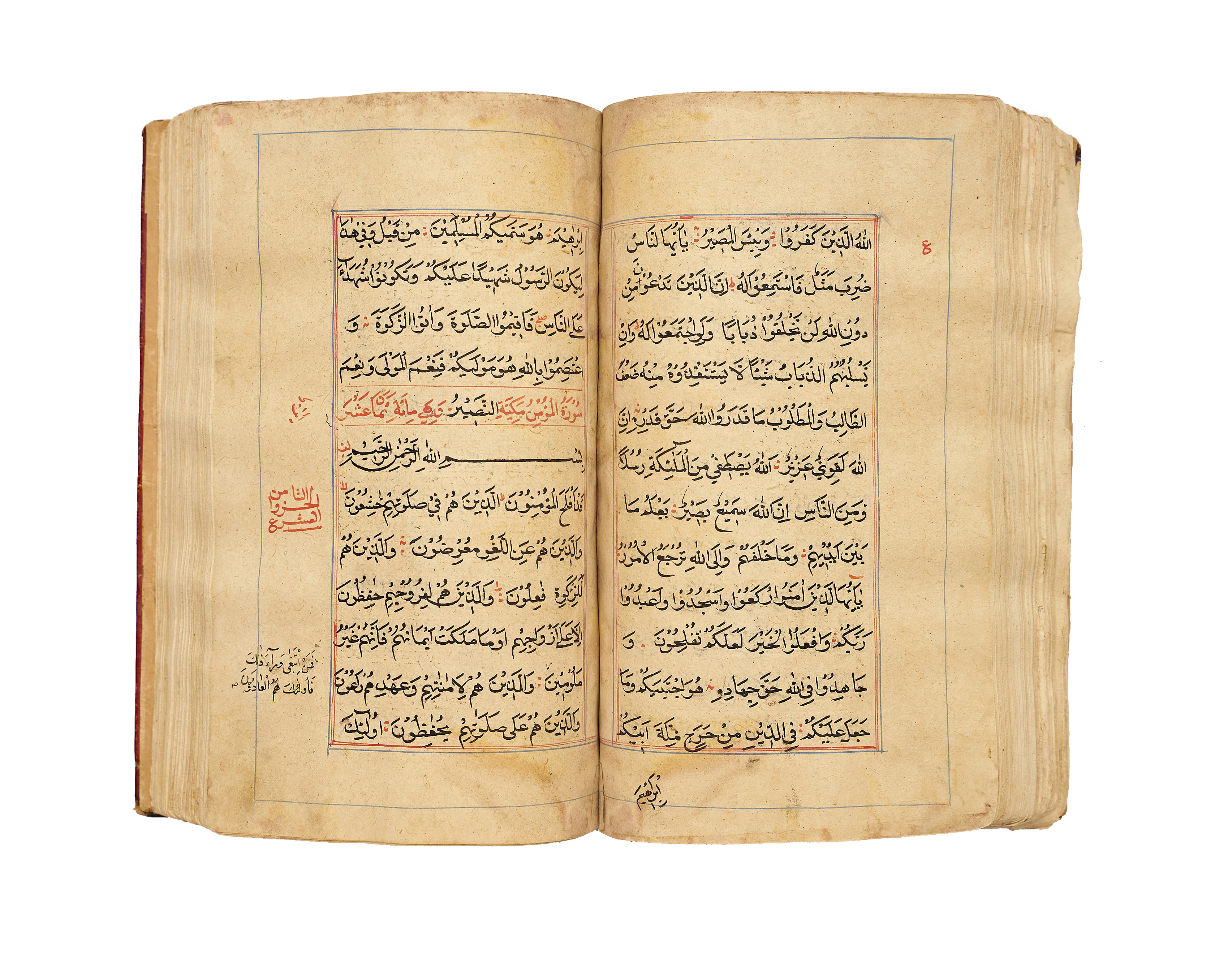 A finely produced Kashmiri Qur’an manuscript, written in bold naskh script in black ink with red vocalization and commentary headings. The opening bifolio features a magnificent illuminated frontispiece, richly decorated in gold, blue, and pink with intricate geometric and vegetal motifs, showcasing the distinct artistry of 19th-century Kashmir.