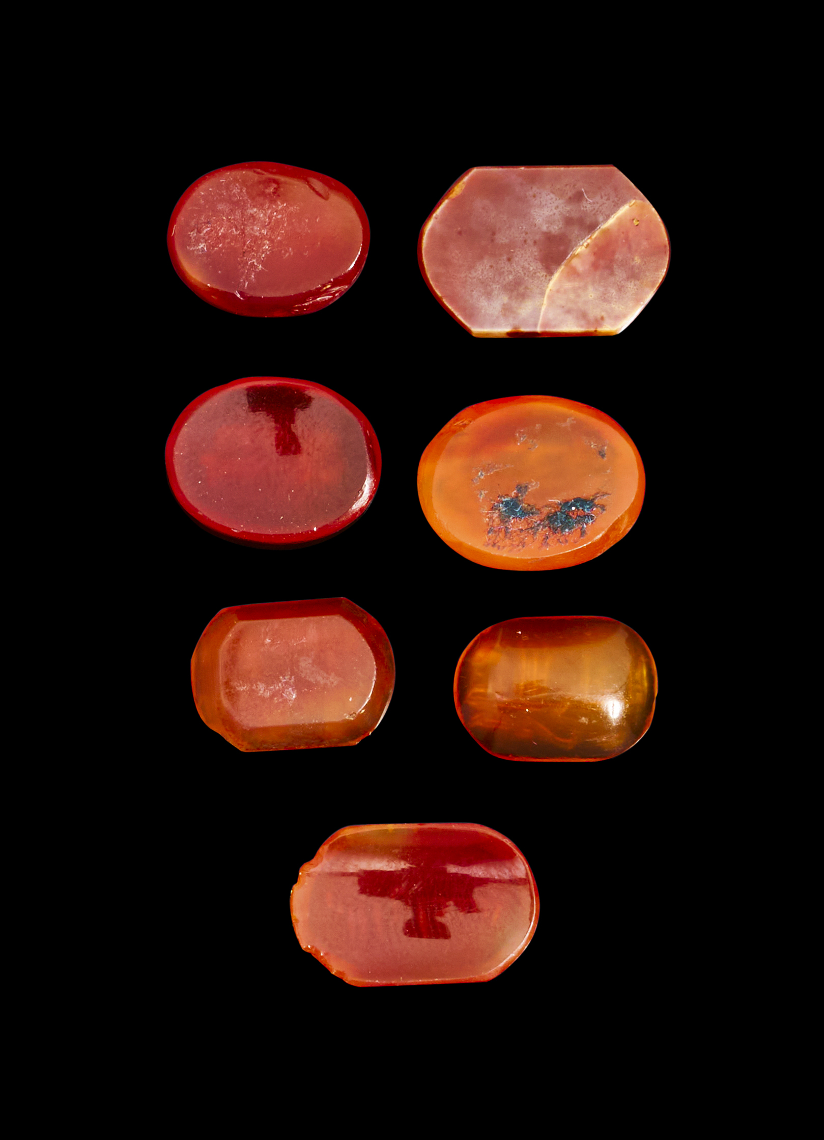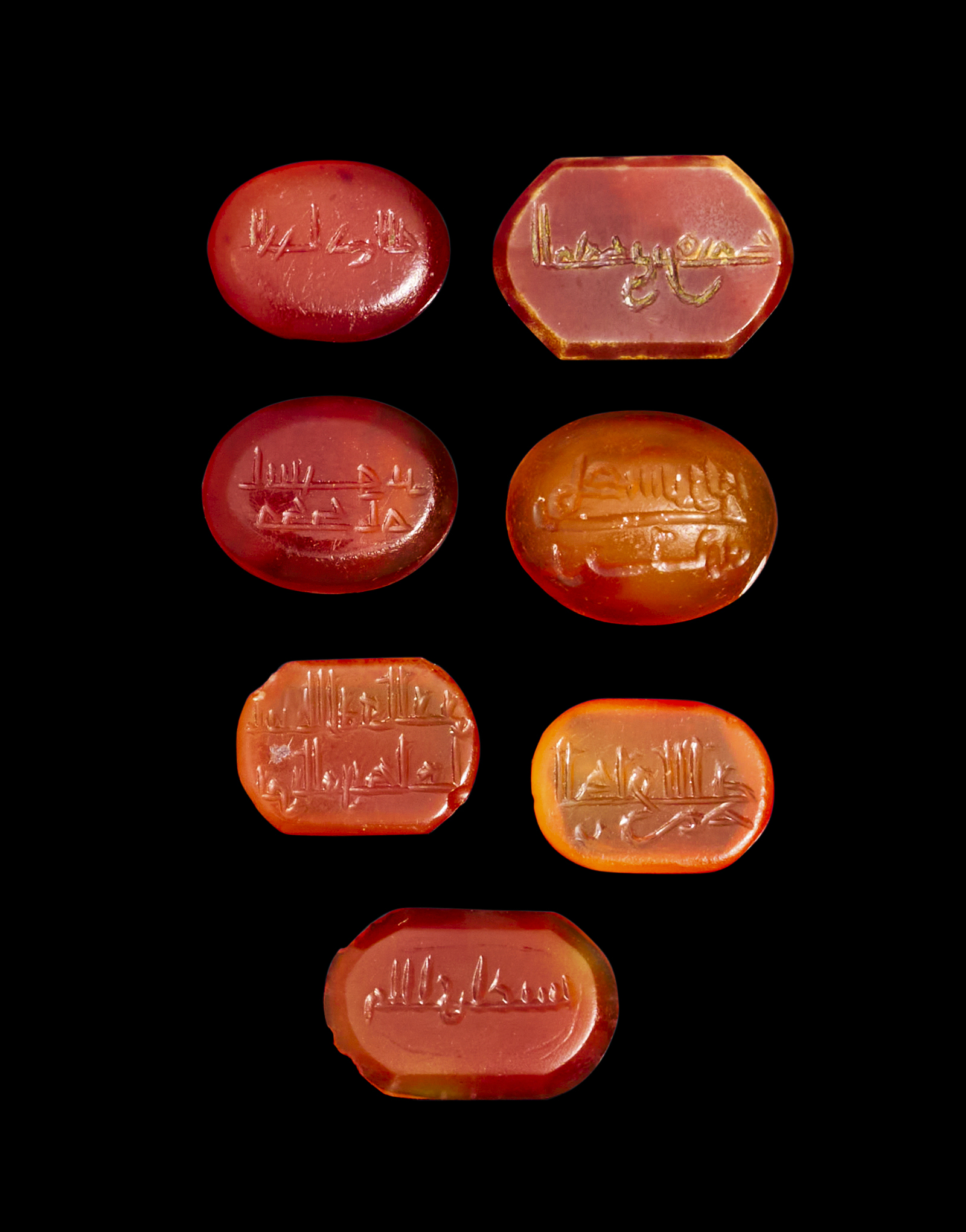 A GROUP OF SEVEN EARLY ISLAMIC ENGRAVED AGATE SEALS WITH KUFIC SCRIPT, 9TH – 12TH CENTURY