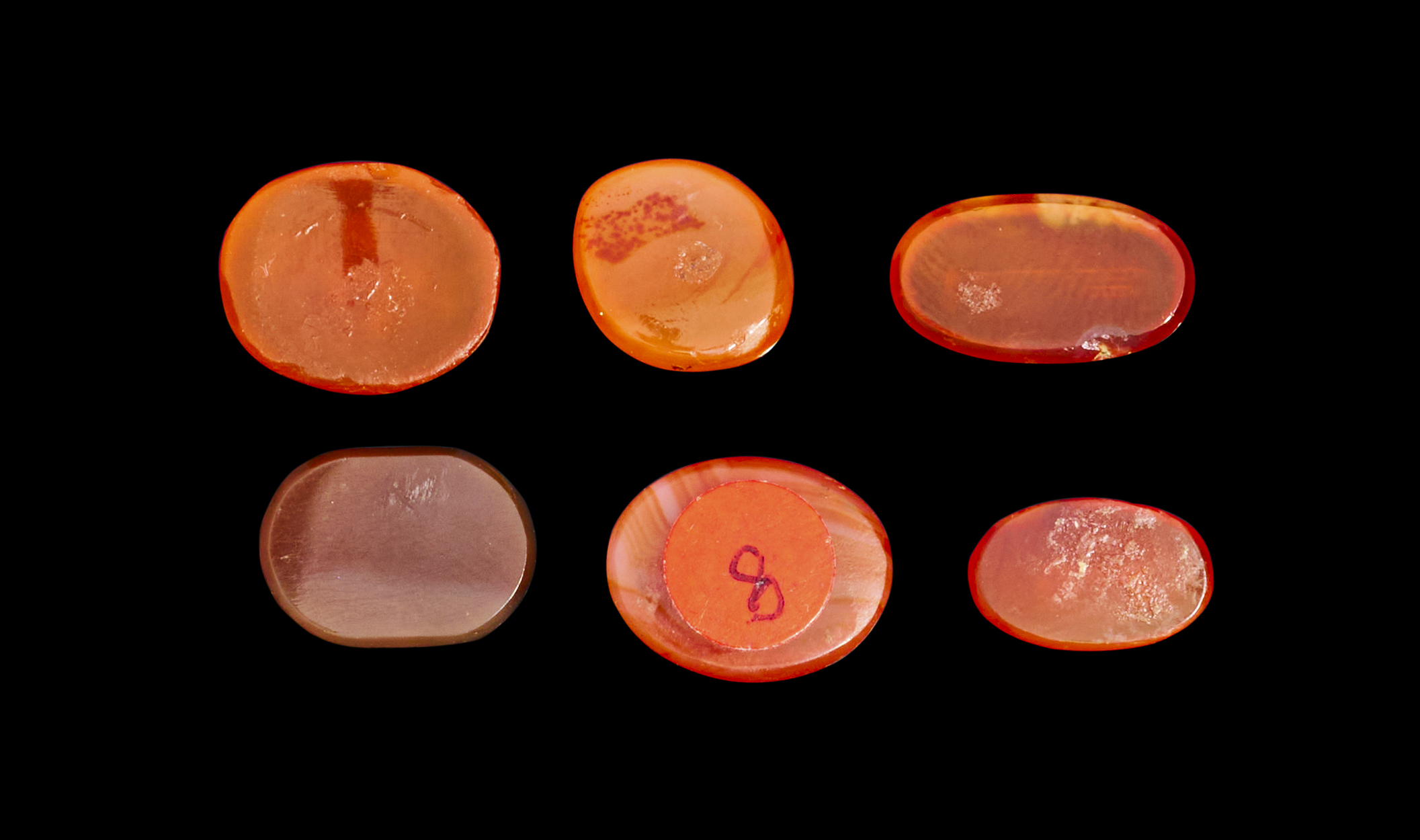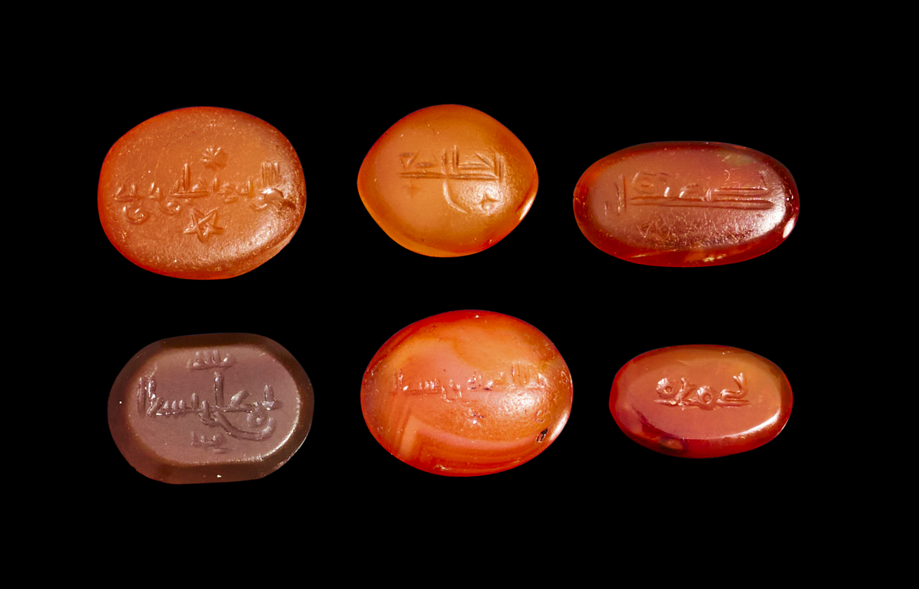 A COLLECTION OF SIX AGATE KUFIC ENGRAVED EARLY ISLAMIC SEALS, 10TH – 14TH CENTURY