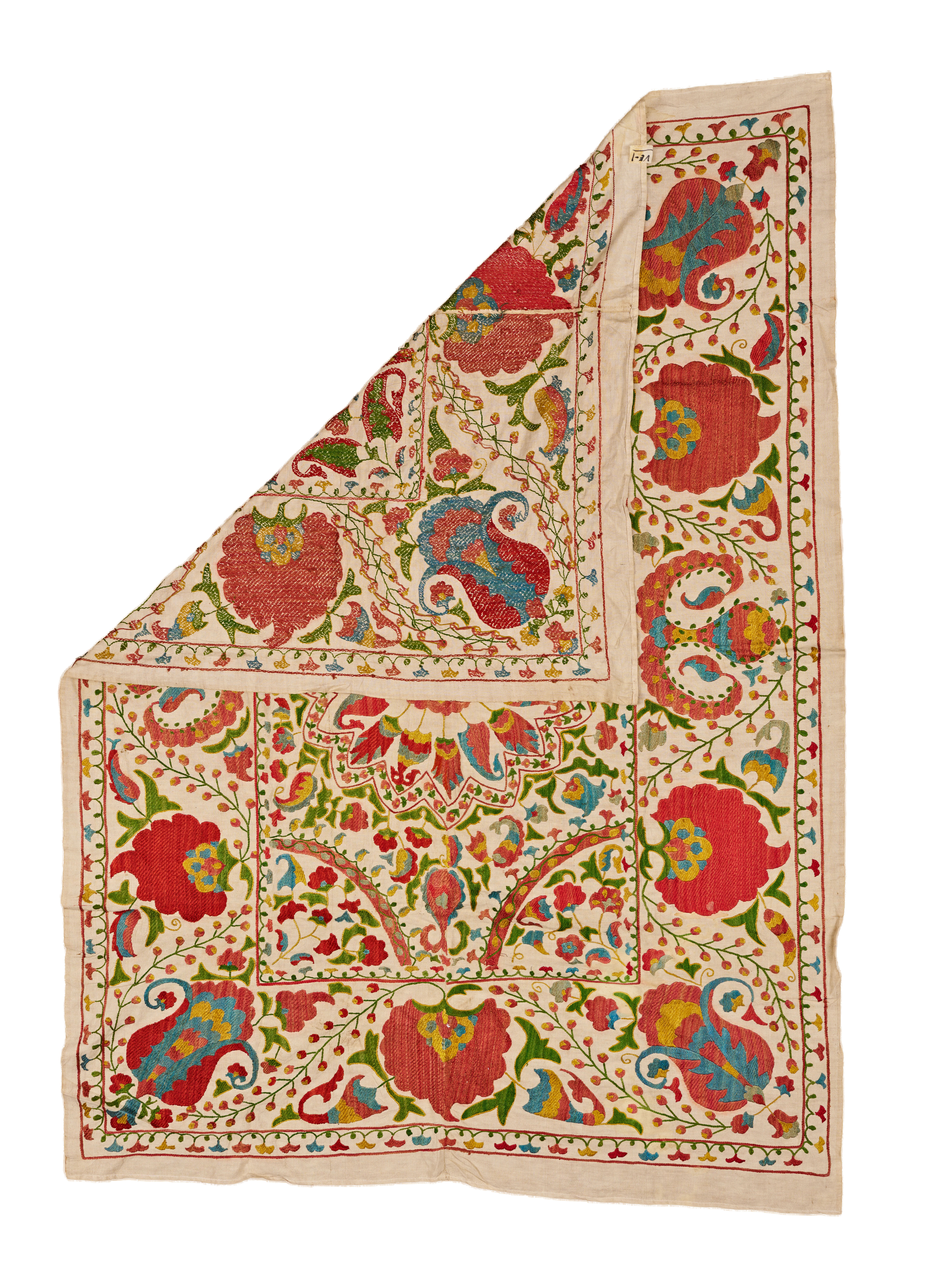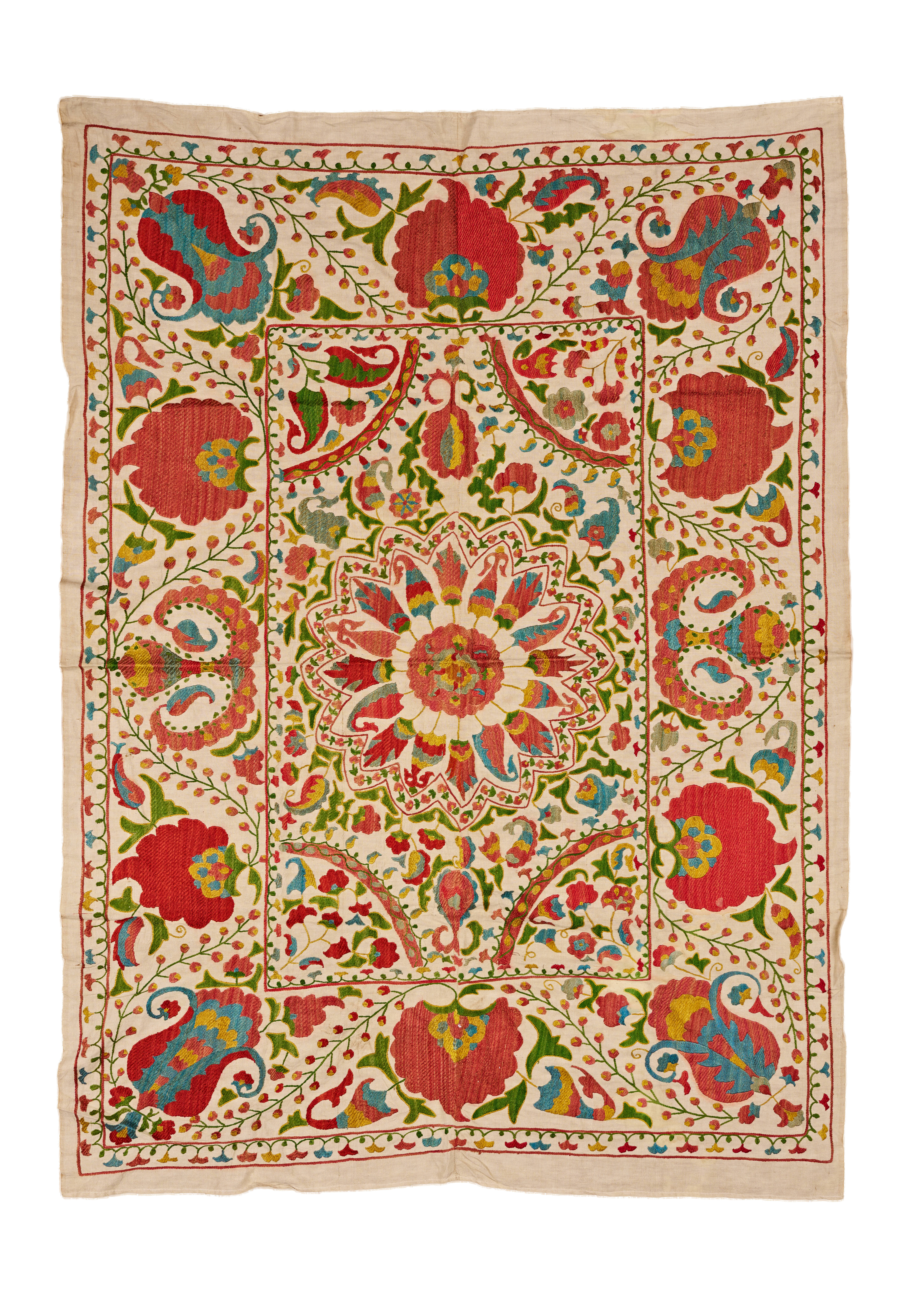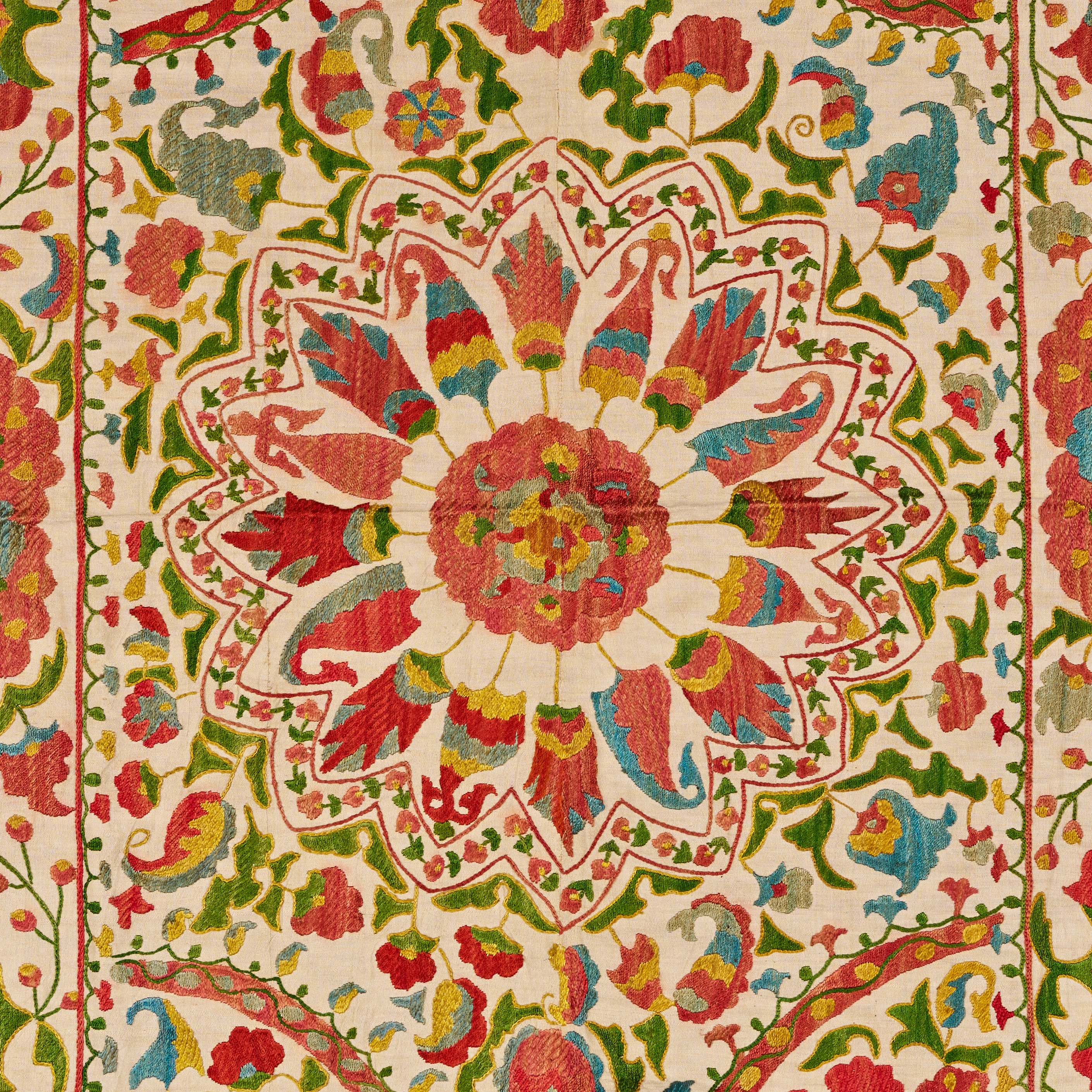 A vibrant Uzbek Suzani textile finely embroidered in silk threads on a natural cotton ground, featuring a spectacular central rosette composed of radiating petals in shades of red, blue, green, and yellow. Surrounding the medallion is a dense and lively arrangement of stylized flowers, scrolling vines, and boteh motifs, all rendered in characteristic regional colors and exhibiting the rhythmic balance of traditional Central Asian design.