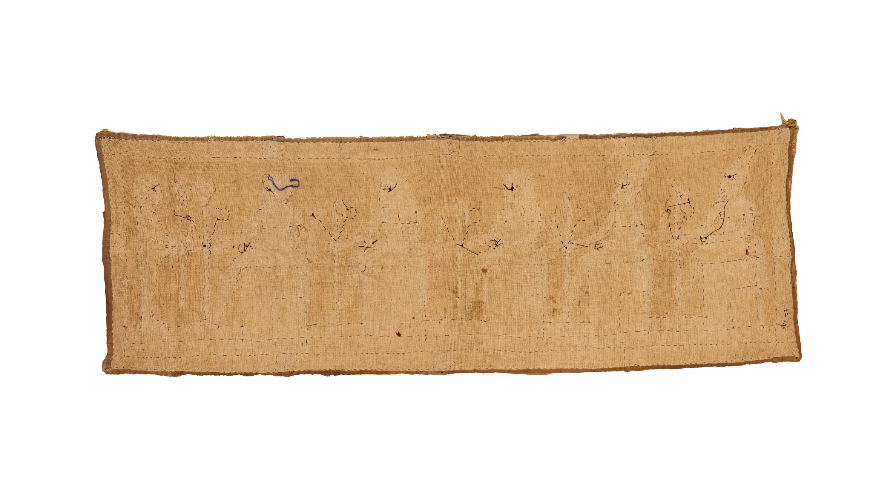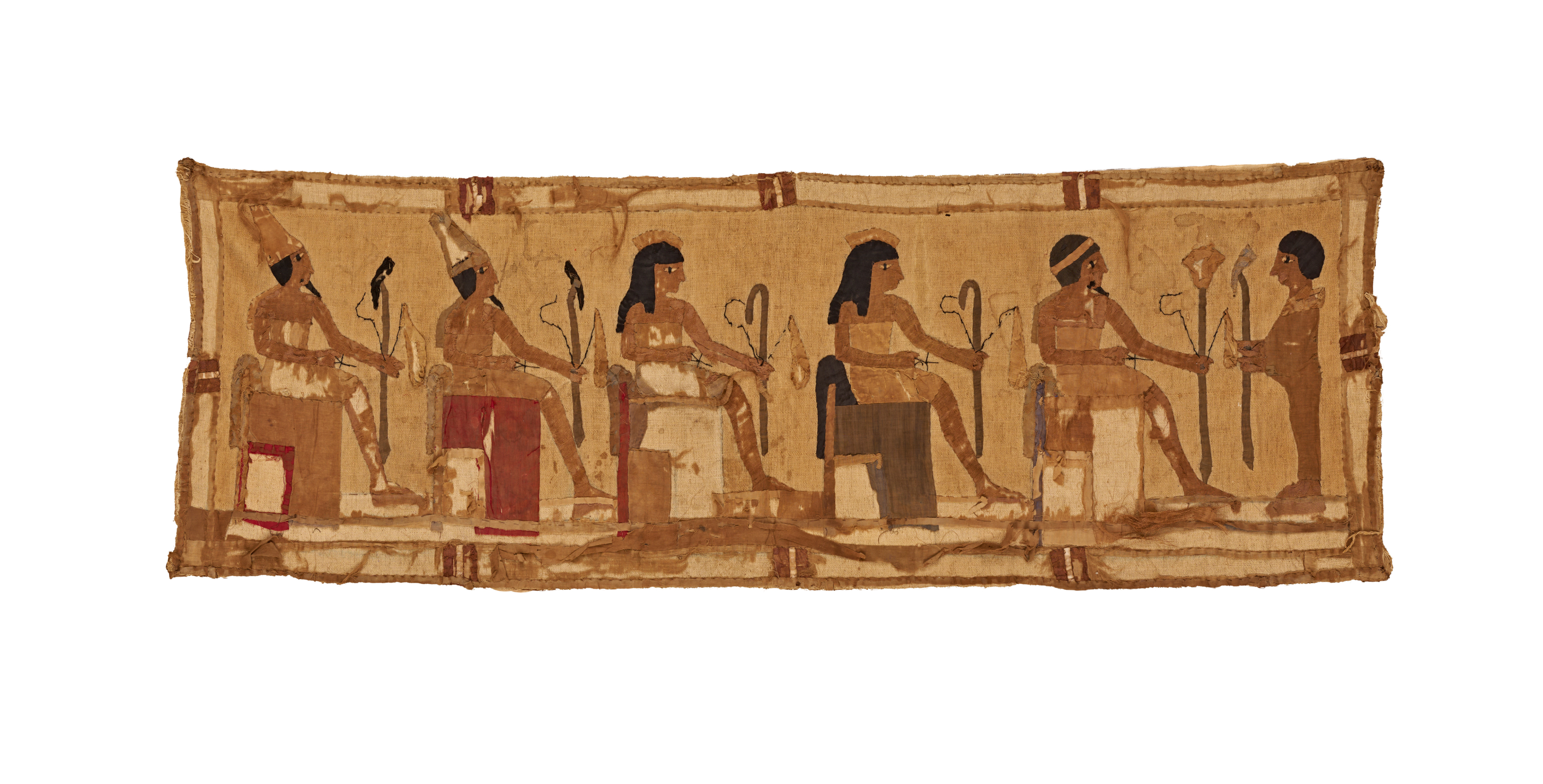 A finely worked Egyptian Revival textile panel, likely produced as a Grand Tour souvenir in the 19th century. The composition features a procession of seated and standing figures rendered in appliqué and embroidered details, echoing the stylized poses, garments, and attributes of ancient Egyptian art. The figures hold traditional symbols and staffs, arranged in a continuous frieze that evokes the narrative registers of Pharaonic wall paintings.