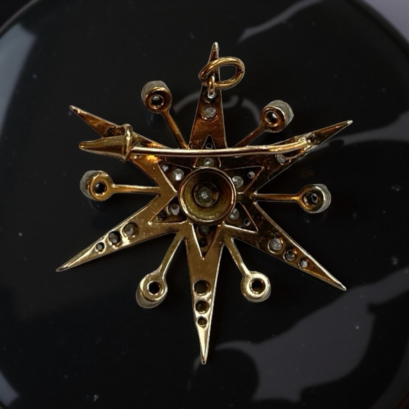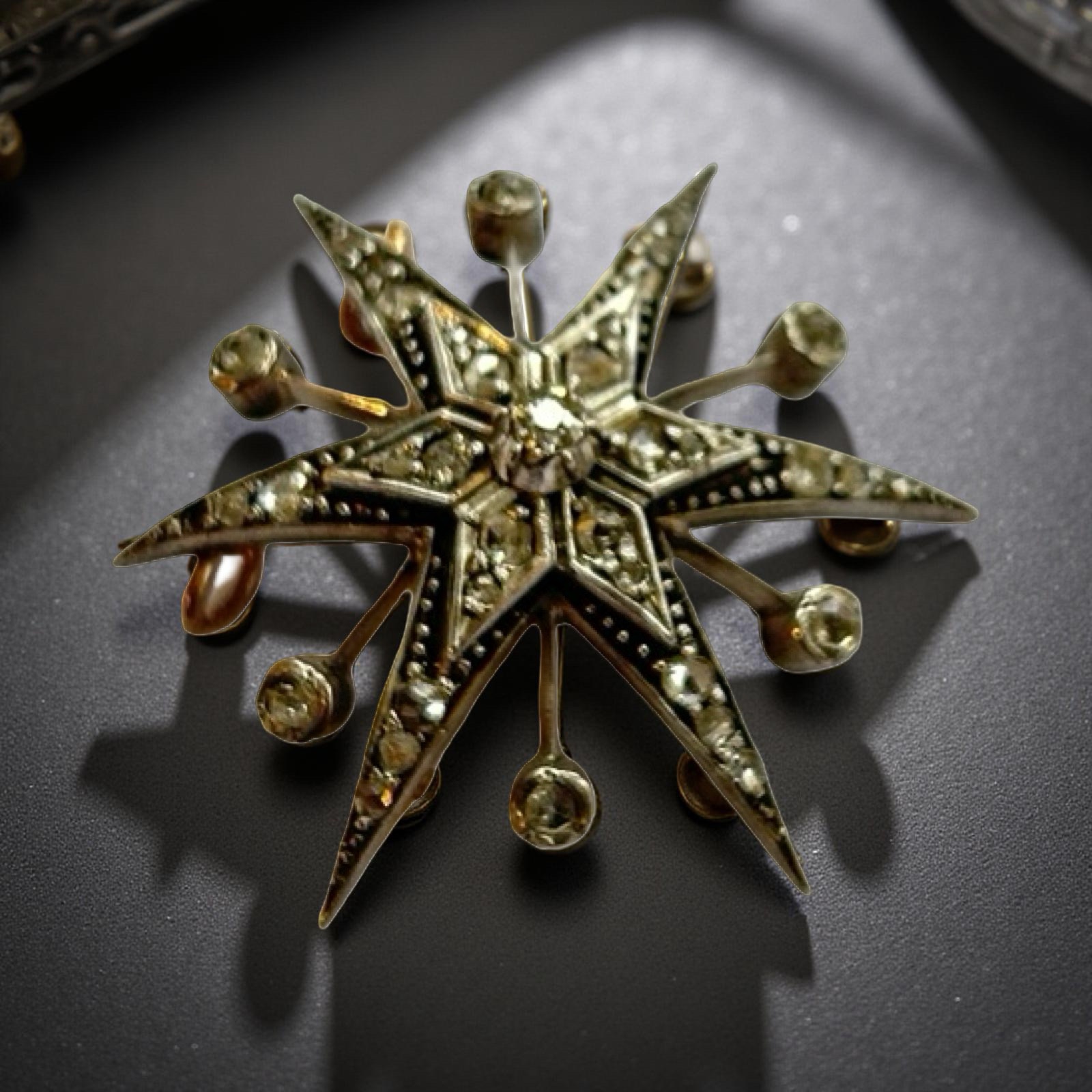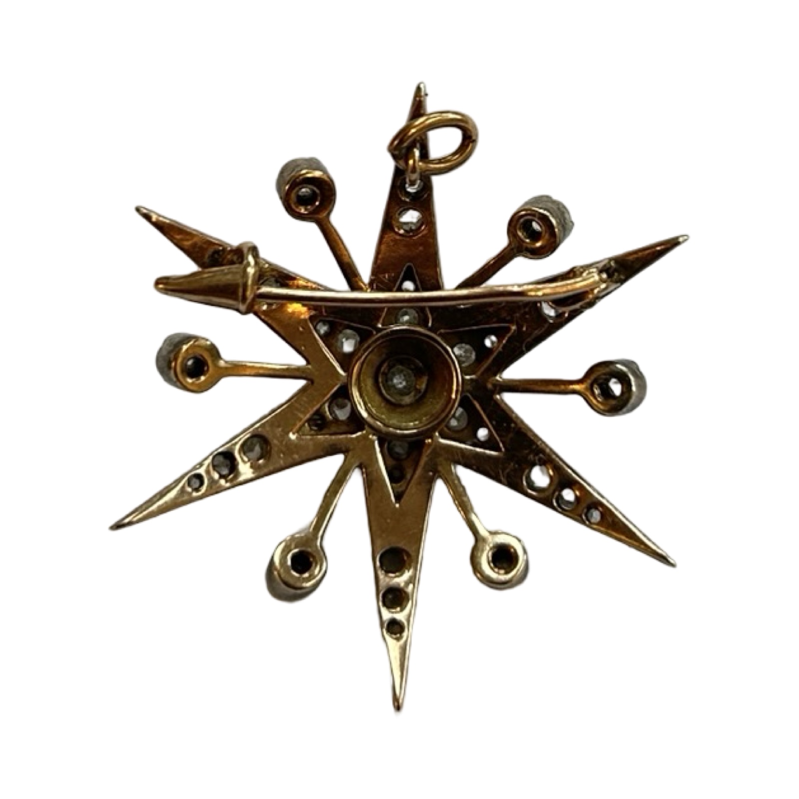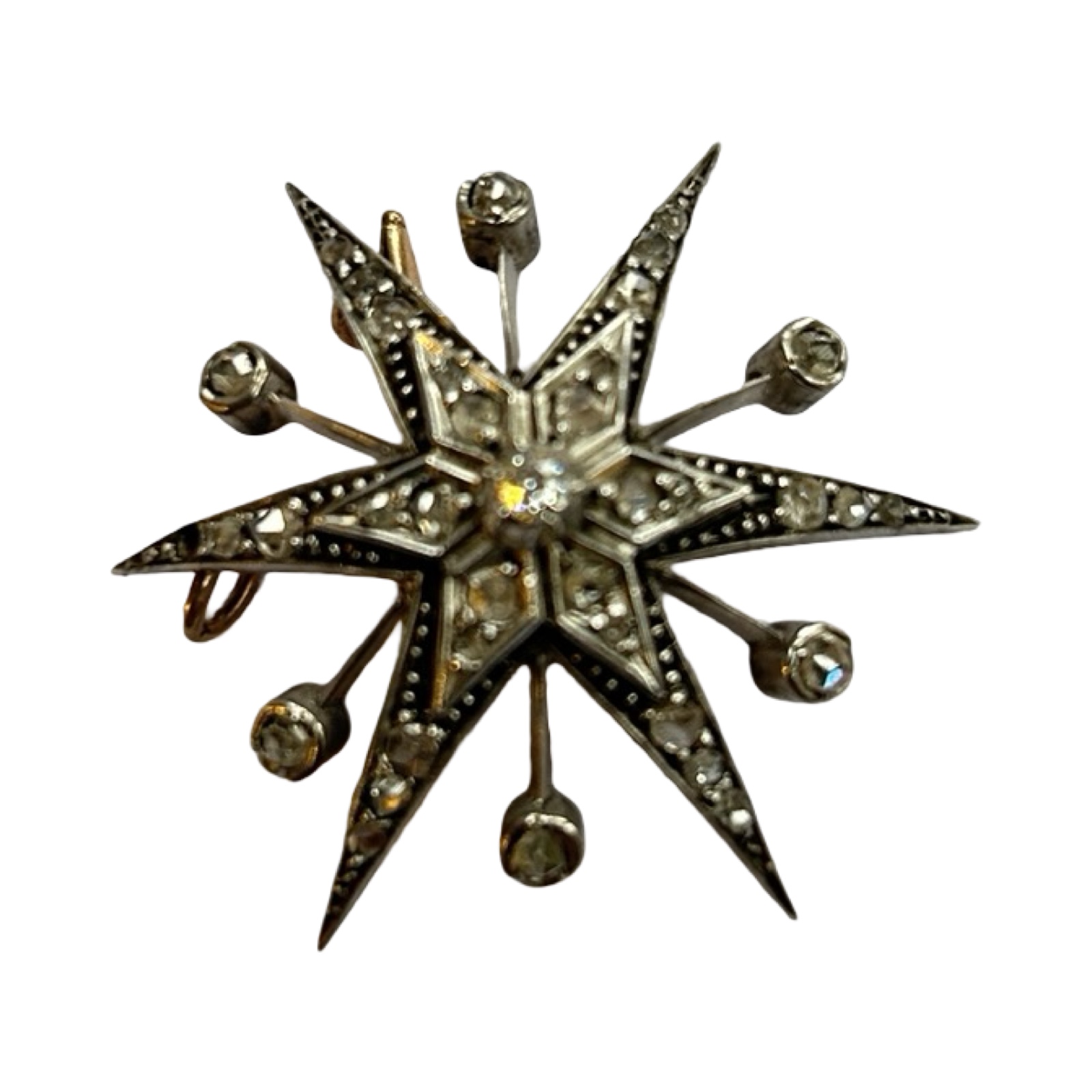 Tests as 9ct gold and silver. Central old cut diamond surrounded by small rose cut diamonds.