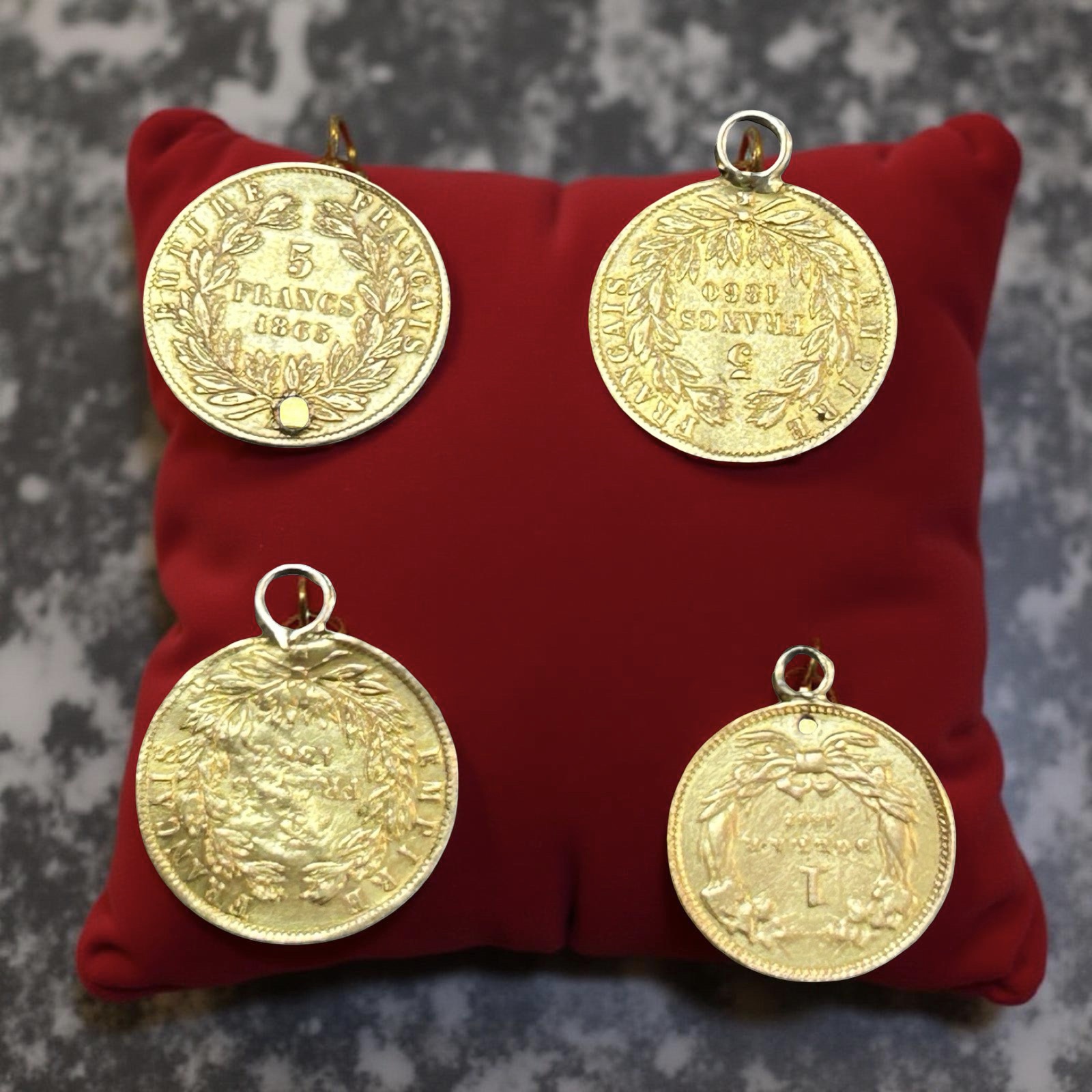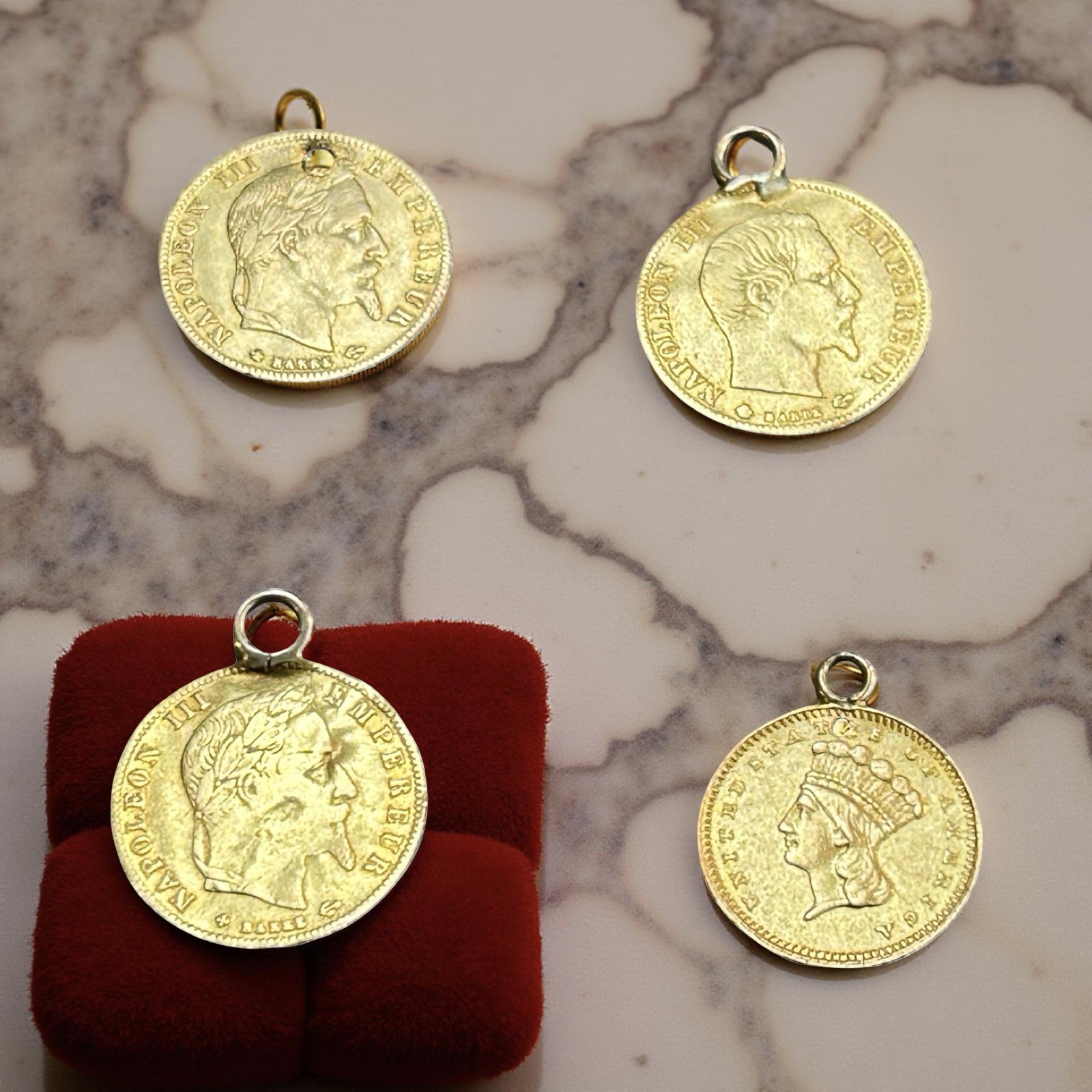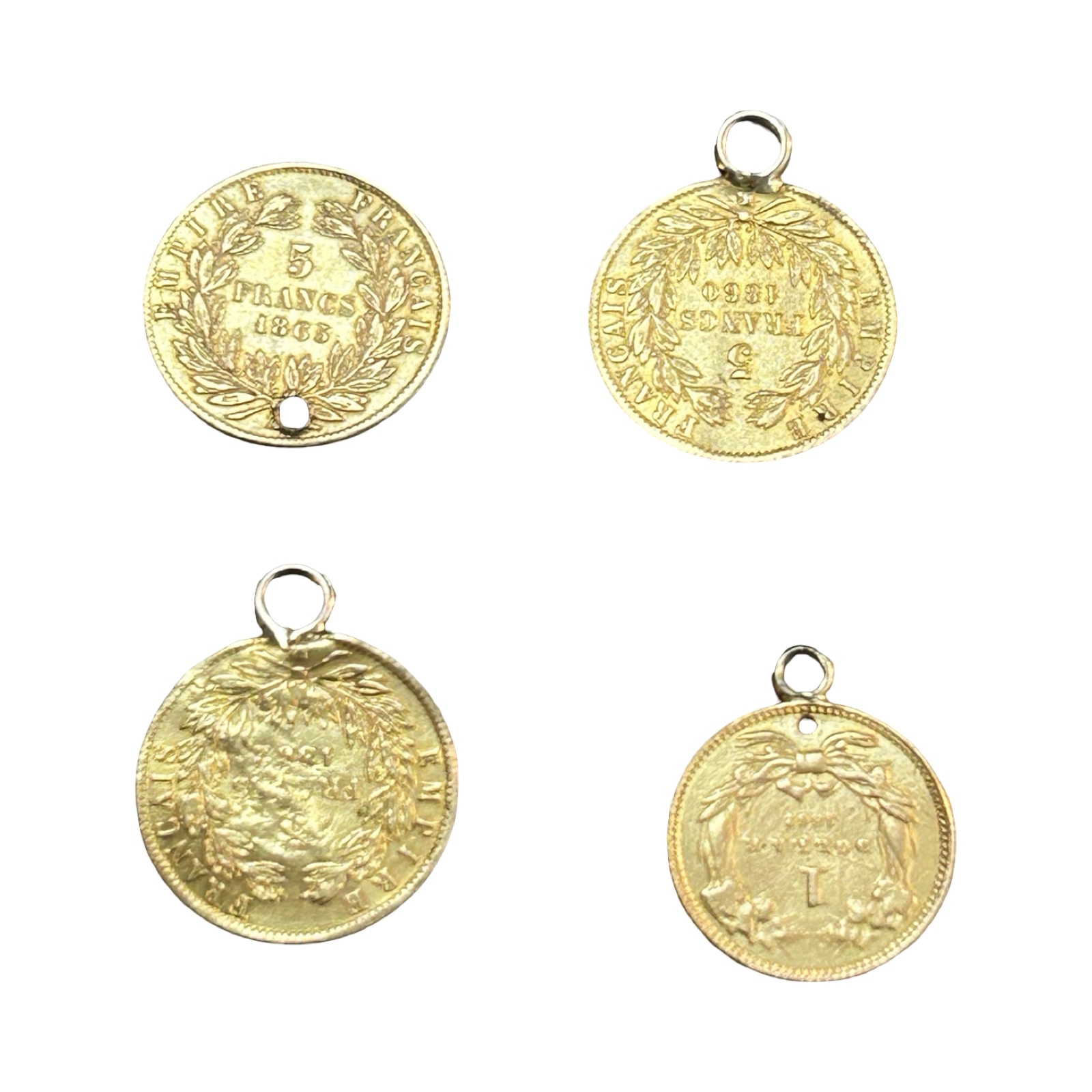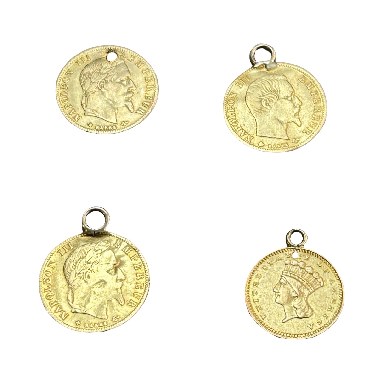 Each has been pierced for mounting on a charm bracelet or pendant (see pictures). 3 are French Empire 5 franc coins dated 1860, 1862,1865 and a an American 1 dollar, 1862. These are noted as 21.6 carat gold.