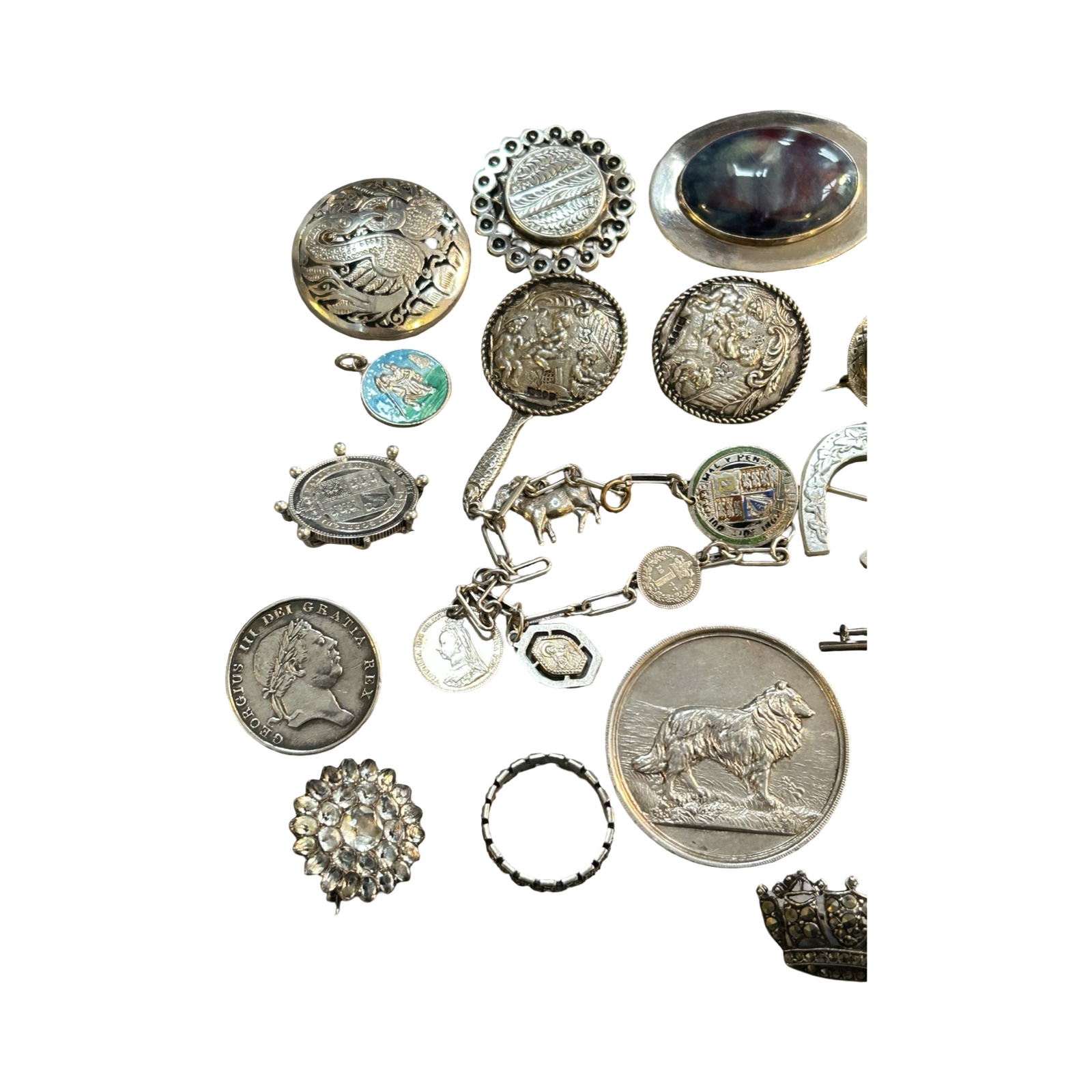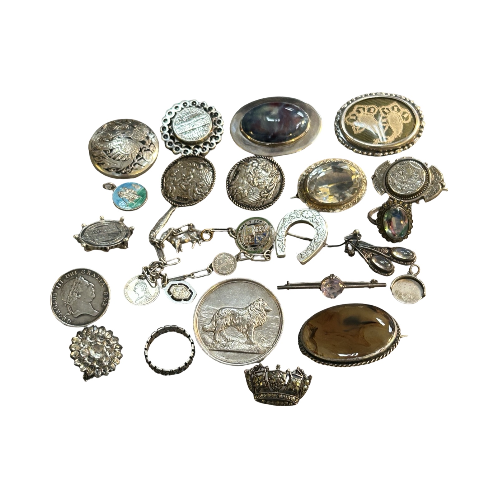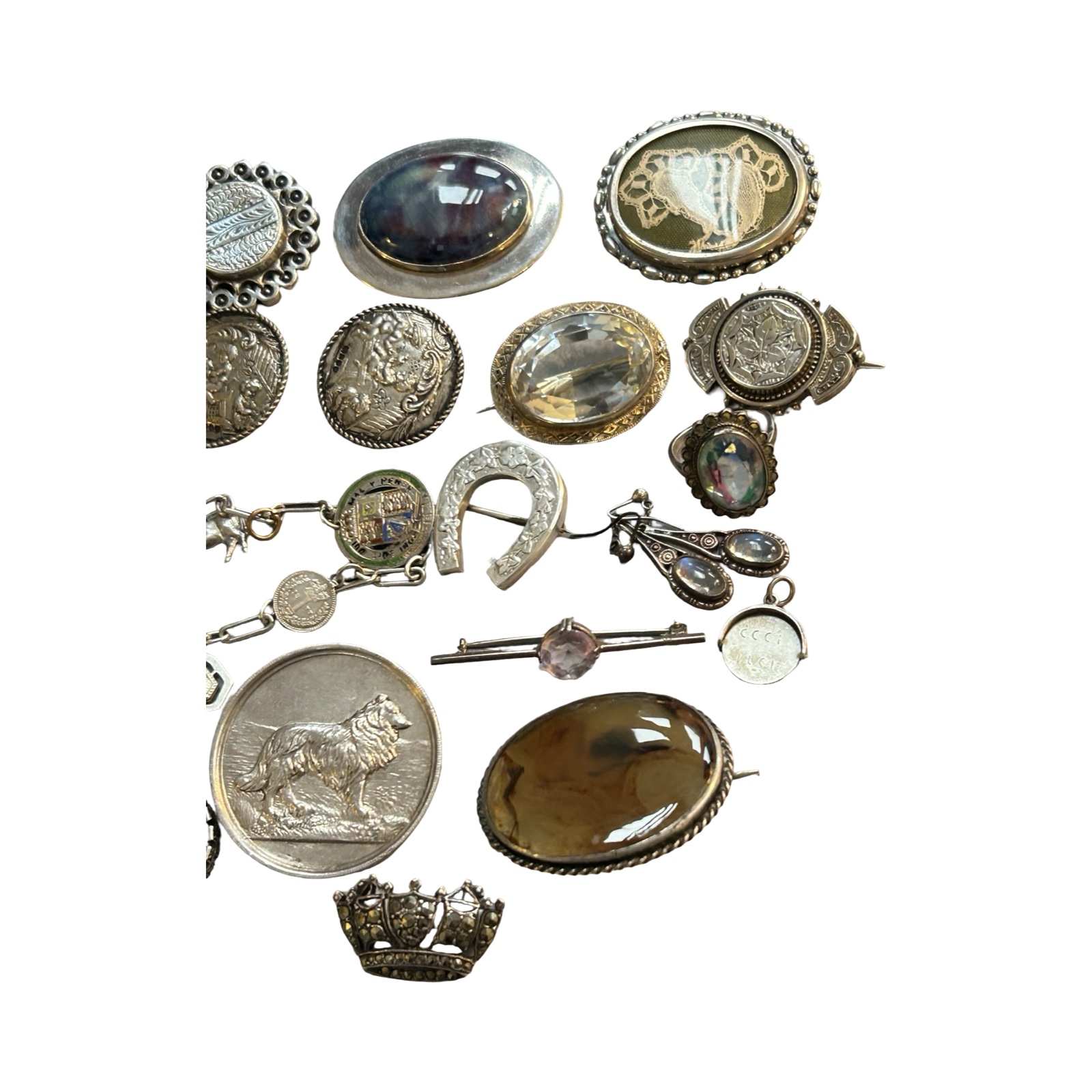 Additional brooches including a 1928 sheep dog trial medal mounted as a brooch and a quantity of other items.