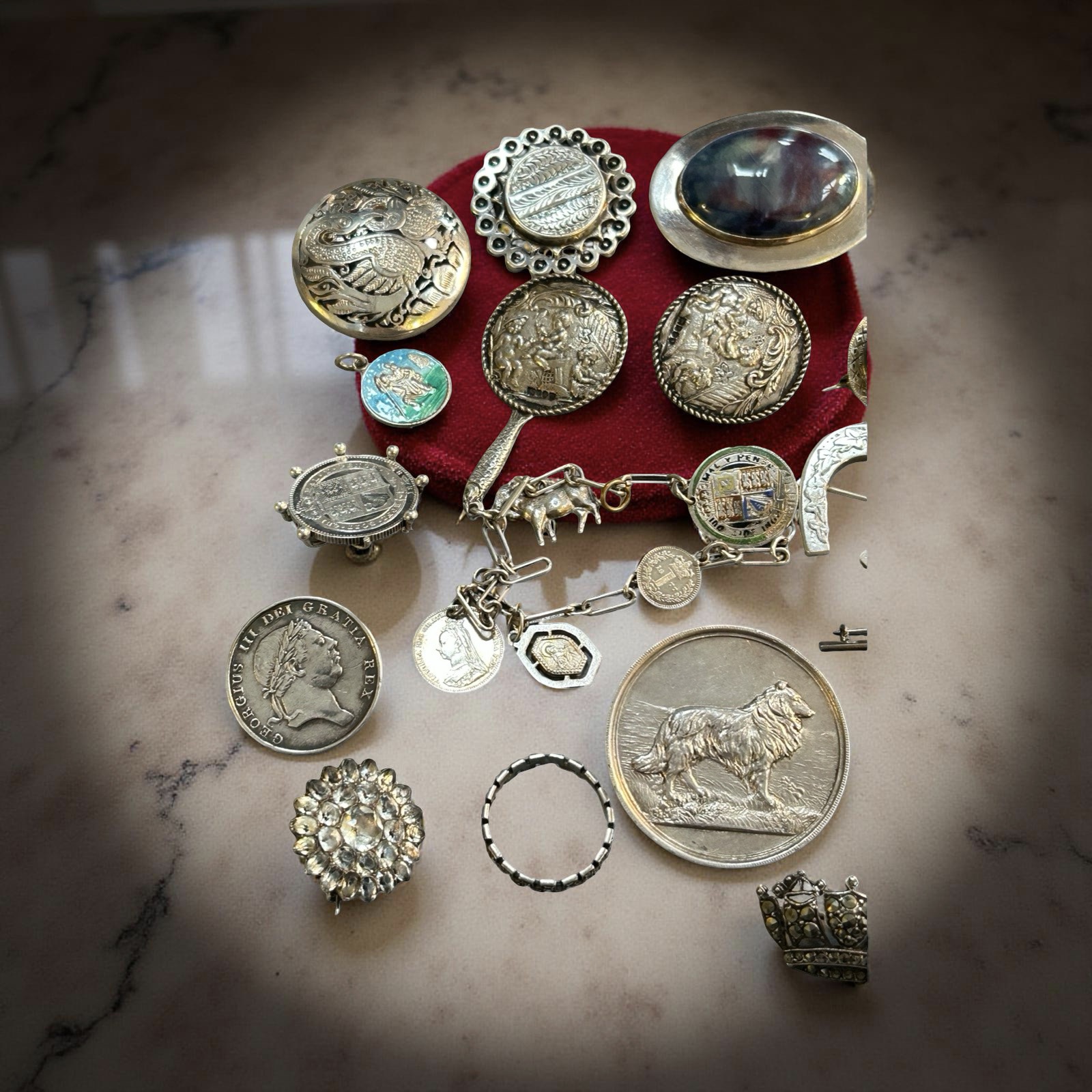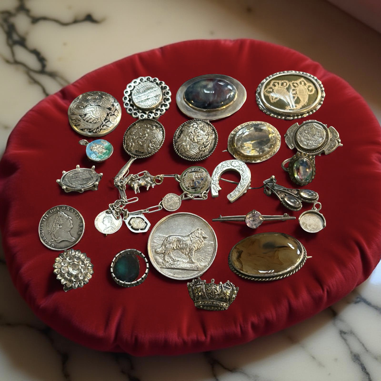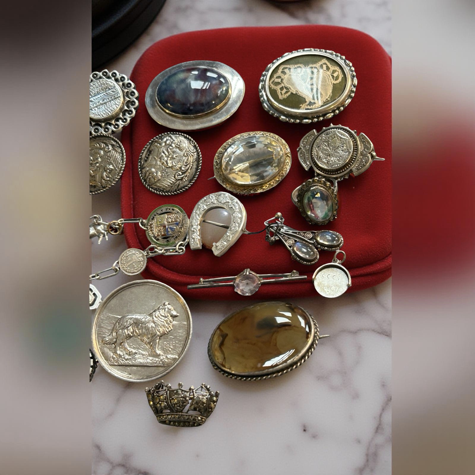 Additional brooches including a 1928 sheep dog trial medal mounted as a brooch and a quantity of other items.