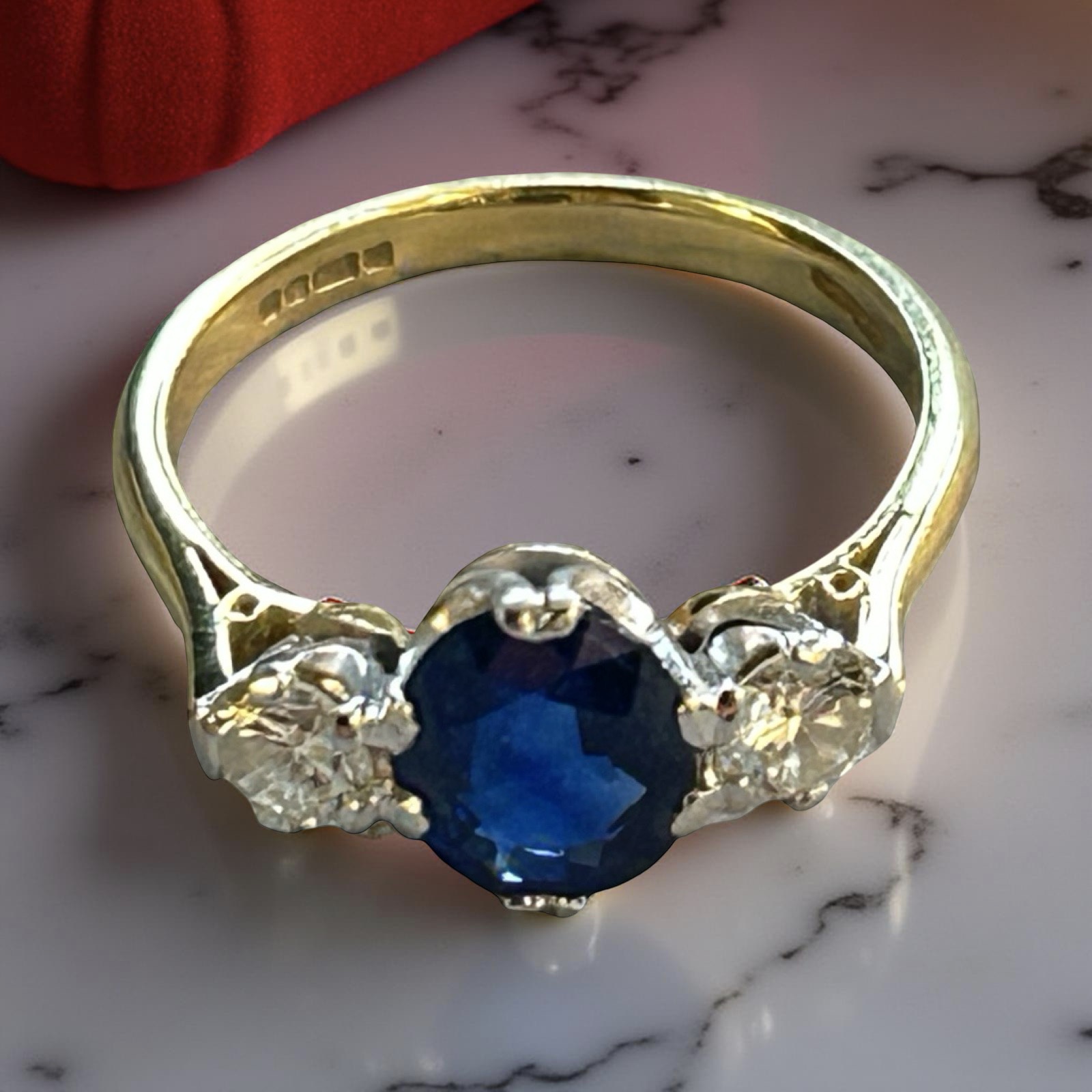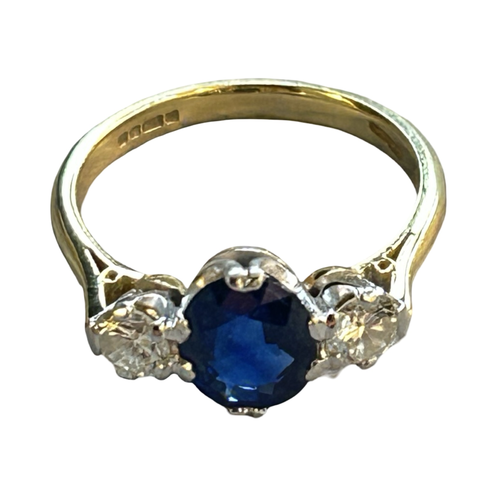 Central sapphire is approximately 2.0 ct and the flanking diamonds each approx 0.25 ct