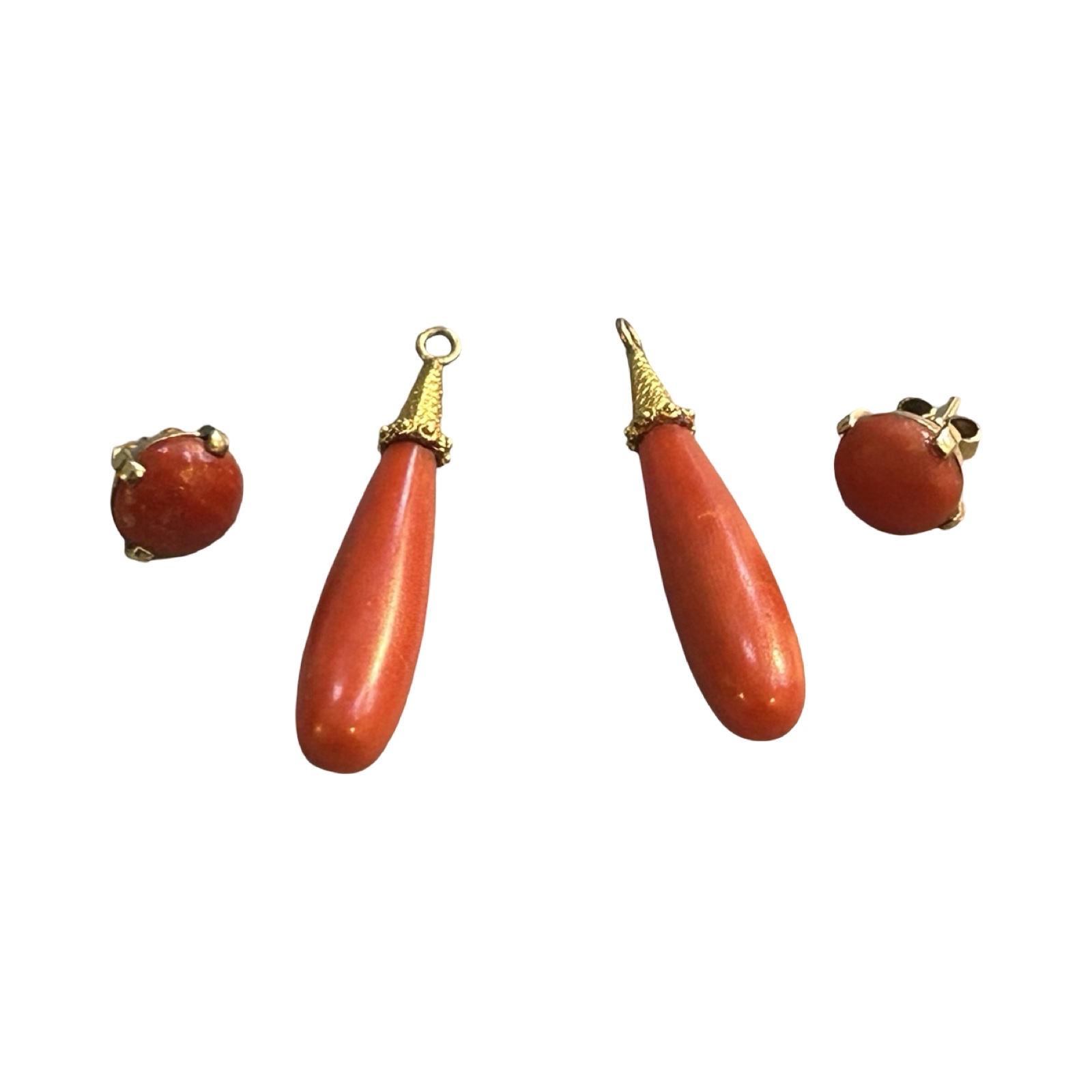 1 x 18 ct gold set torpedo coral earrings, drop 4 cm approx (missing ear wires)