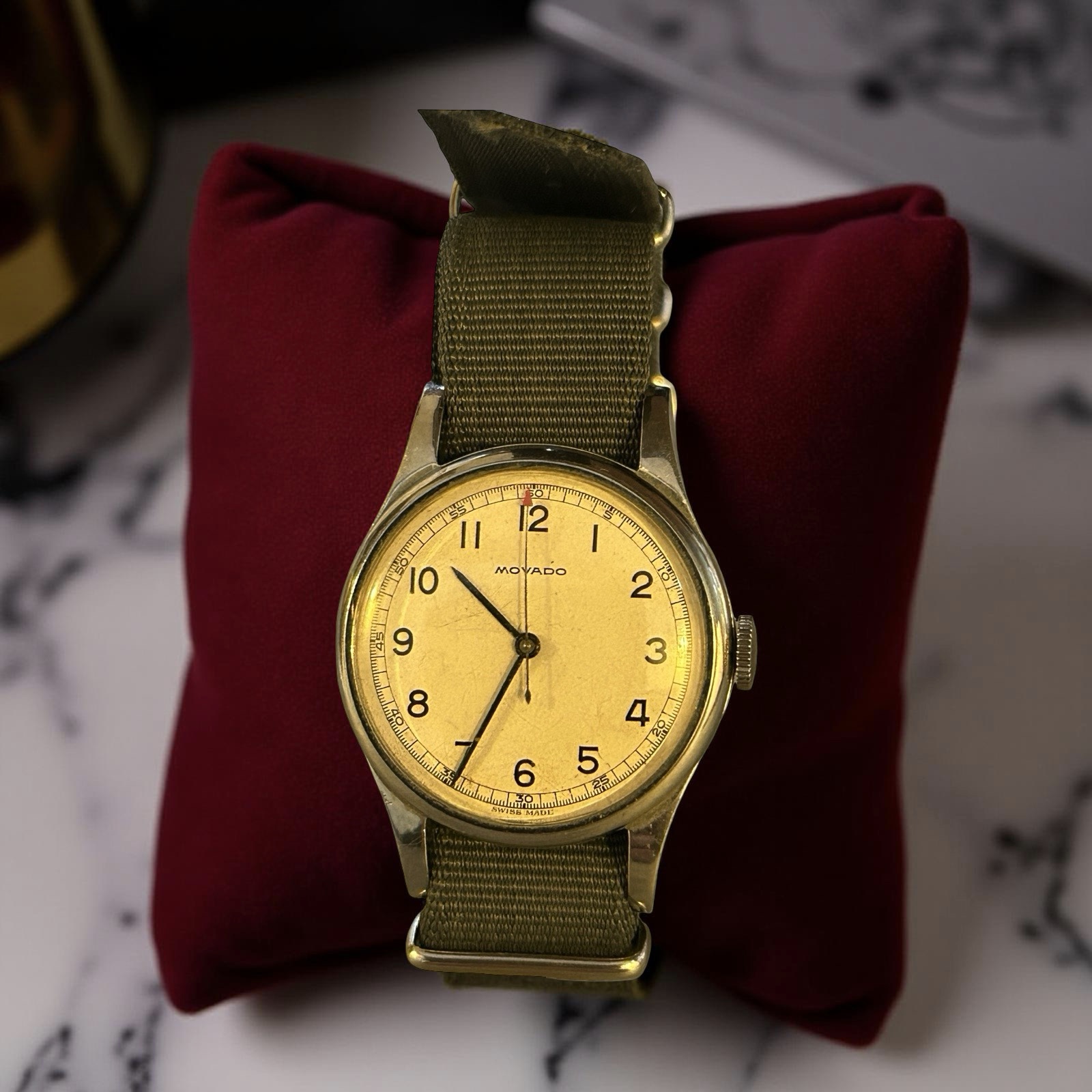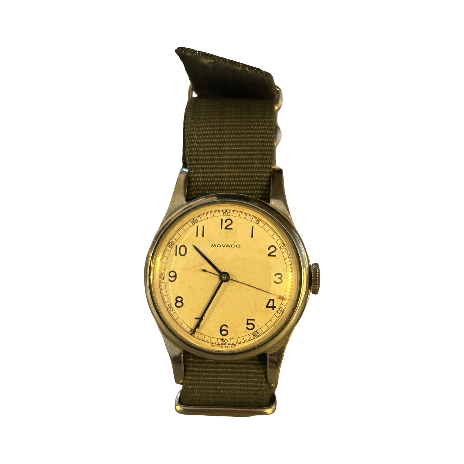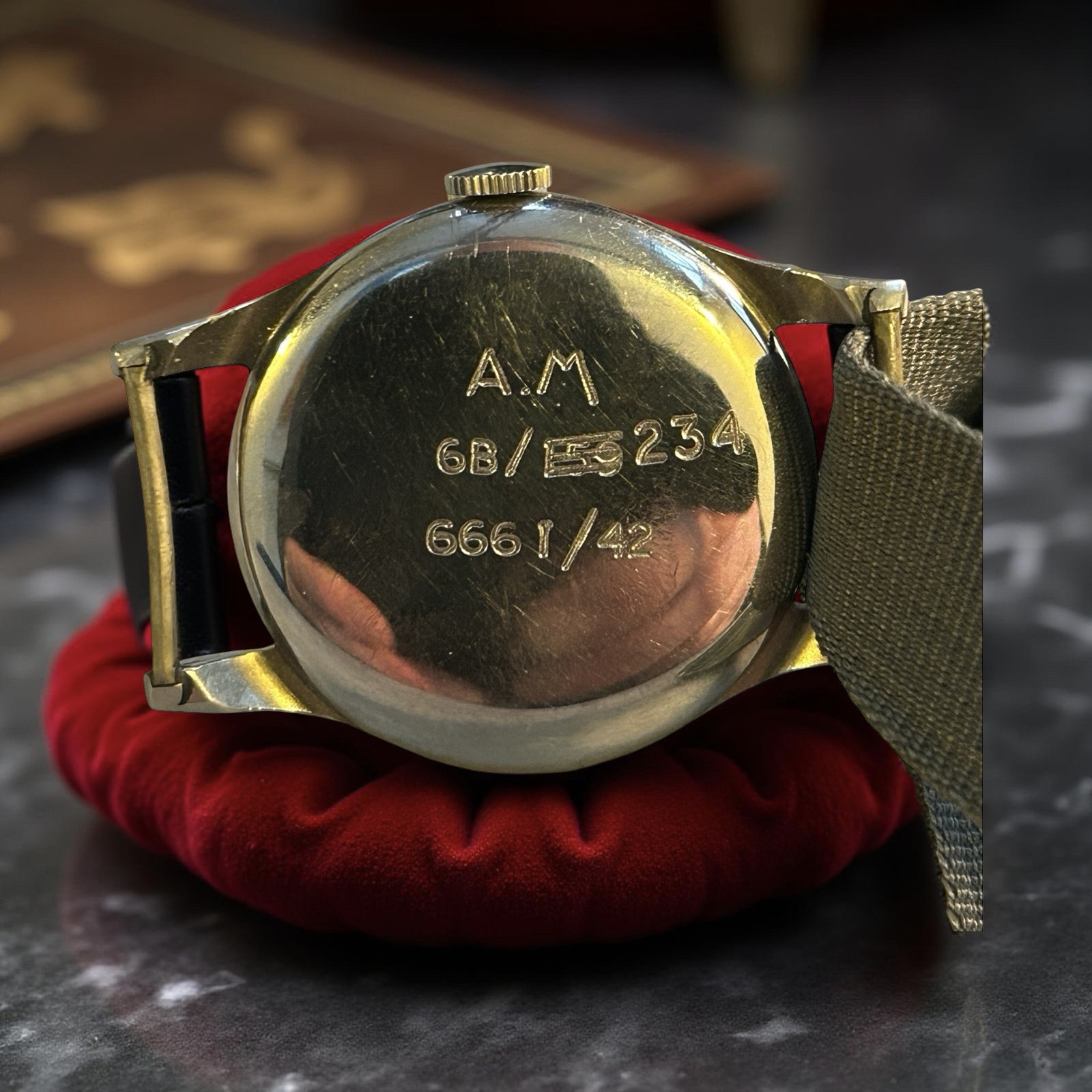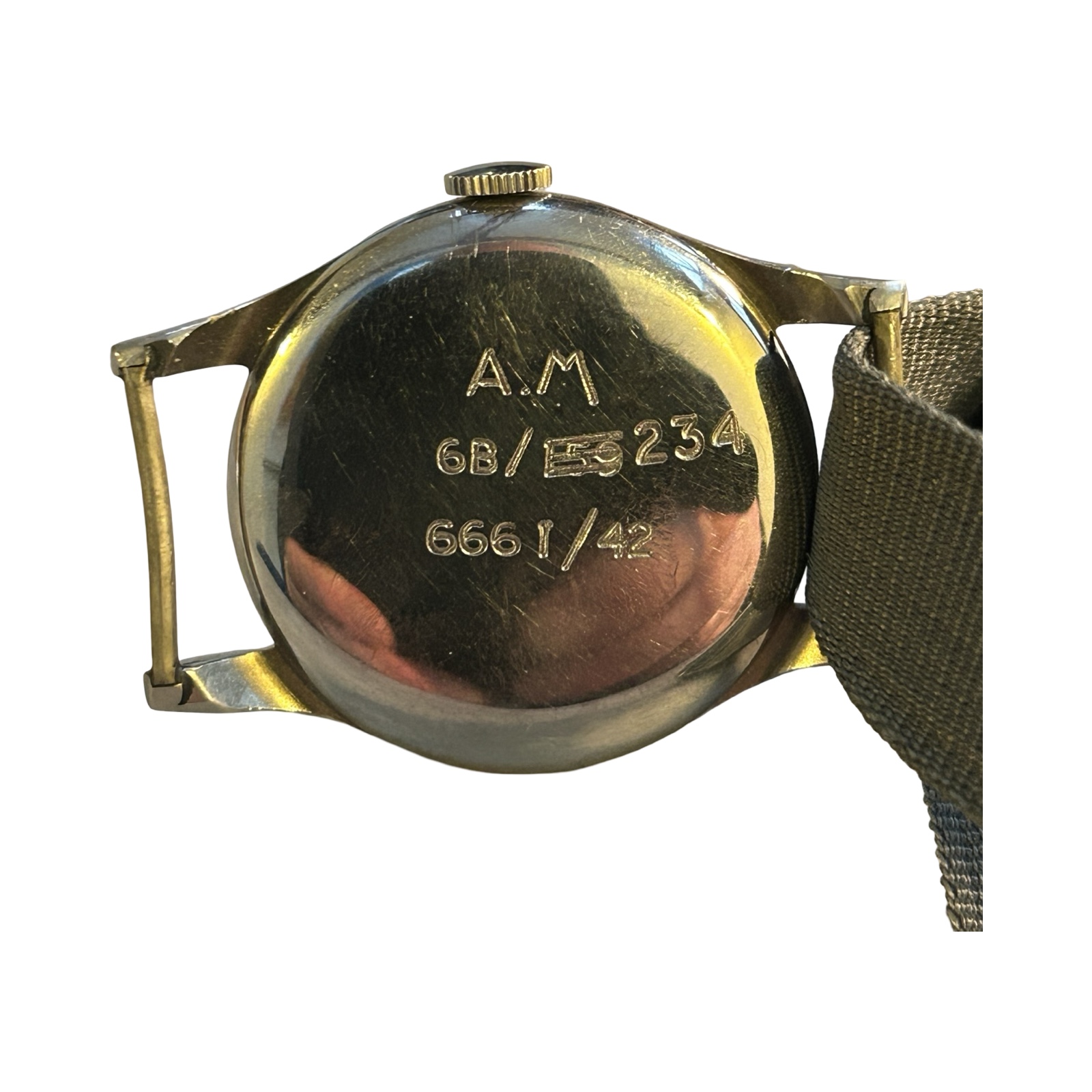 A white dial with arabic numerals. 75 calibre movement. Reverse of case crossed out numbers 159. 159 was issued to pilots and navigators only but was later issued with reference 6B 234 and downgraded for general service or ground crew.