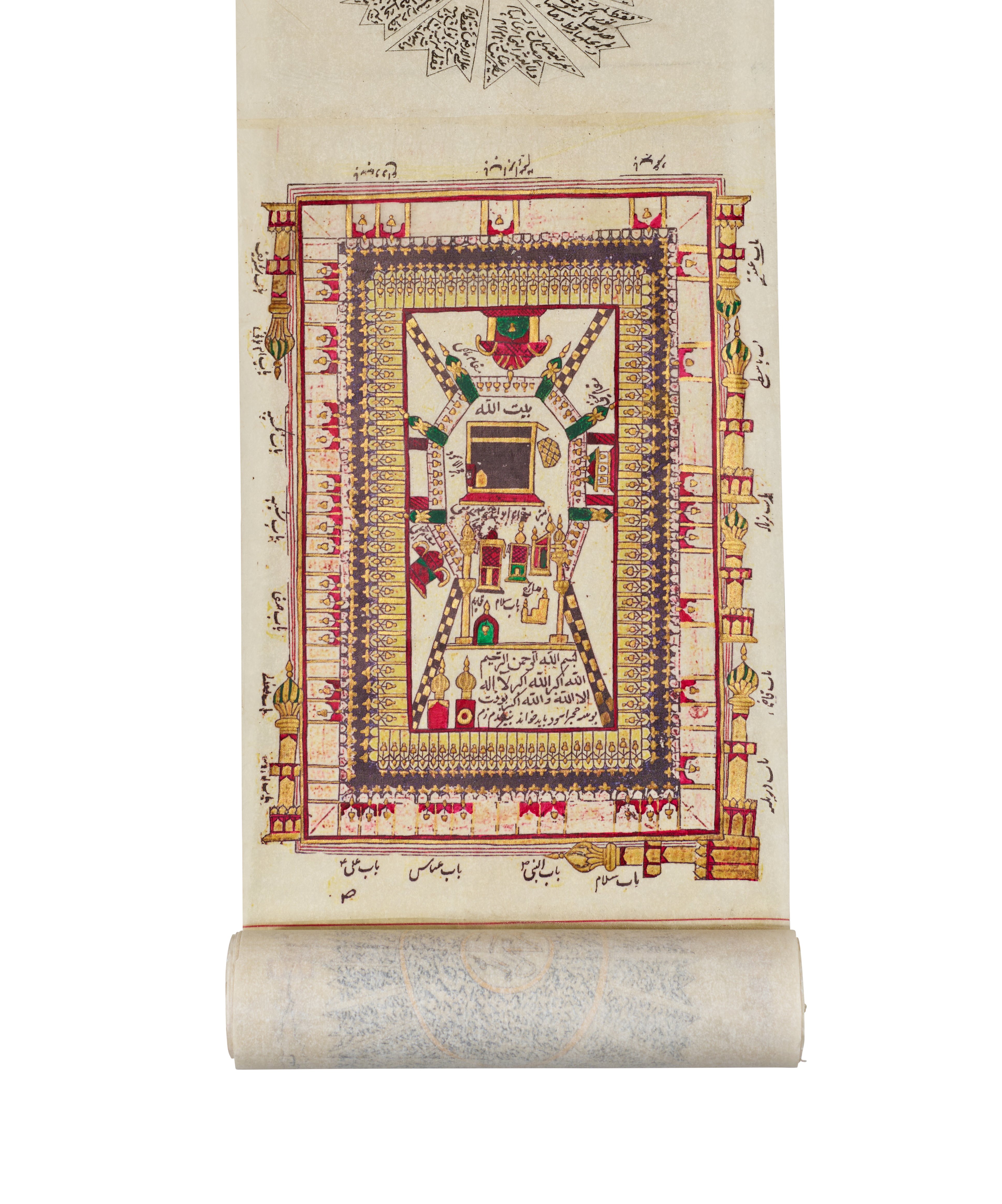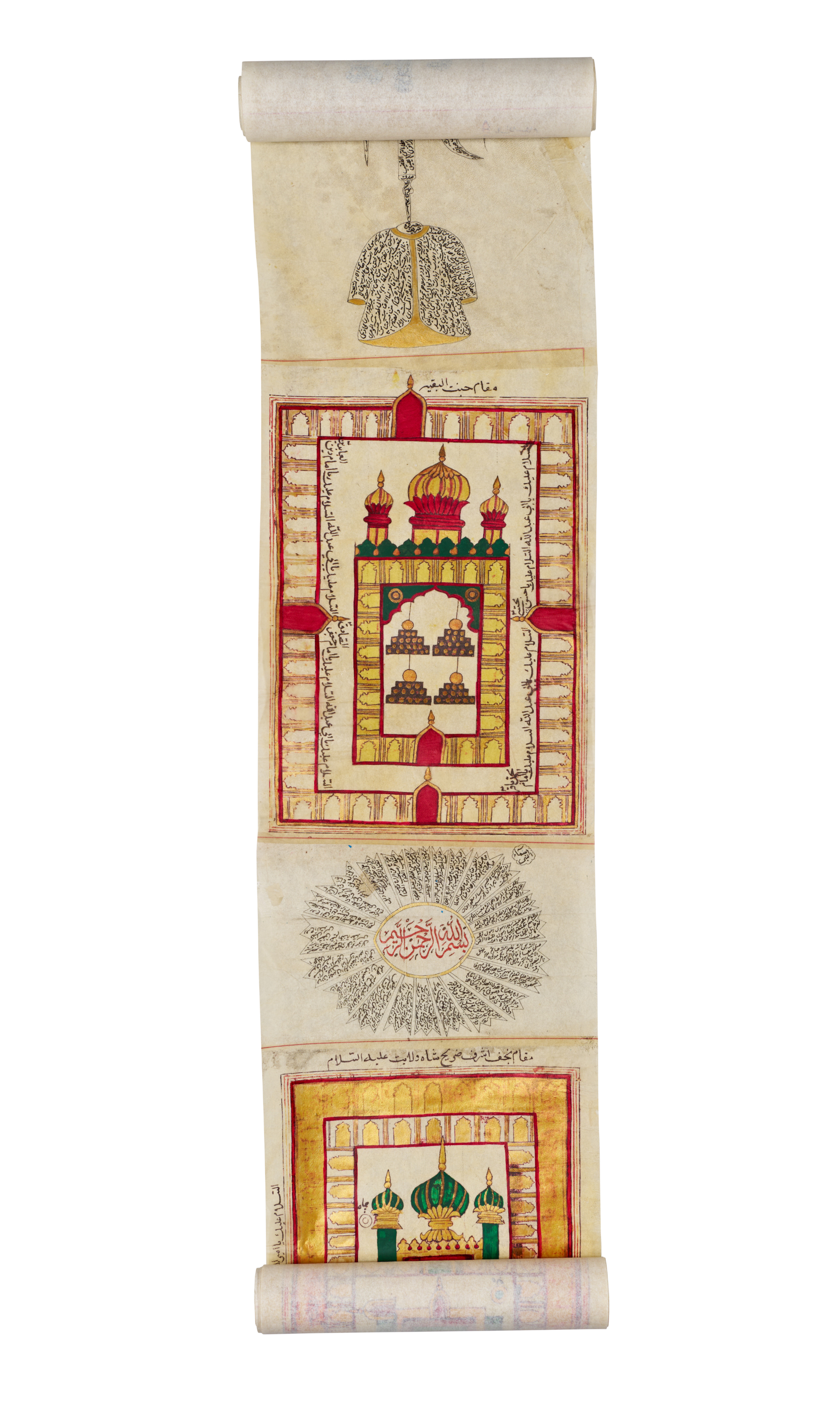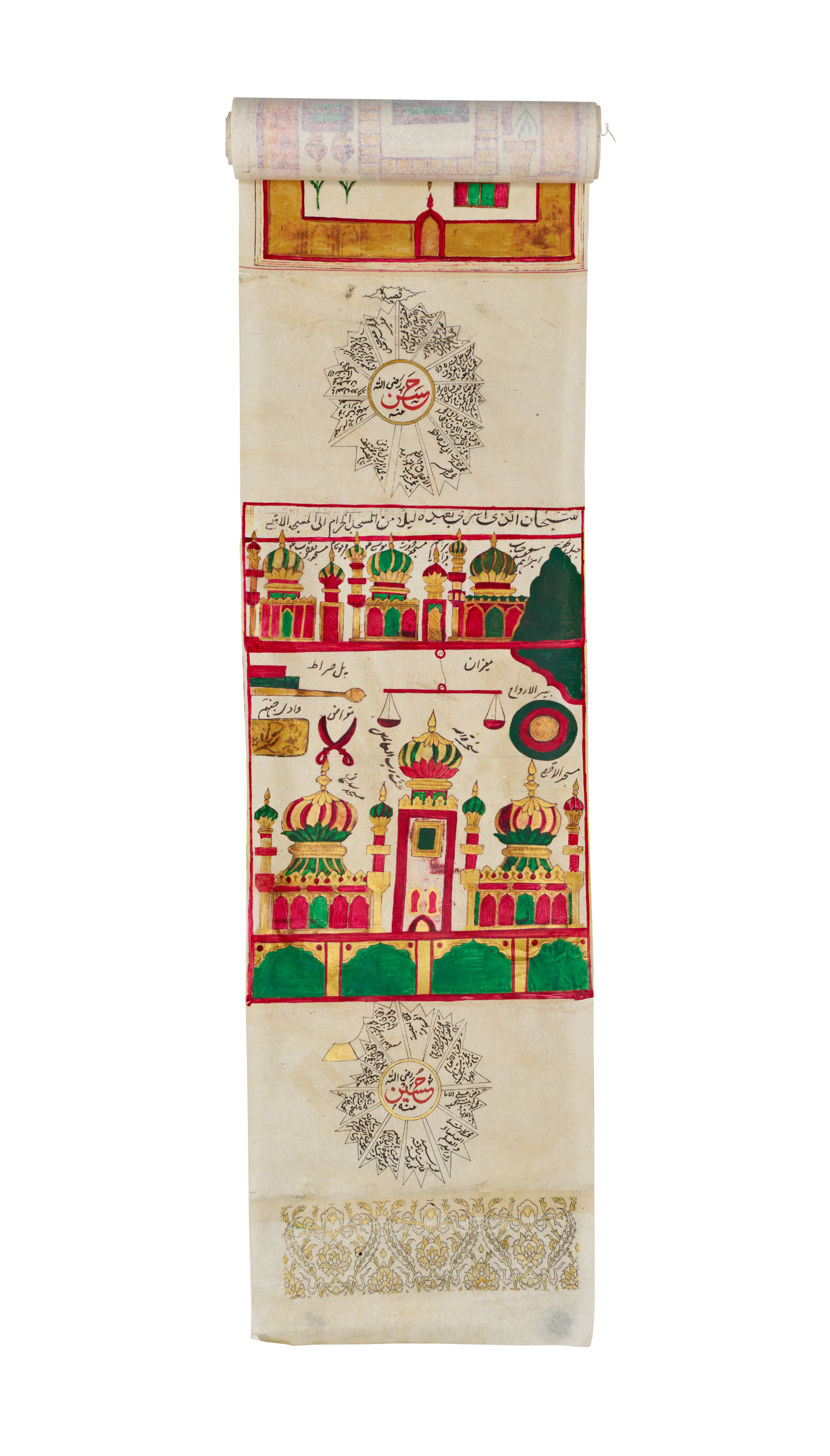 This richly illuminated and finely illustrated scroll depicts the Maqāmāt Muqaddasa—the Sacred Stations and holy sites revered throughout the Islamic world. Executed on rolled vellum or parchment-like paper, the scroll presents a vibrant sequence of architectural, symbolic, and calligraphic imagery rendered in bold pigments of red, green, yellow, and gold.