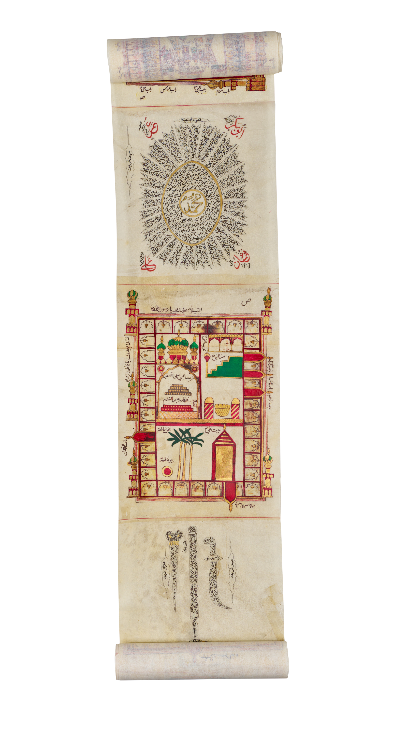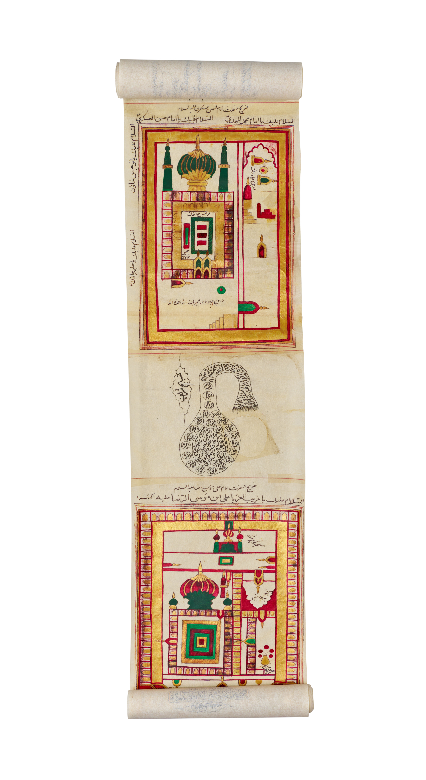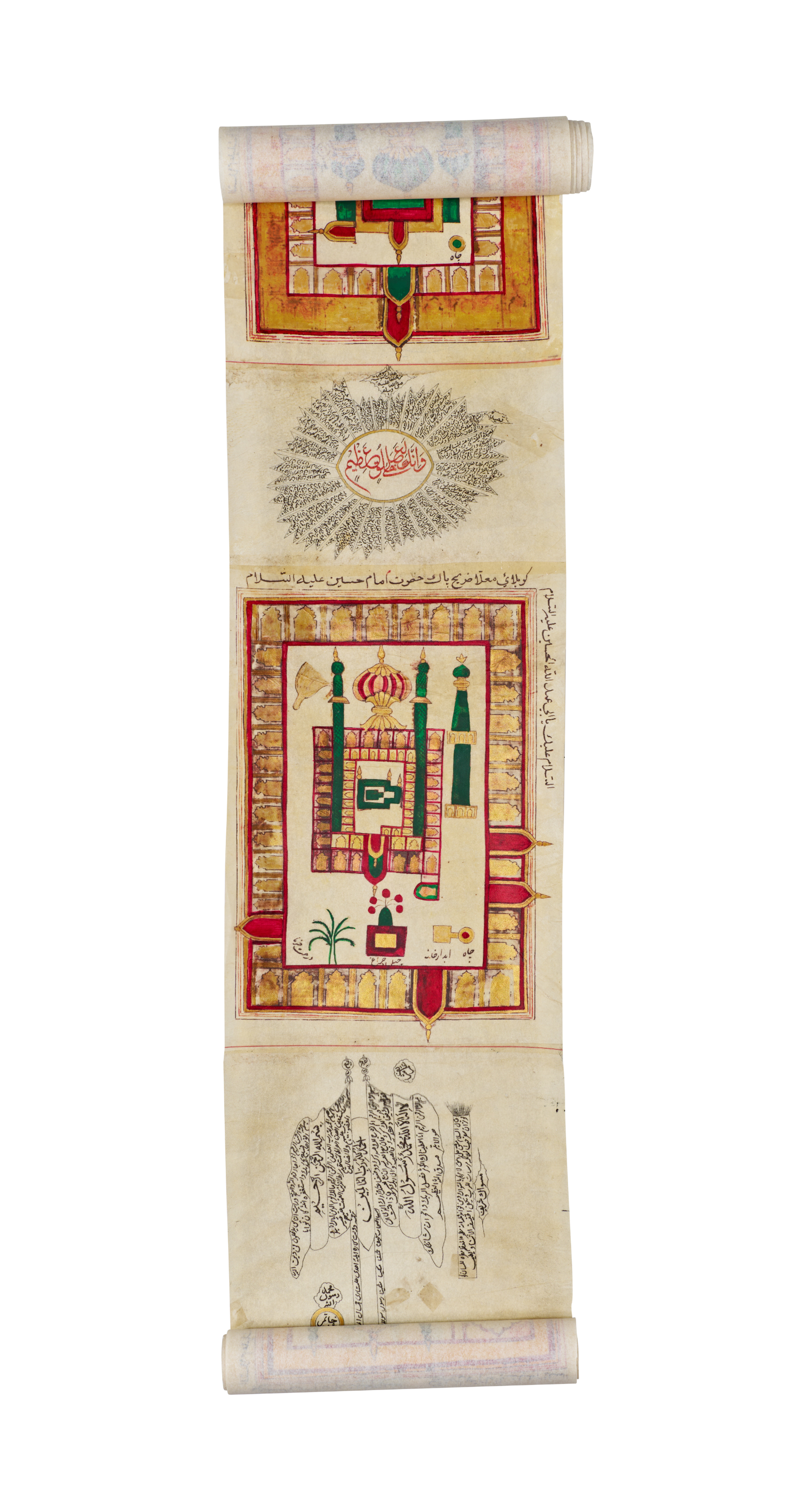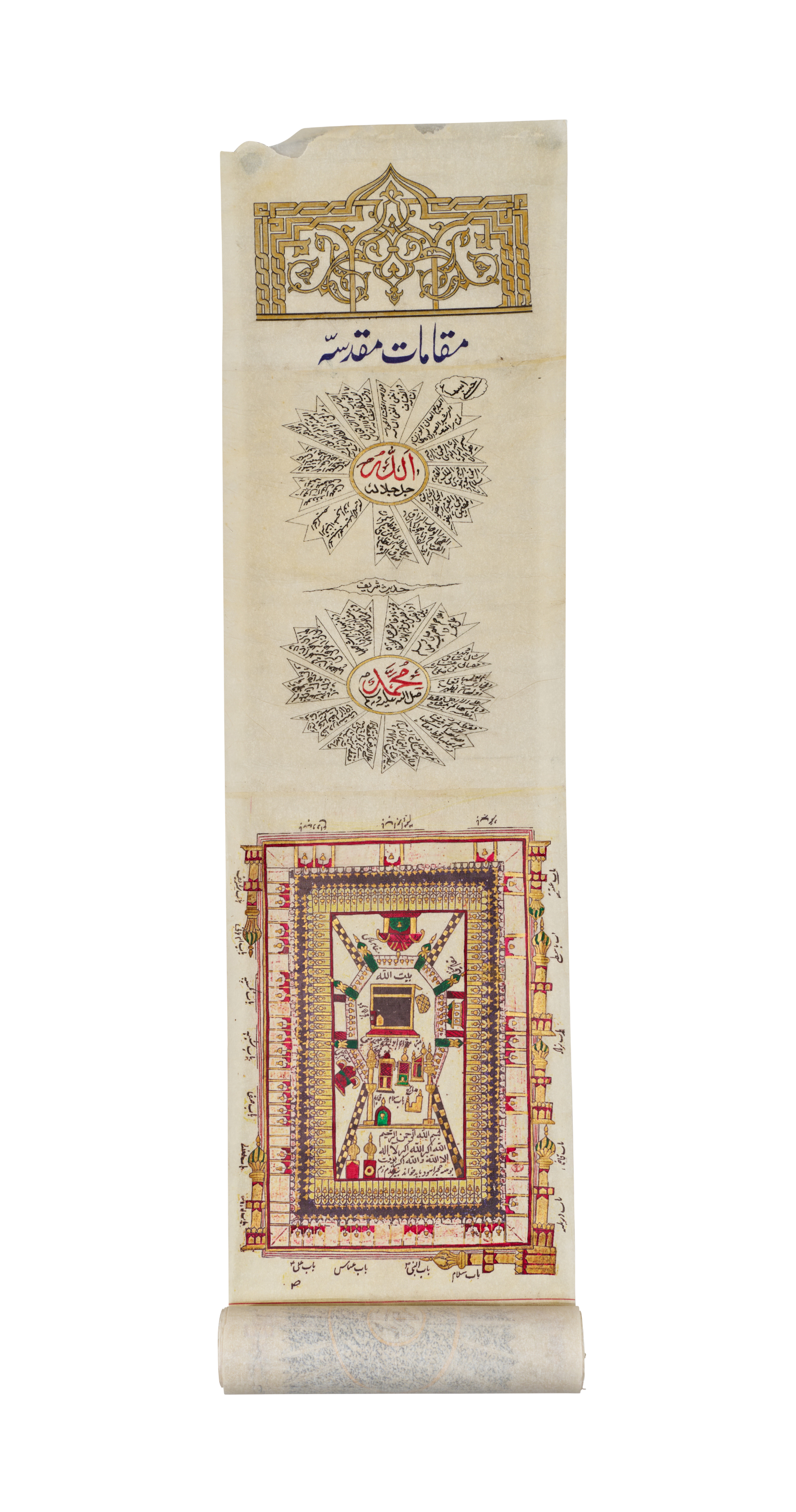 This richly illuminated and finely illustrated scroll depicts the Maqāmāt Muqaddasa—the Sacred Stations and holy sites revered throughout the Islamic world. Executed on rolled vellum or parchment-like paper, the scroll presents a vibrant sequence of architectural, symbolic, and calligraphic imagery rendered in bold pigments of red, green, yellow, and gold.