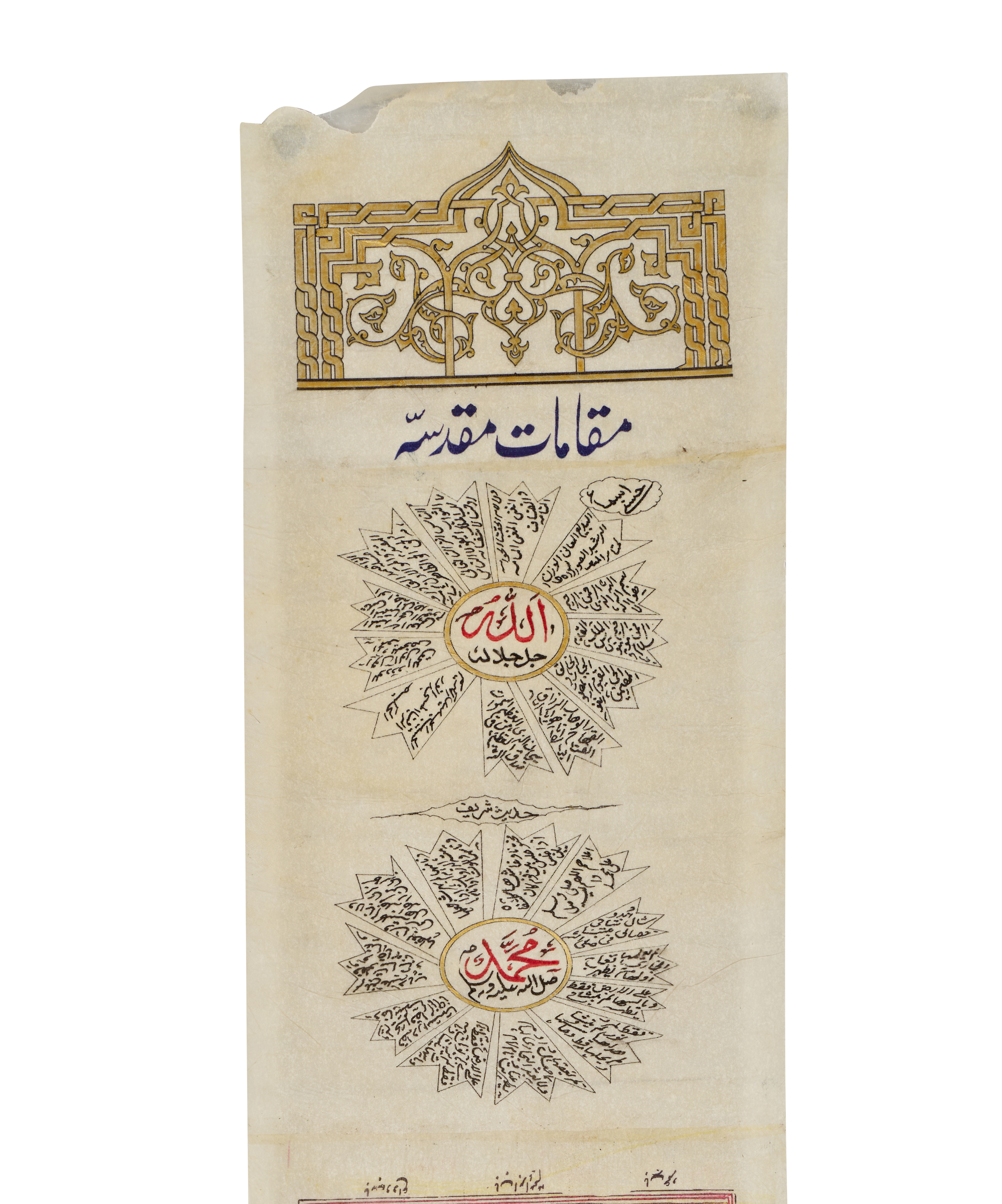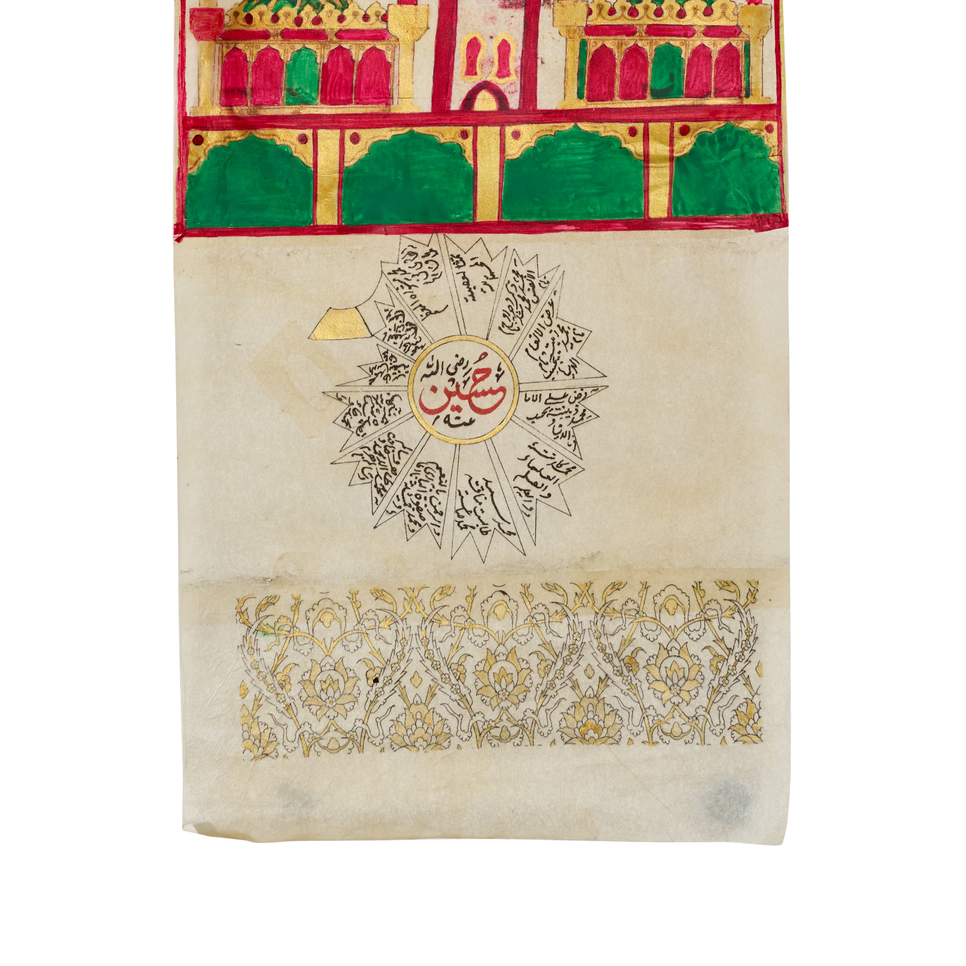 The scroll concludes with additional talismanic and decorative motifs, demonstrating a harmonious blend of religious devotion, artistic tradition, and manuscript craftsmanship. Well-preserved and visually striking, this Maqāmāt Muqaddasa scroll embodies the enduring cultural and spiritual significance of Islamic pilgrimage imagery in the 20th century, making it a meaningful and collectible devotional artifact.