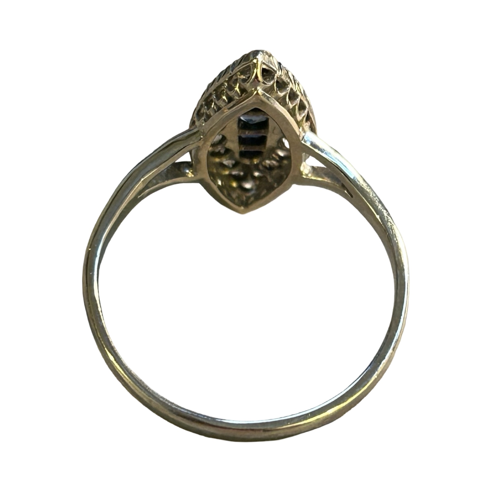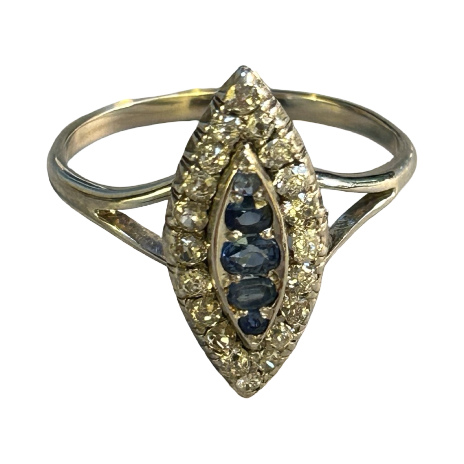The shank tests as 14 ct white gold and the head tests as 18ct white gold set with 4 sapphires surrounded with diamonds with the diamonds having an approximate carat size of approx 0.4 carats. The diamond colour is approximately L/M and colour SI 2. Condition good.