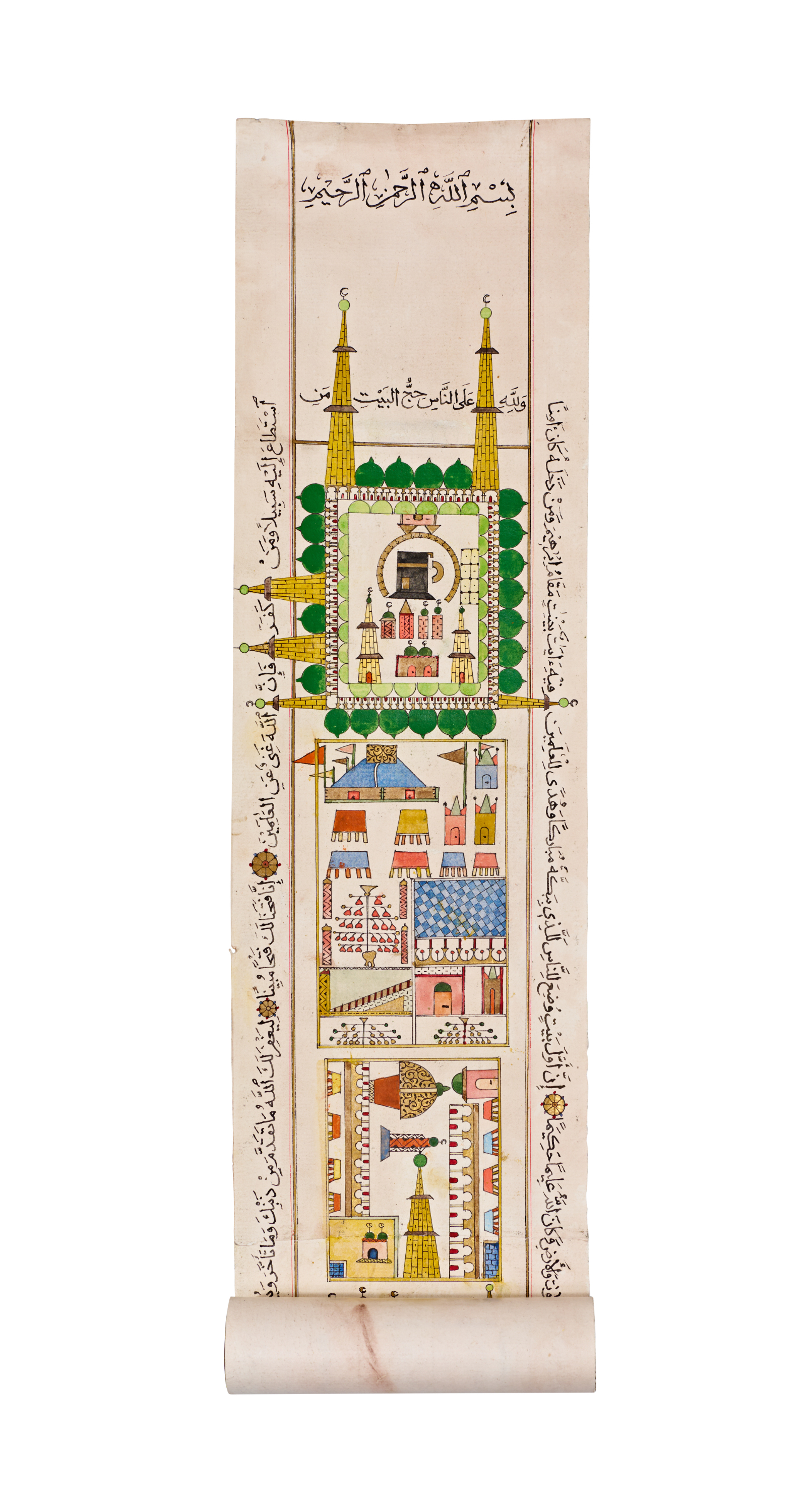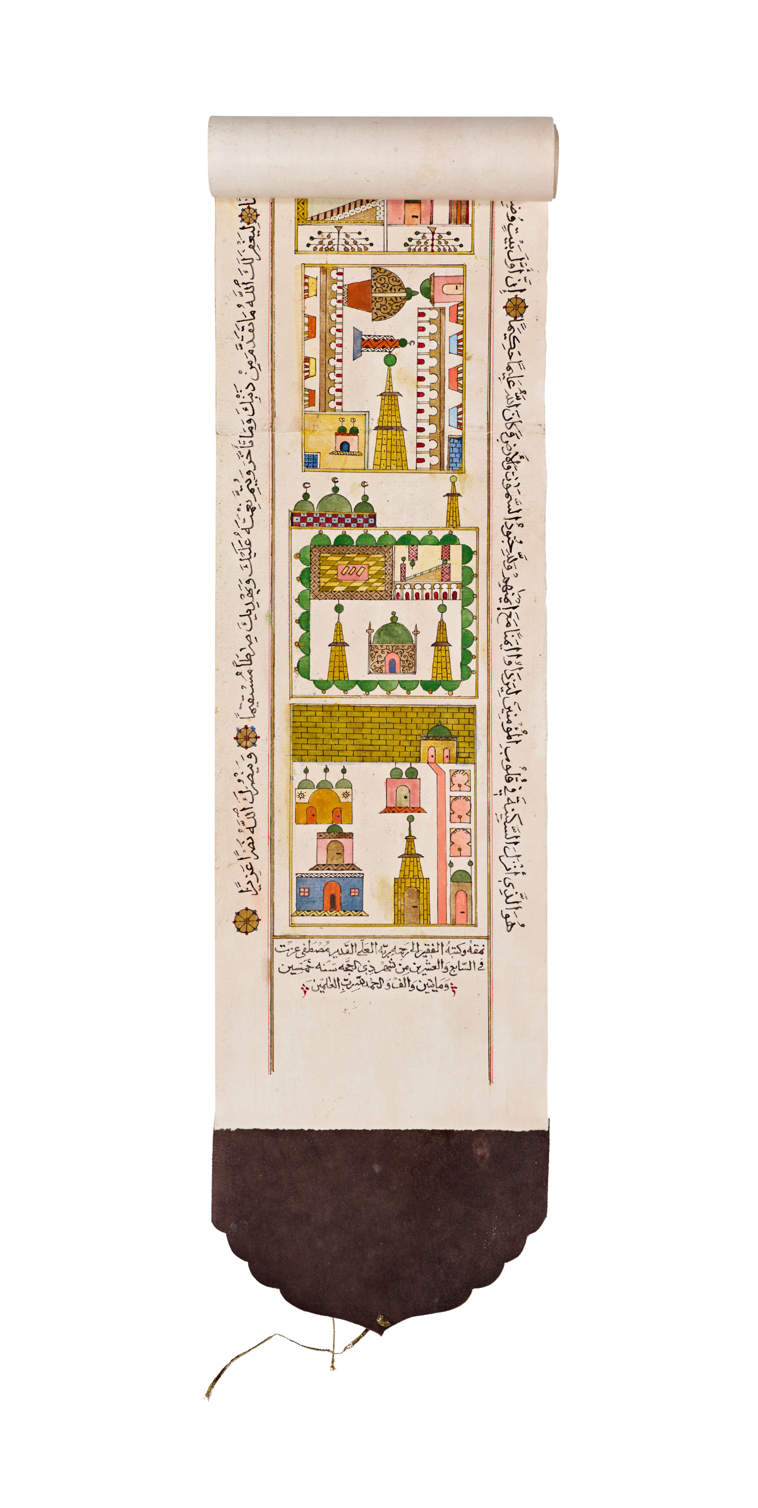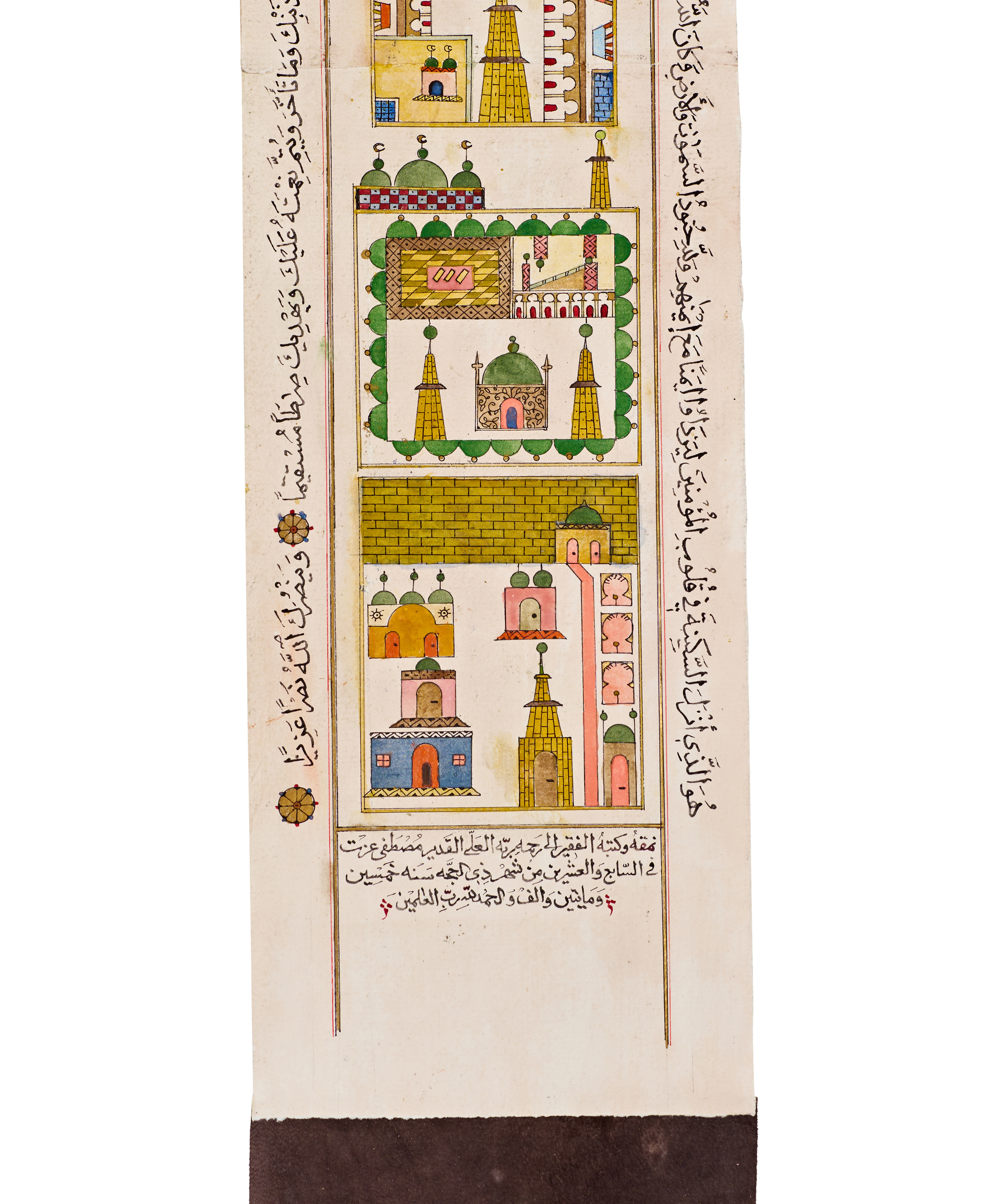 This exceptionally well-preserved illuminated Hajj map scroll presents a beautifully detailed visual guide to the holy sites associated with the pilgrimage. Signed by the artist Mustafa Izat and dated 1250 AH, the scroll unfolds vertically to reveal a sequence of vibrant architectural illustrations rendered in rich tones of green, yellow, red, and blue.