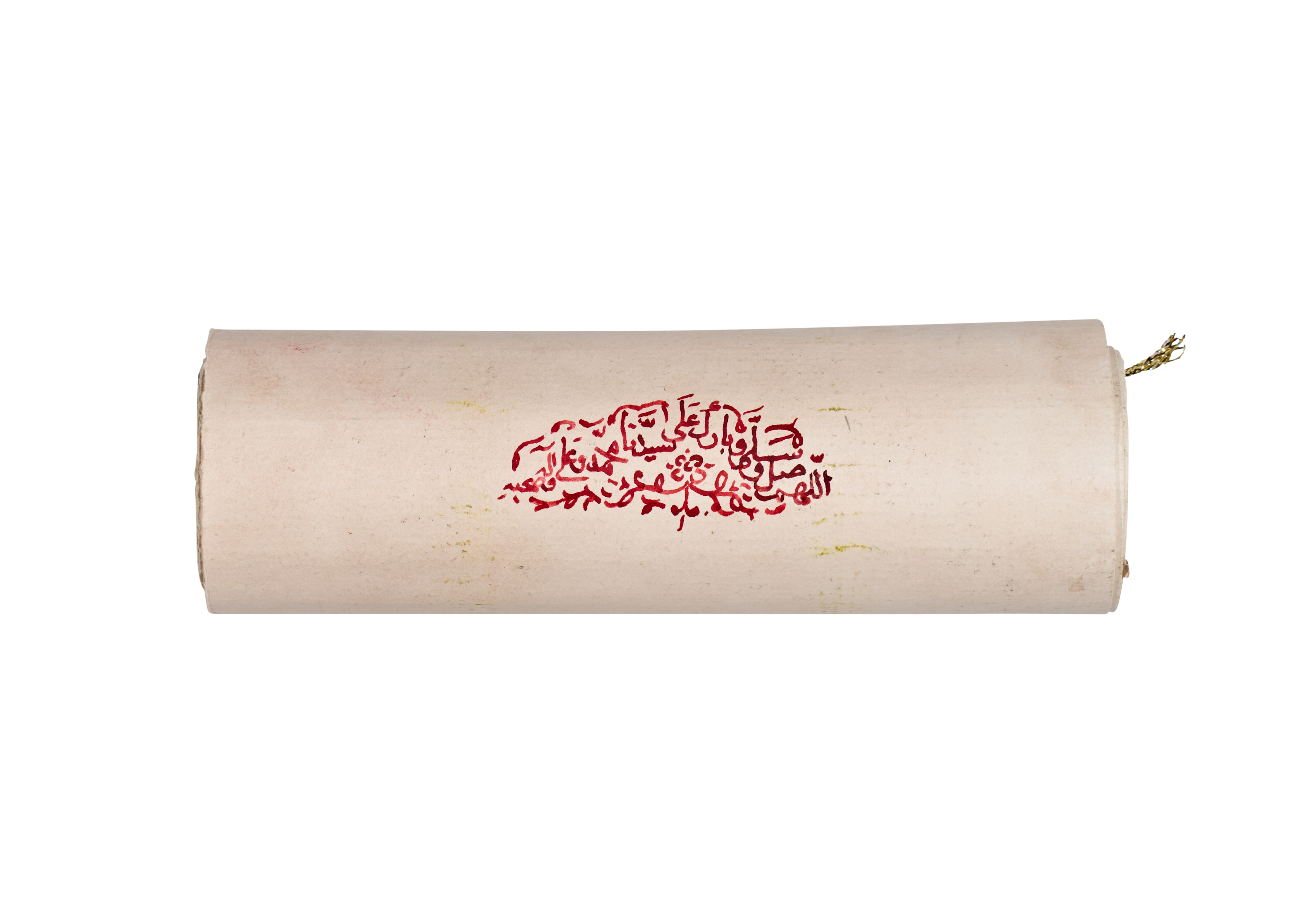 The lower portion of the scroll concludes with a dedicatory text, and the reverse bears a striking red seal impression or inscription. The scroll ends with its original scalloped leather backing and a cord for securing the rolled manuscript, both features typical of Ottoman and late Islamic devotional scrolls.