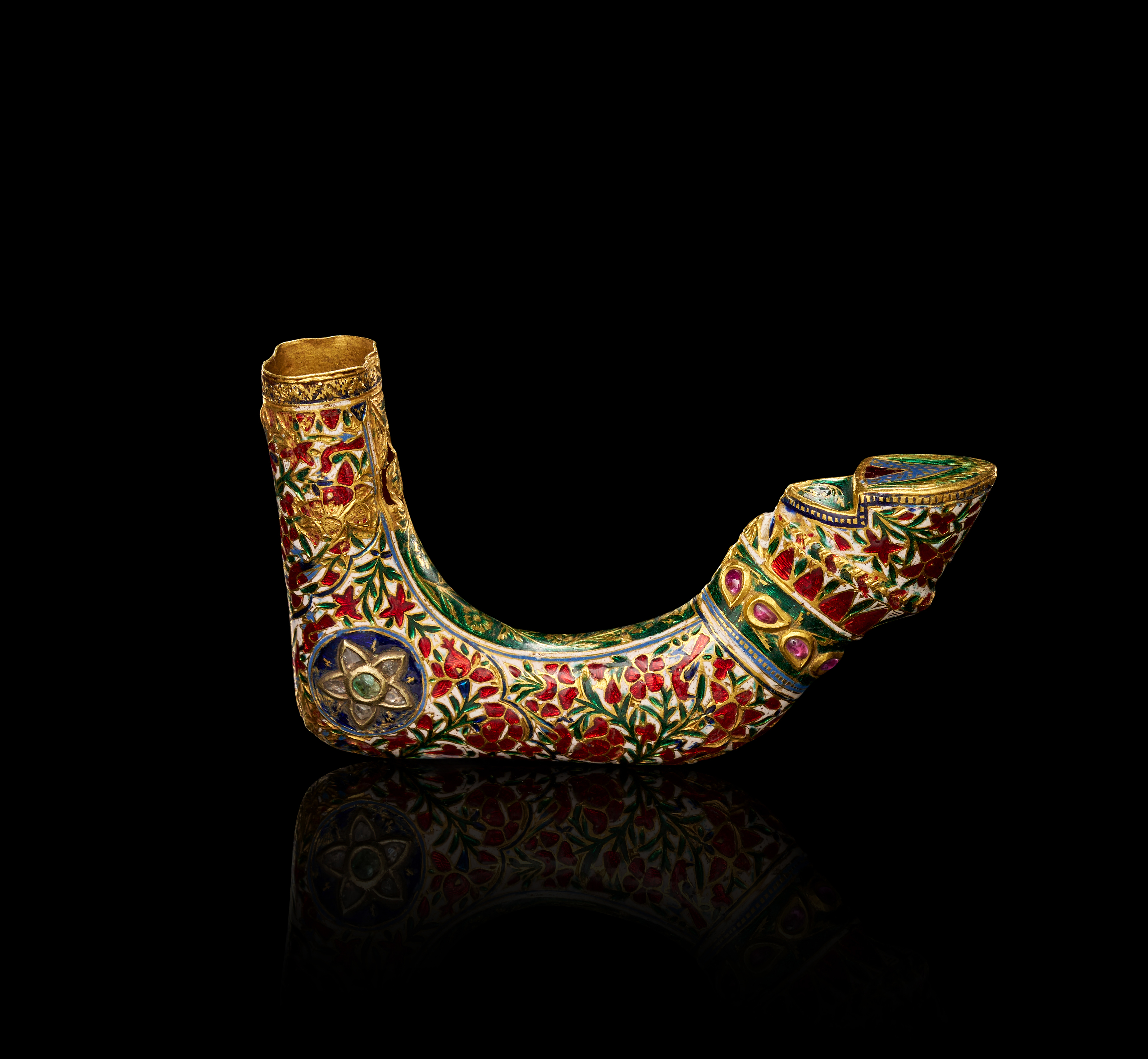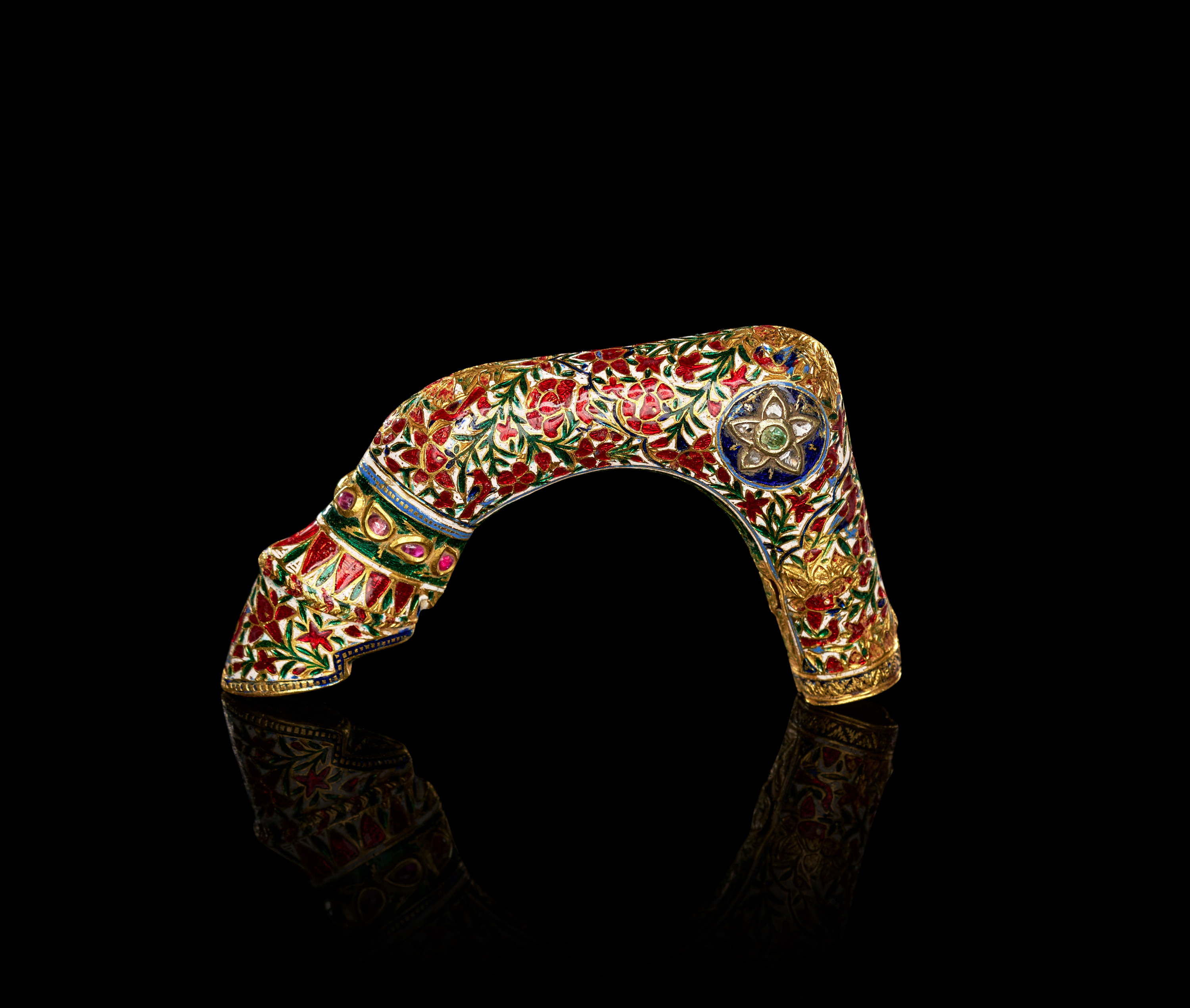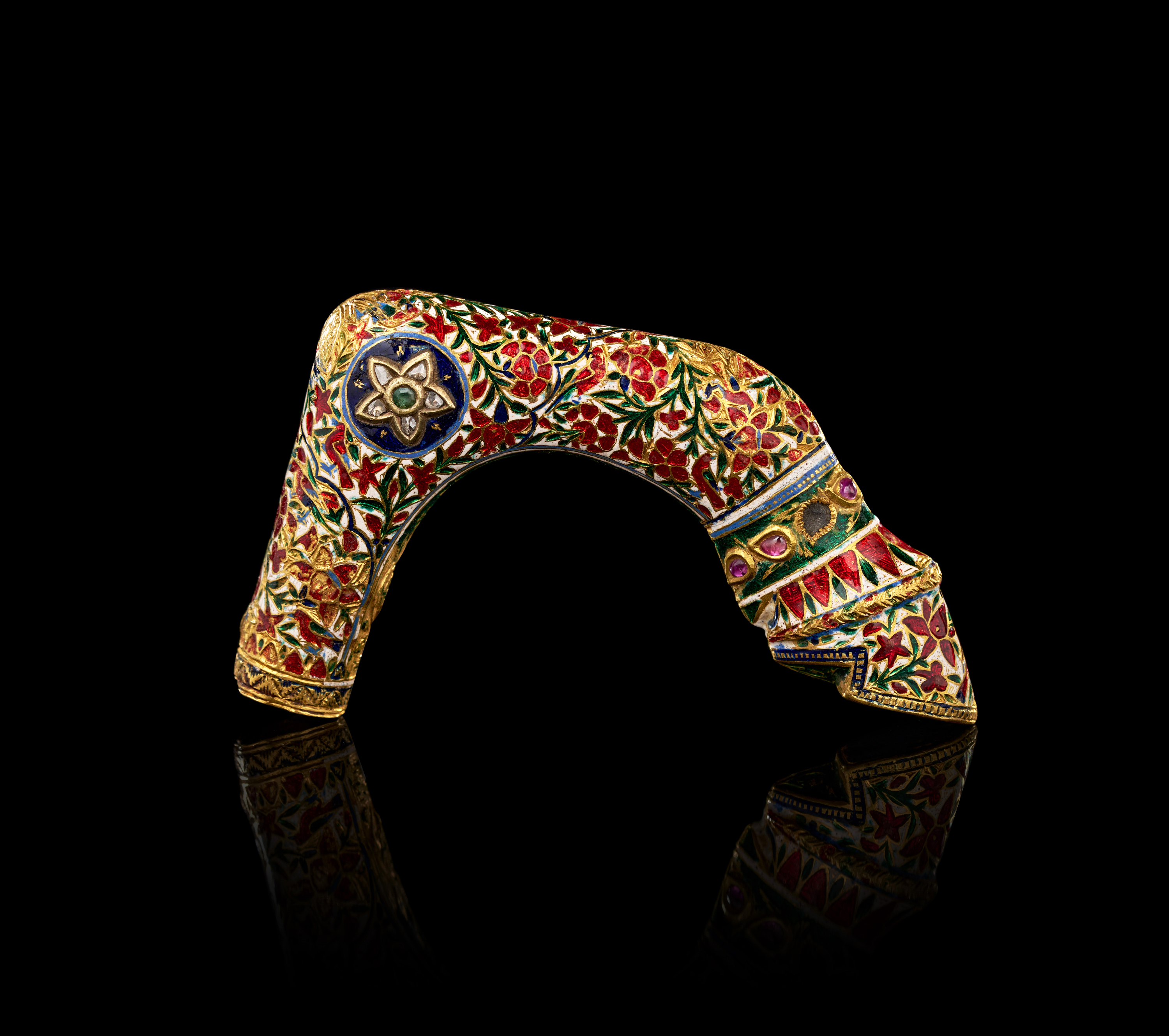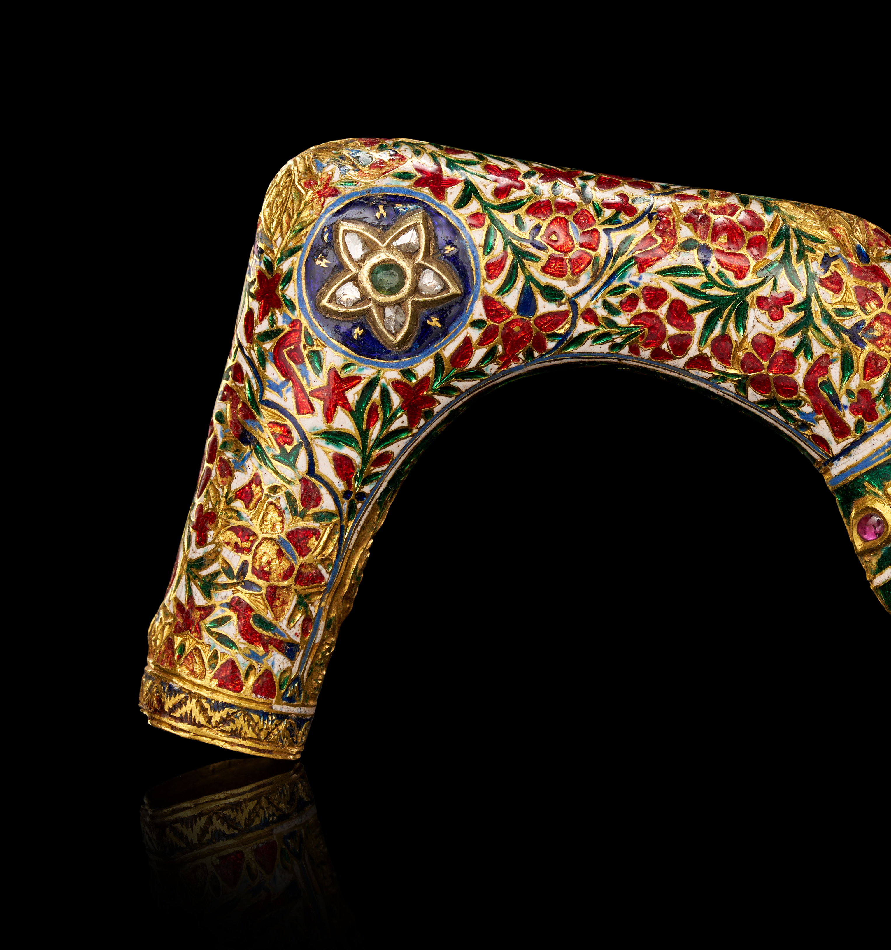 The object’s surface is fully decorated with dense enamelled patterns of intertwining vines and blossoms, symbolizing prosperity and eternal life. The top of the handle features a striking rosette motif centered with a green emerald and outlined with white petals, surrounded by red floral sprays against a white ground. Gold detailing accentuates every contour, giving the piece a radiant luminosity.
