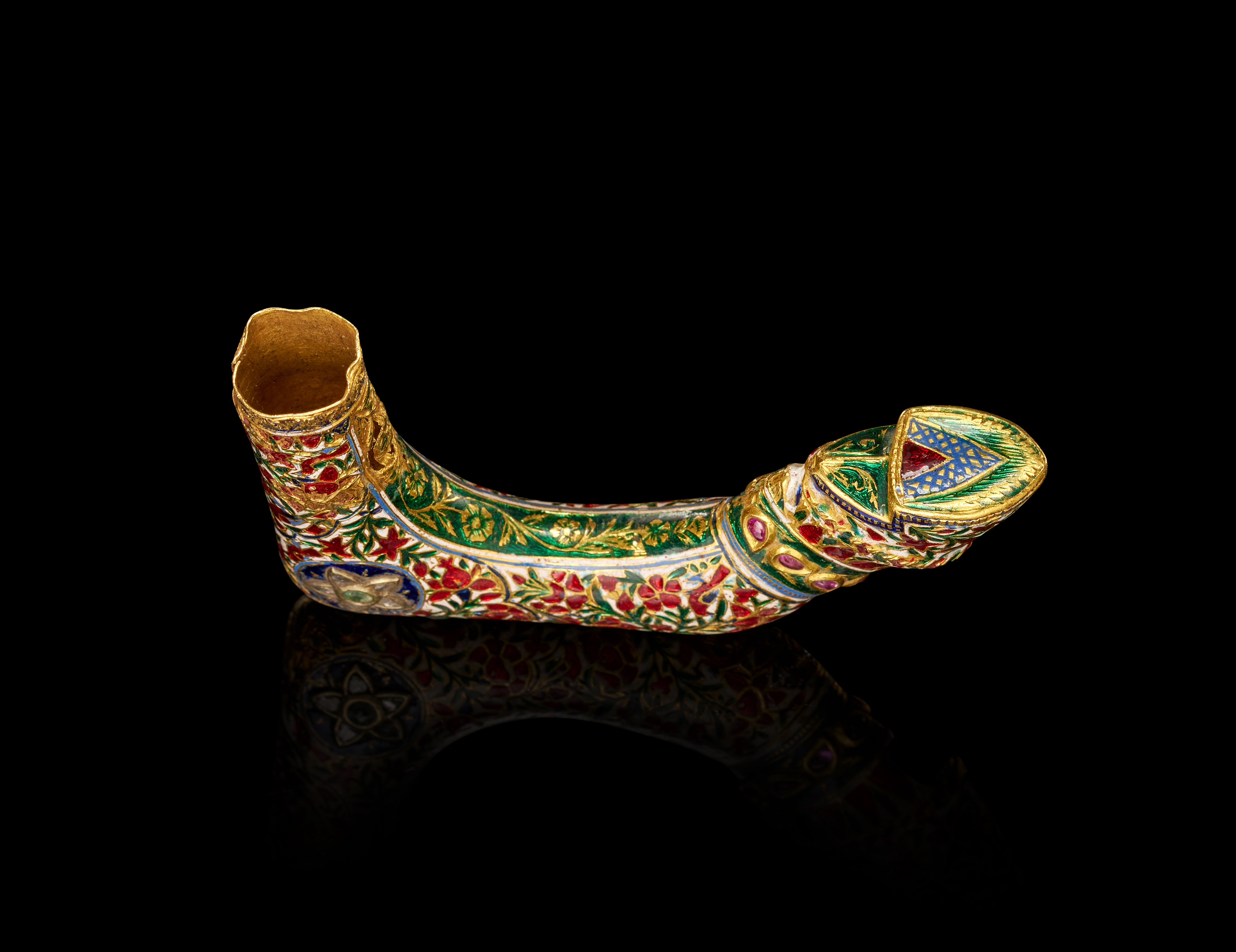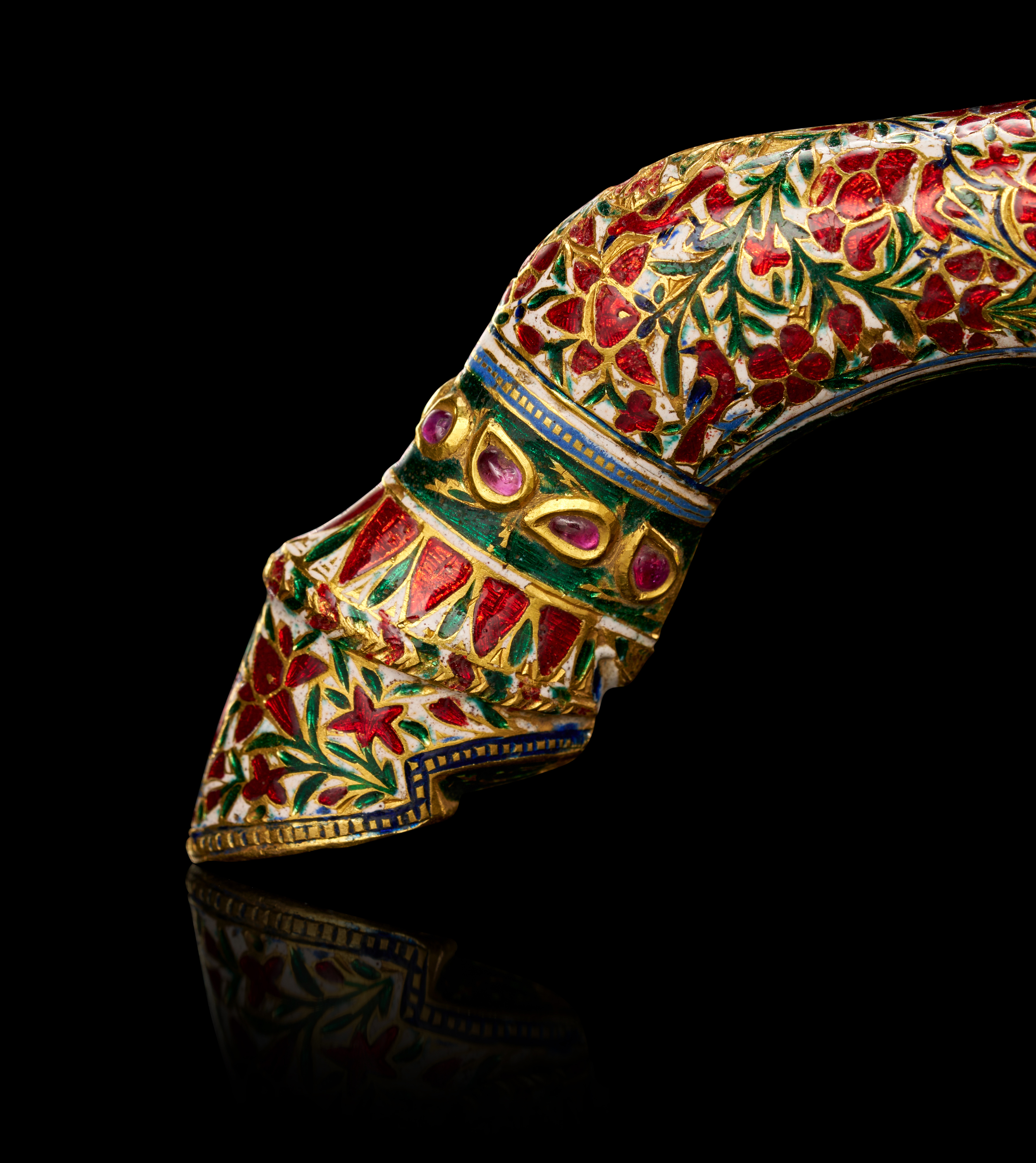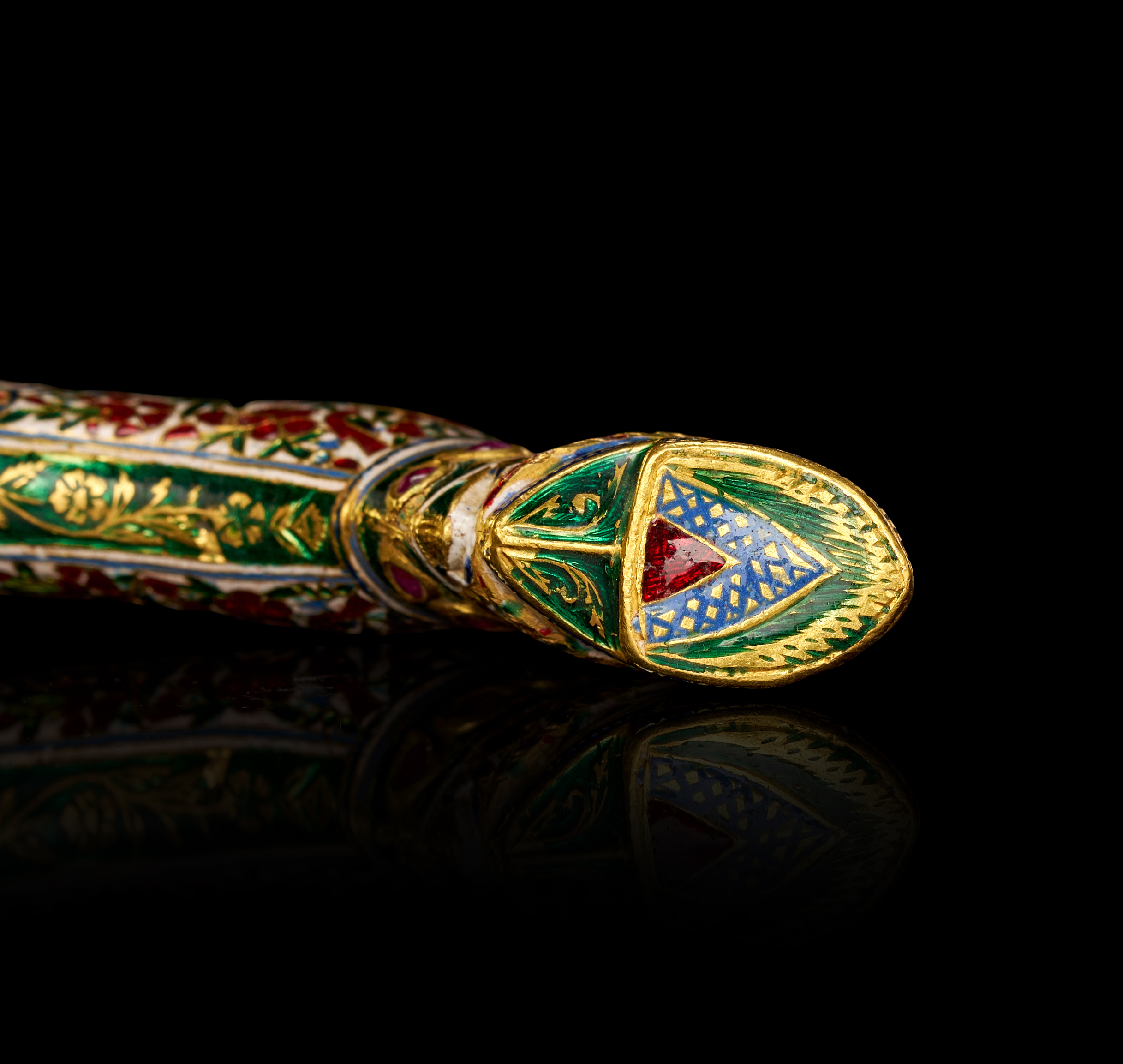 The curved form of the handle demonstrates both elegance and ergonomic sophistication, while the underside reveals fine champlevé enamel work in geometric motifs of blue and green with a central red triangle — a testament to the artistry and technical mastery of Indian goldsmiths of the period.