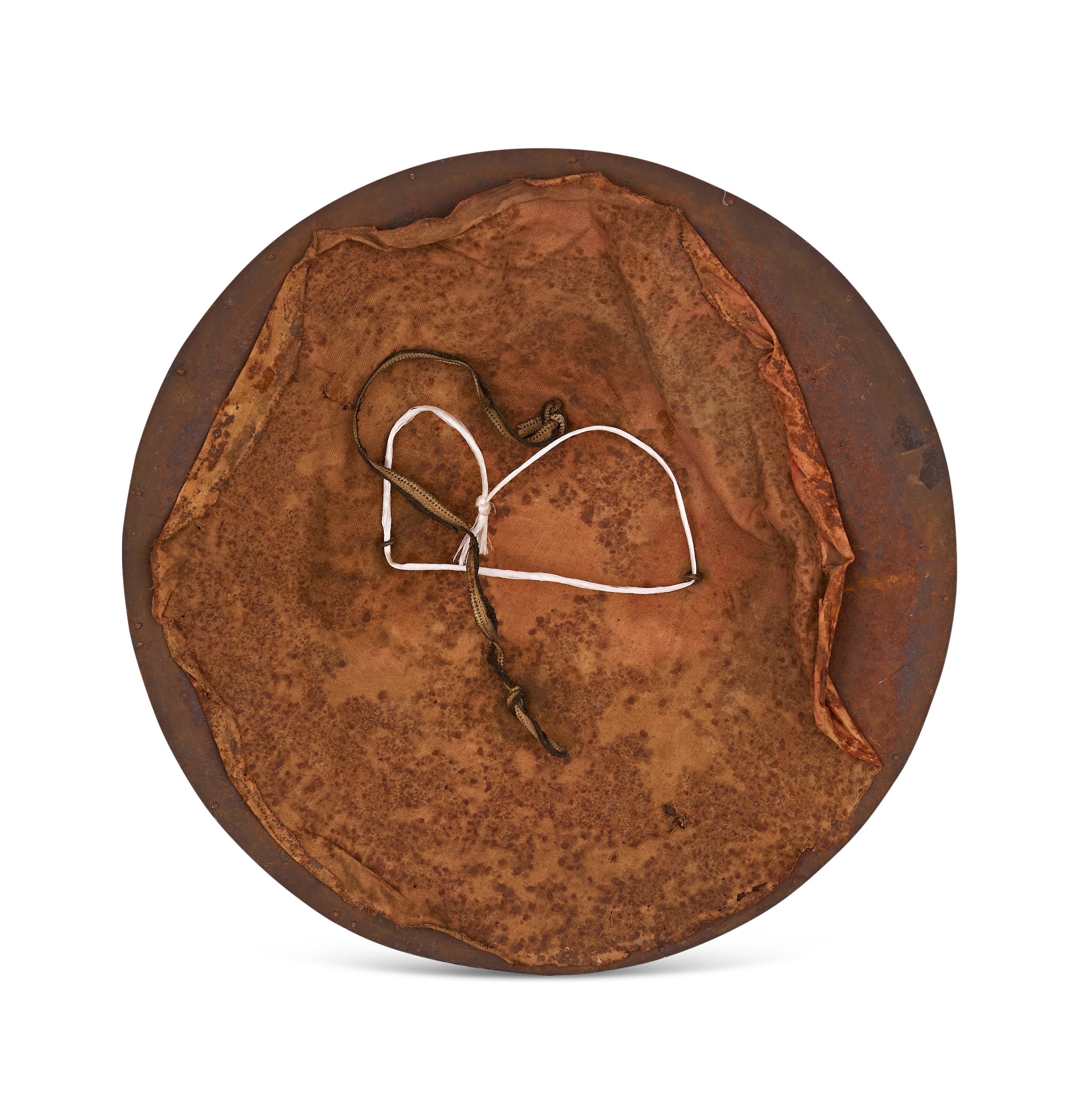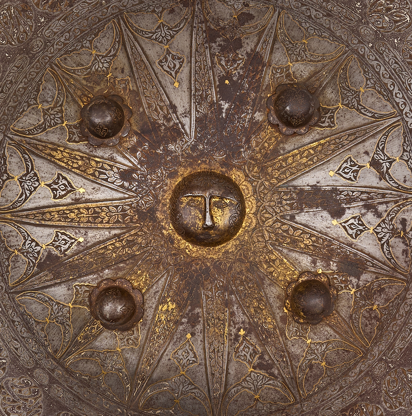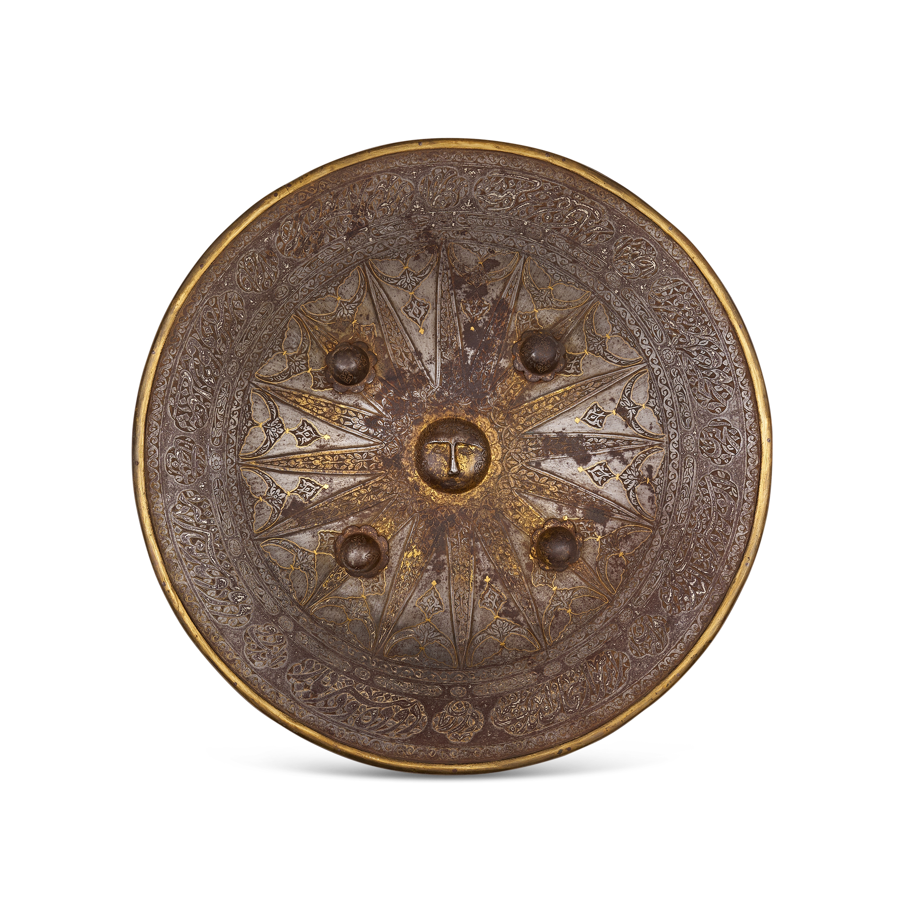 A finely crafted Persian steel shield (separ) from the Qajar period, lavishly decorated with extensive gold damascening. The convex circular surface is centred by a raised boss surrounded by four prominent domed appliqués, each bordered with traces of gilt. Radiating from the centre are alternating panels of geometric and foliate motifs, meticulously inlaid in gold and arranged in a starburst pattern. The outer register is encircled by a dense band of scrolling arabesques, calligraphic cartouches, and stylised palmettes, all executed with characteristic Qajar finesse.