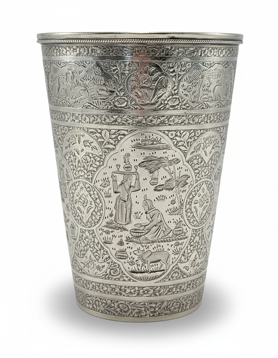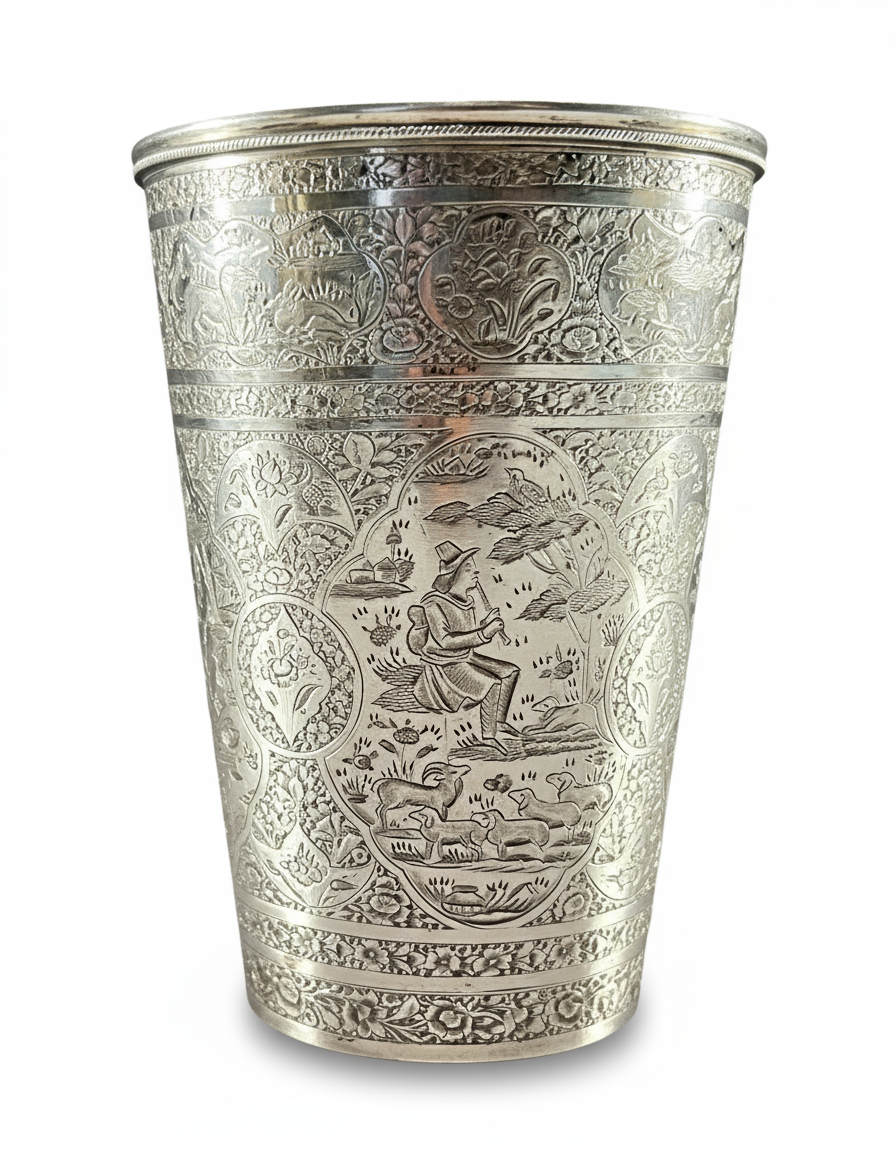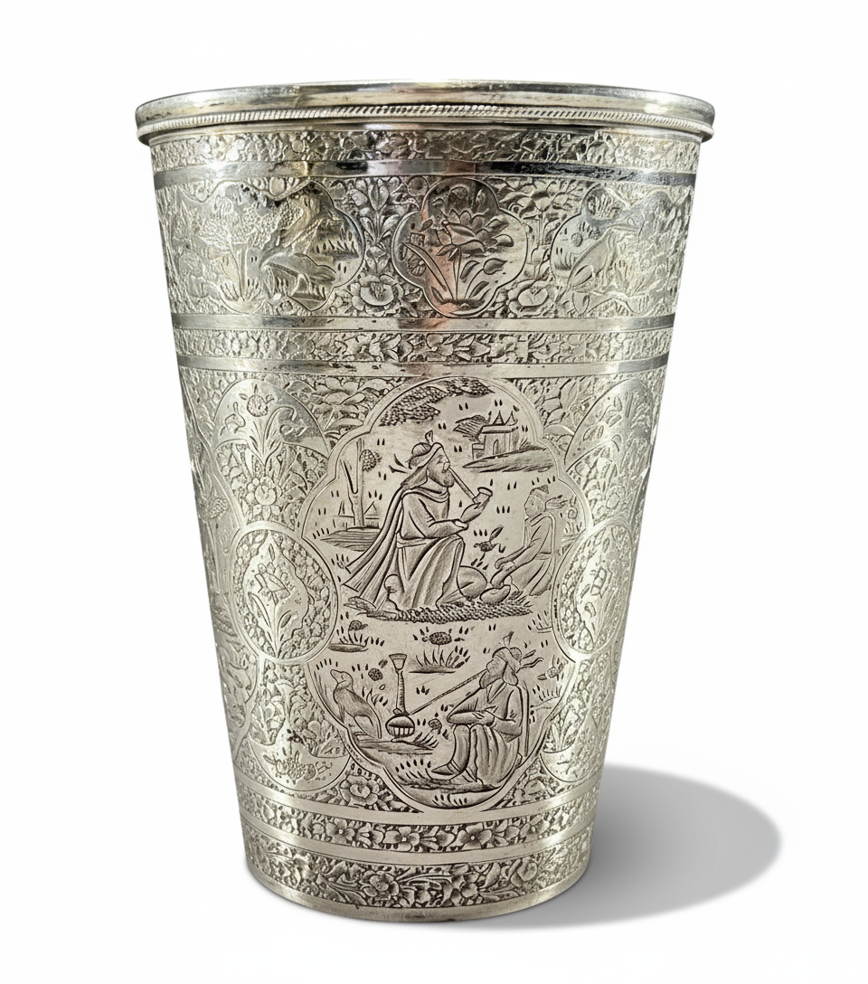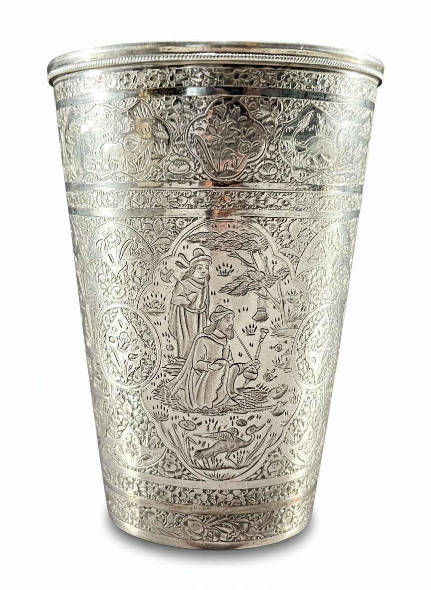 A FINELY ENGRAVED PERSIAN SILVER CUP PROBABLY BY MASTER JAAFAR, 19TH CENTURY