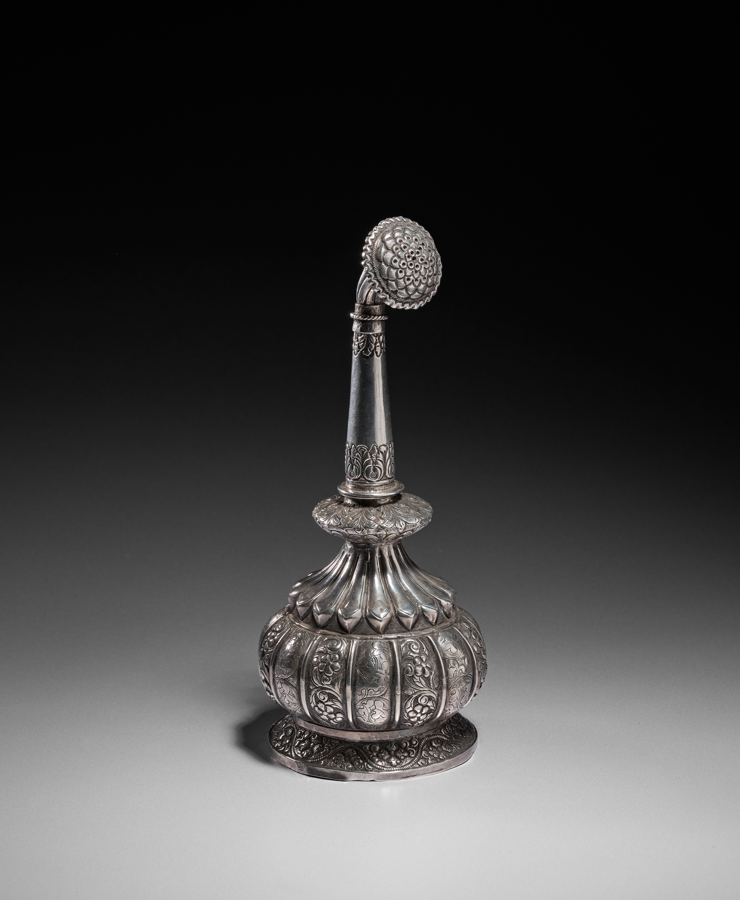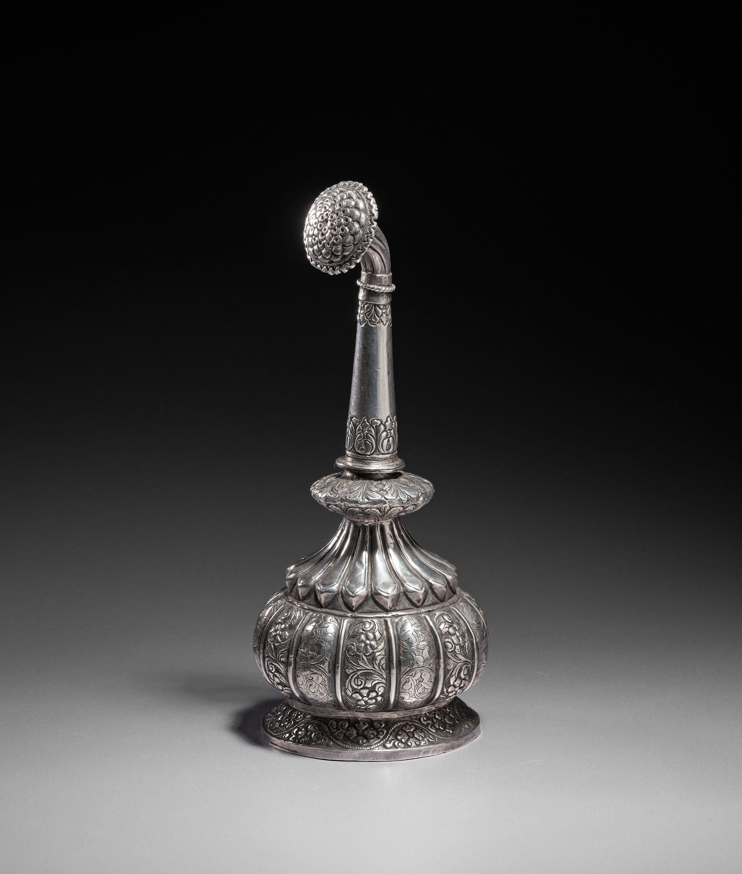This elegant silver rosewater sprinkler is crafted in a classic Indian form, featuring a rounded, lobed body richly decorated with finely chased floral and foliate motifs. The elongated tapering neck is adorned with engraved patterns and rises gracefully to a curved spout capped with a beautifully detailed, domed rosette finial. The design displays a harmonious blend of sculptural shaping and intricate surface ornamentation characteristic of refined Indian silverwork of the period.