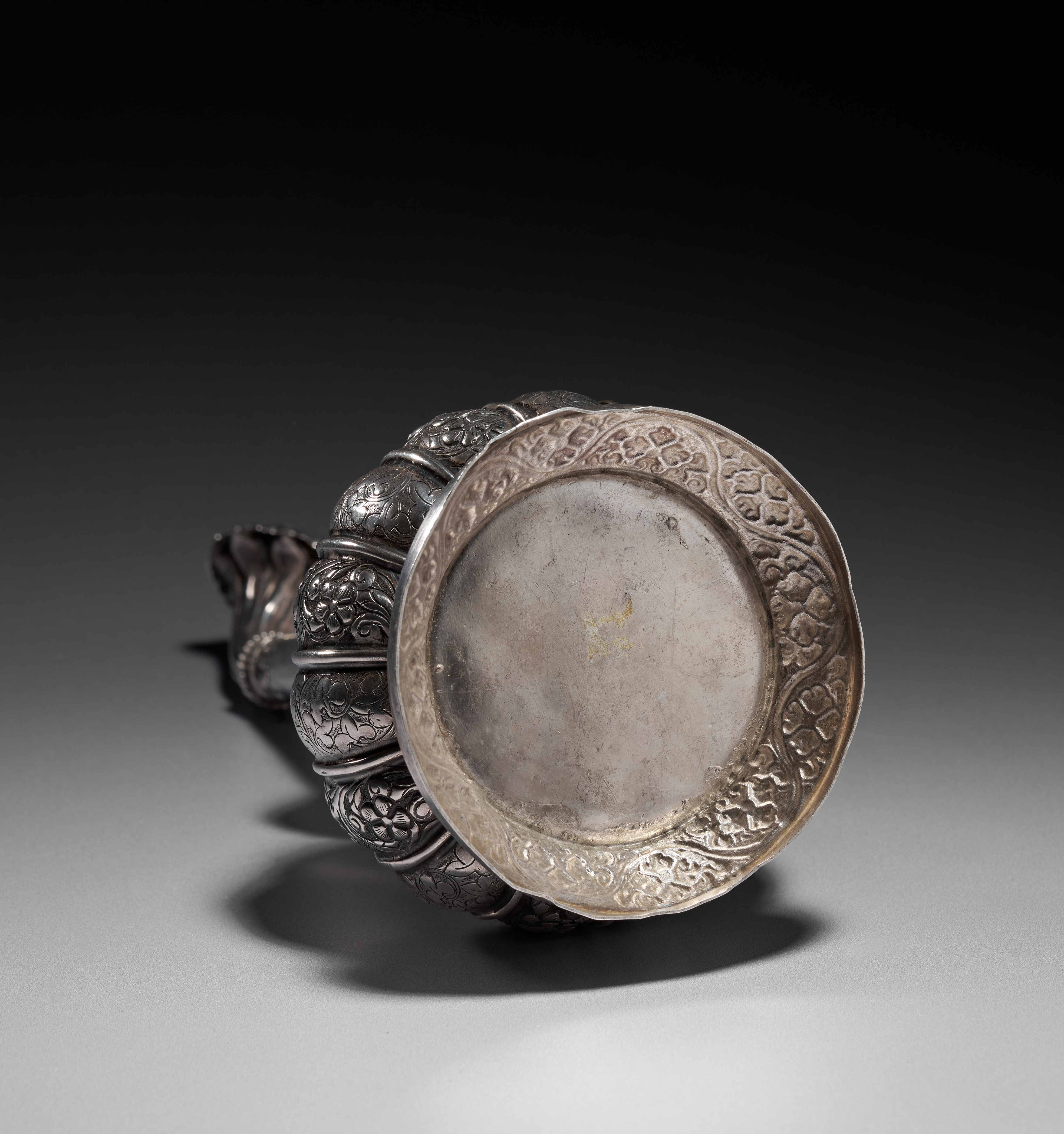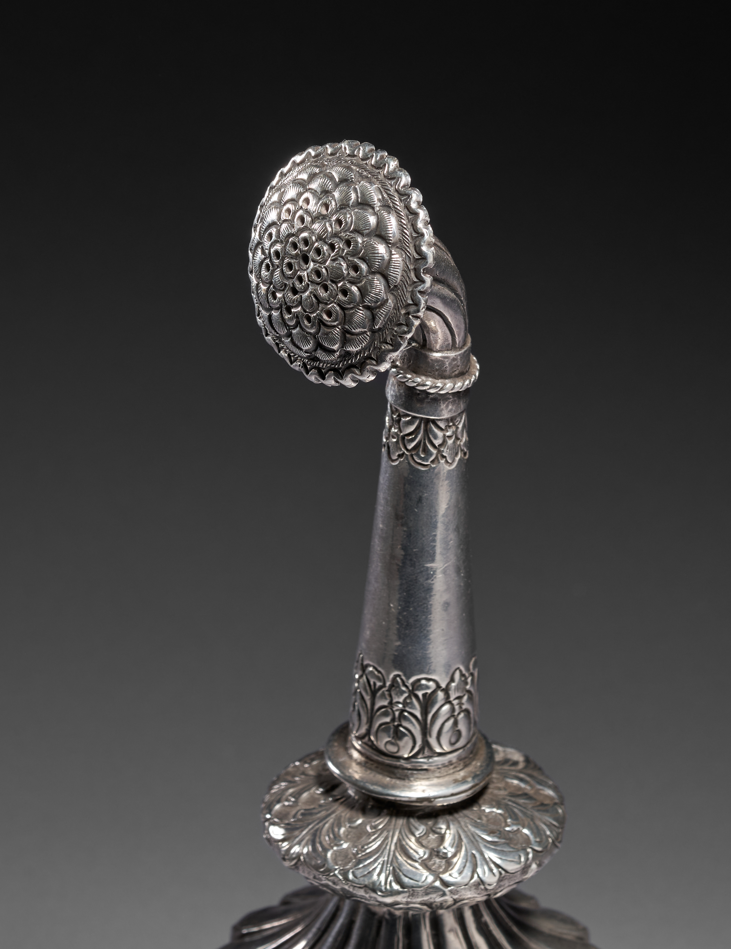 The underside shows a smooth, worn base consistent with age and use, bordered by a band of engraved scrolling decoration. Overall, the piece demonstrates excellent craftsmanship and retains a pleasing patina, making it a distinguished example of traditional rosewater sprinklers used in ceremonial and domestic settings throughout the 18th and 19th centuries.
