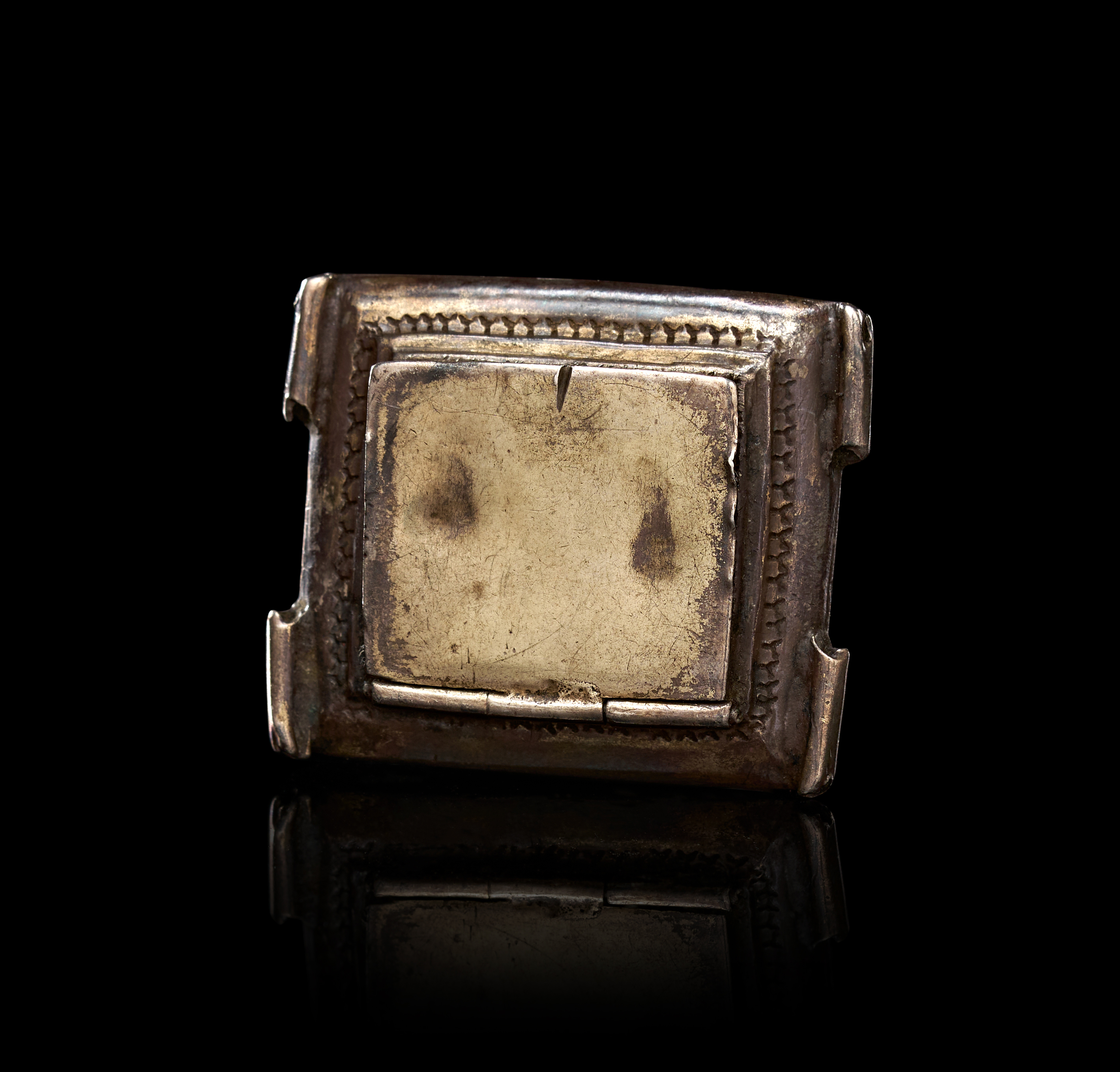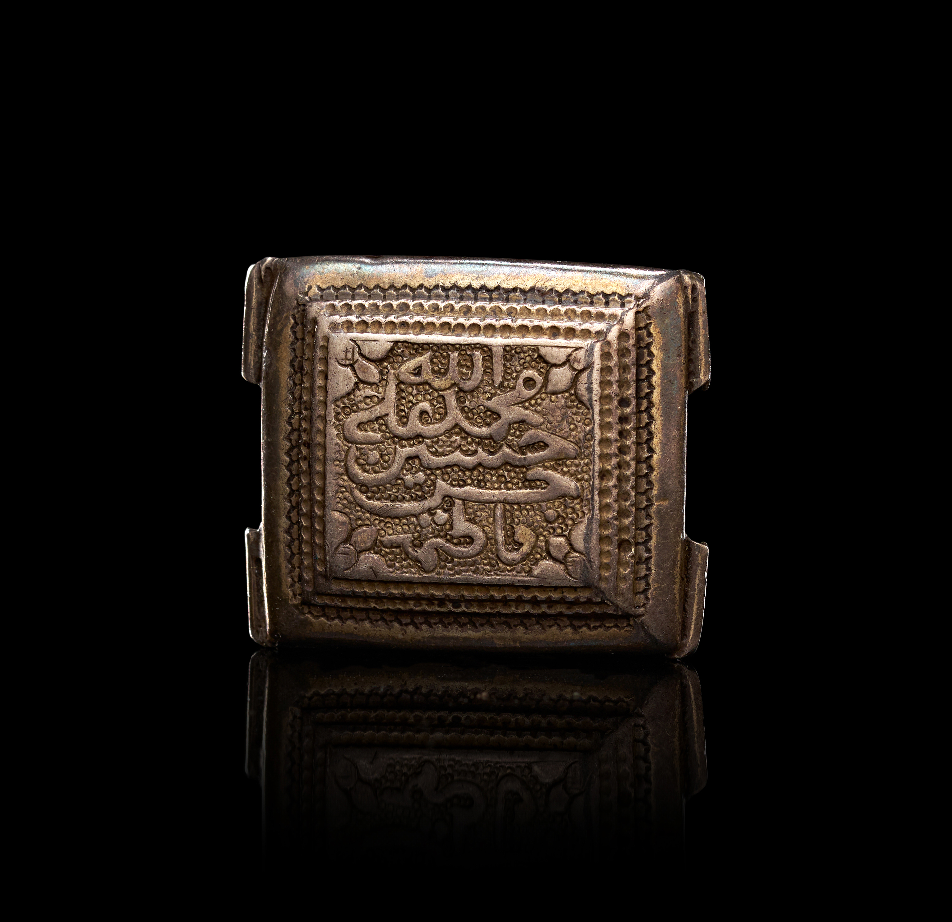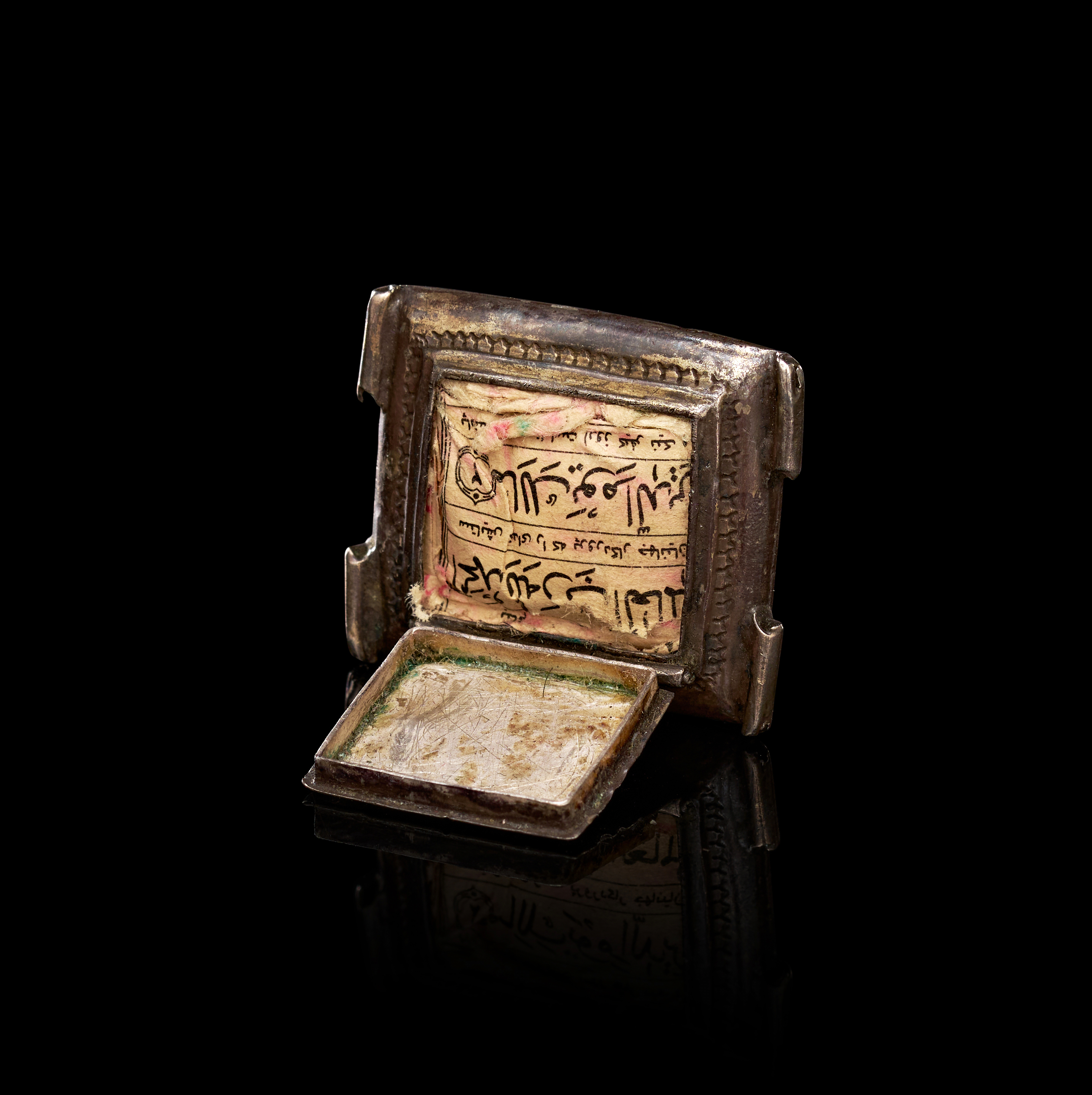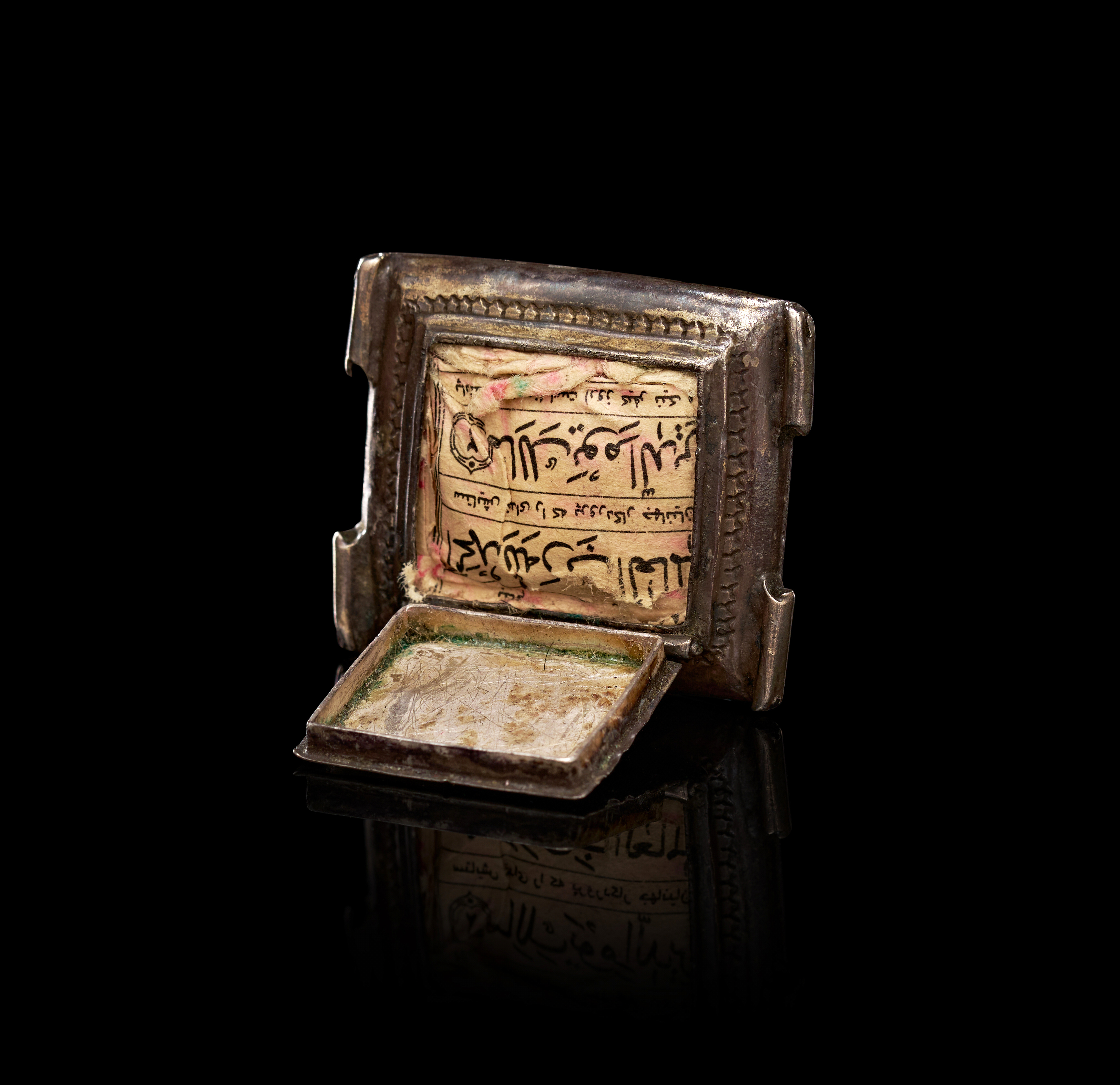 This square silver amulet case is finely crafted with a hinged lid and decorated on the front with an elegant panel of incised Persian calligraphy framed by multiple beaded borders. The script is executed with confident, flowing strokes, surrounded by small punched detailing that enhances its visual depth. The case opens to reveal an interior compartment containing a manuscript amulet written in black ink with red highlights, preserved behind the original protective panel. The reverse is plain, bearing natural wear and patination consistent with age and devotional use. Amulet cases of this type were traditionally worn for spiritual protection, often containing Qur’anic verses or talismanic inscriptions. This example stands out for its refined workmanship, intact mechanism, and well-preserved interior text, making it a highly collectible piece of Persian devotional silverwork.