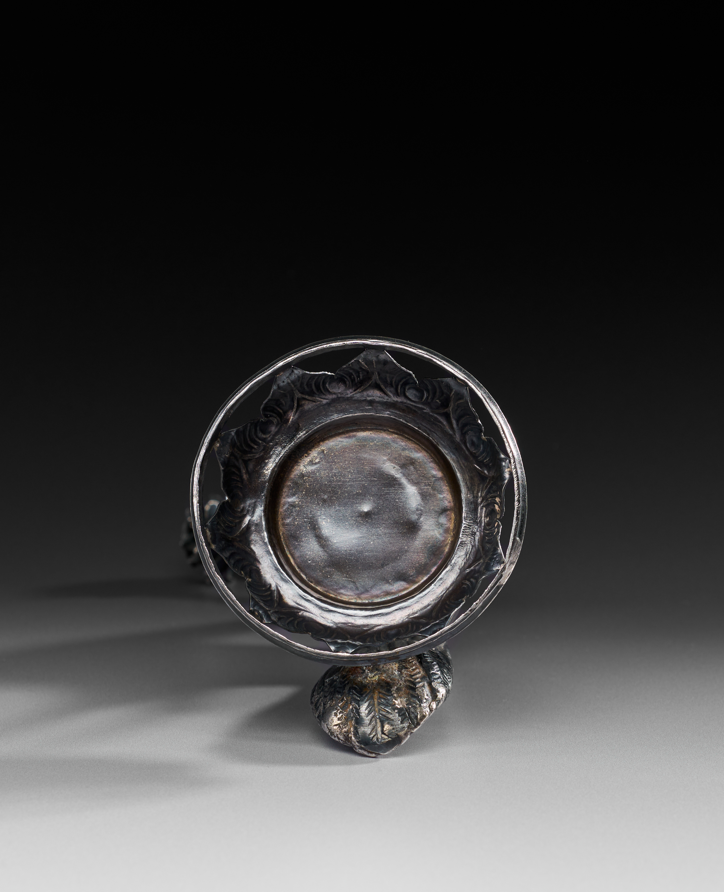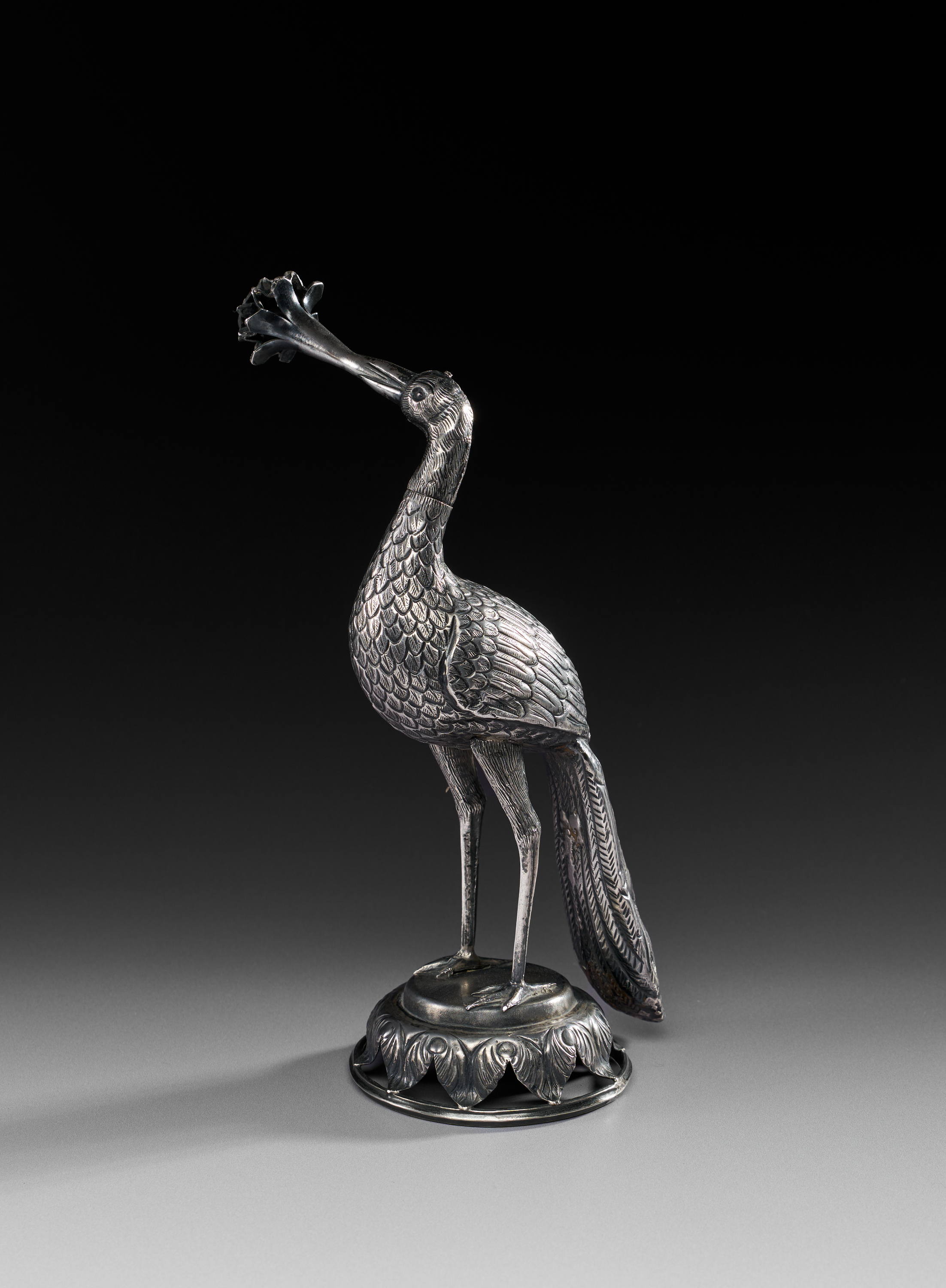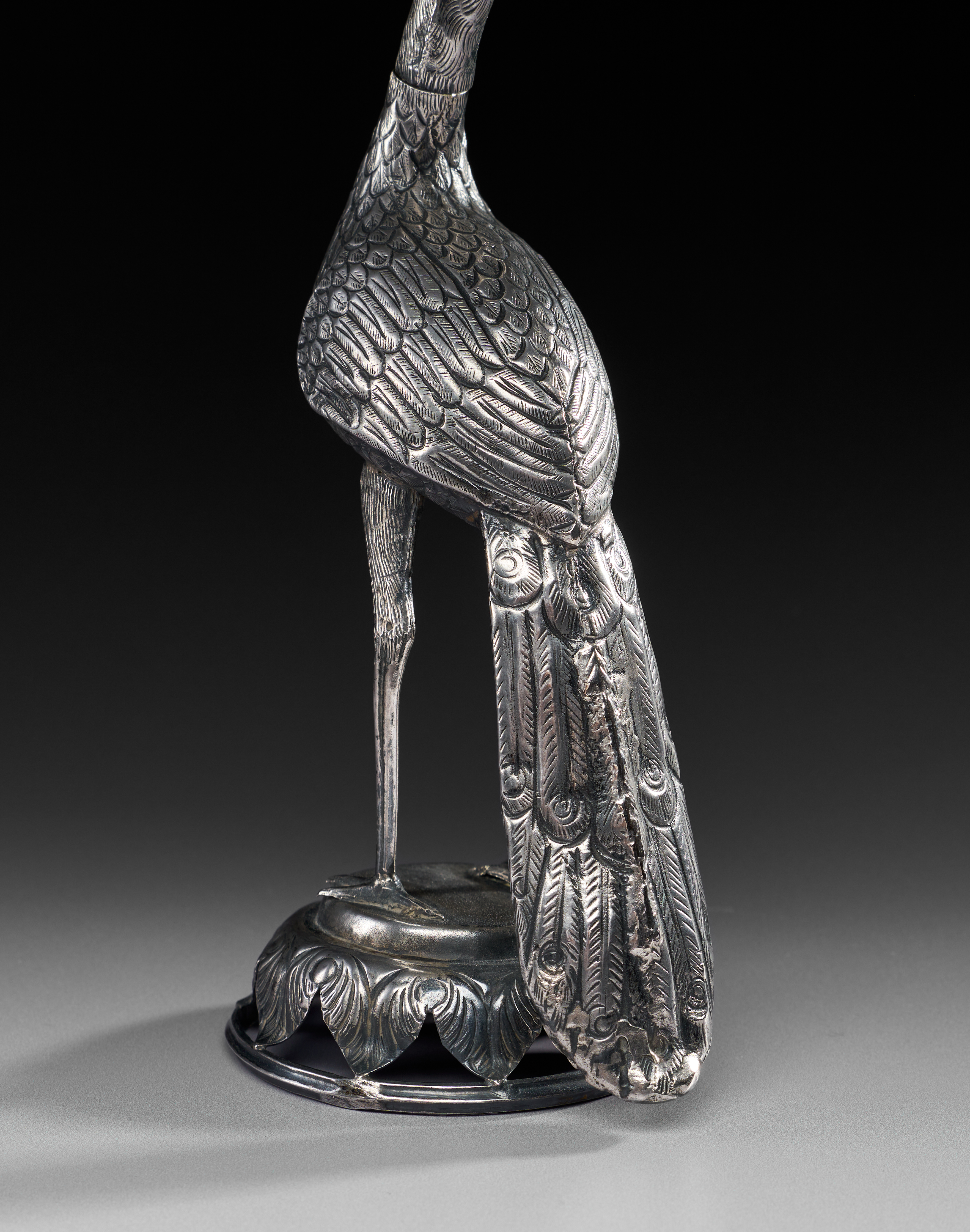 Finely crafted in the form of a long-legged bird, possibly a peacock, standing on a circular lotus-petal base. The body and wings are richly engraved with detailed feather patterns, while the elongated neck ends in a flaring rosewater spout shaped as a blossom. The tail is gracefully rendered with chased decoration, complementing the naturalistic modelling of the figure.