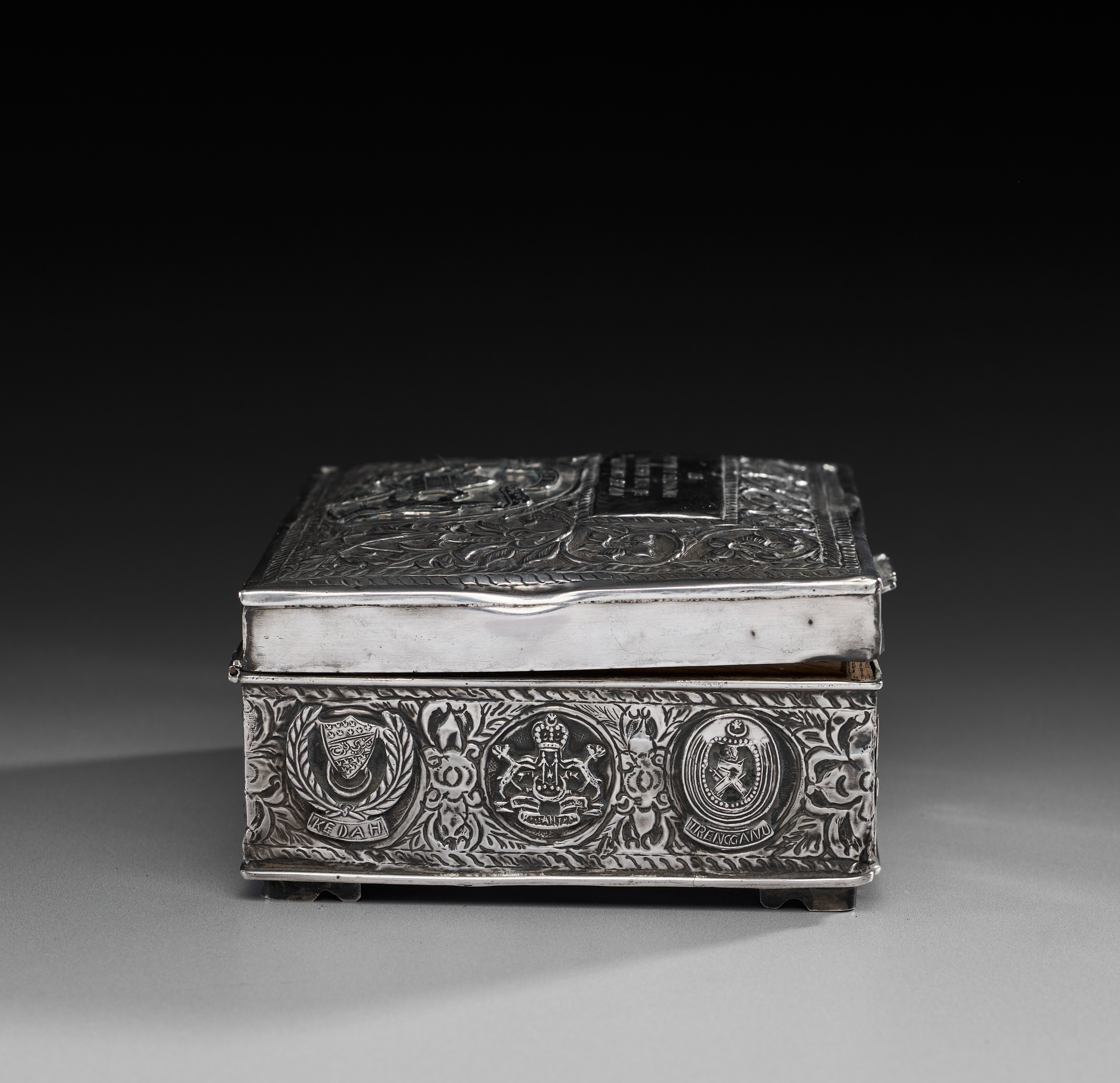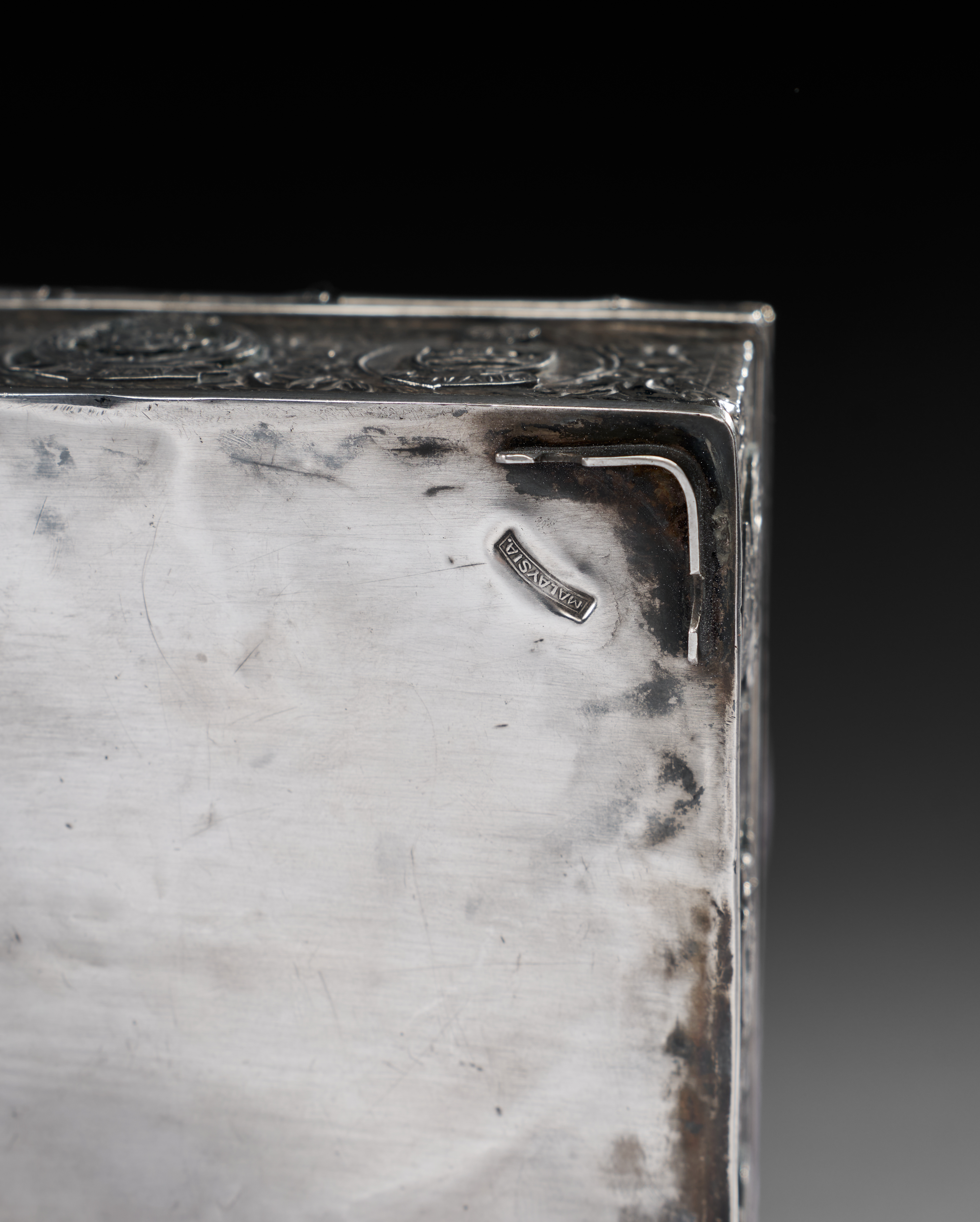 Rectangular in form and raised on four small feet, the box is worked in repoussé and chased sterling silver. The sides are decorated with panels of scrolling foliage enclosing the emblems of the Malaysian states, each identified by name. The hinged lid is framed with vegetal motifs and bears the Malaysian coat of arms in high relief above a presentation plaque inscribed: “With best compliments from Datuk Hussein Onn, Prime Minister of Malaysia, 1977.” The base is stamped MALAYSIA.
