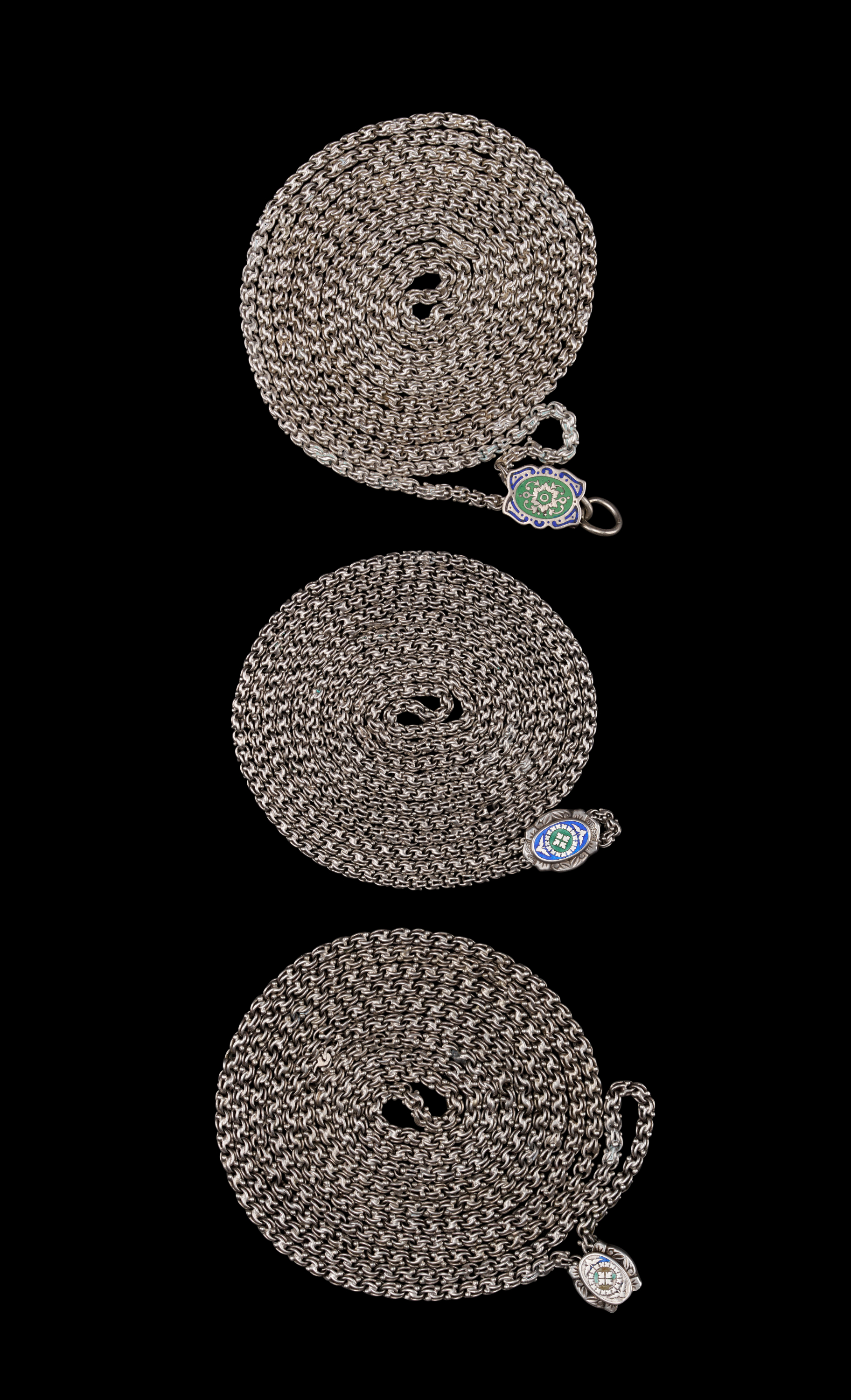 A group of three long hand-crafted silver chains, each tightly coiled for presentation. The links exhibit a traditional Middle Eastern chain-work style typical of Iraqi Jewish silverwork in the early–mid 20th century. Each chain terminates in a decorative enamelled silver finial featuring vibrant colours—green, blue, and white—depicting a stylised floral or geometric motif framed within a shaped silver mount. These enamel plaques are characteristic of Iraqi Judaica accessories, often seen on Torah ornaments, household ritual items, or personal adornments.