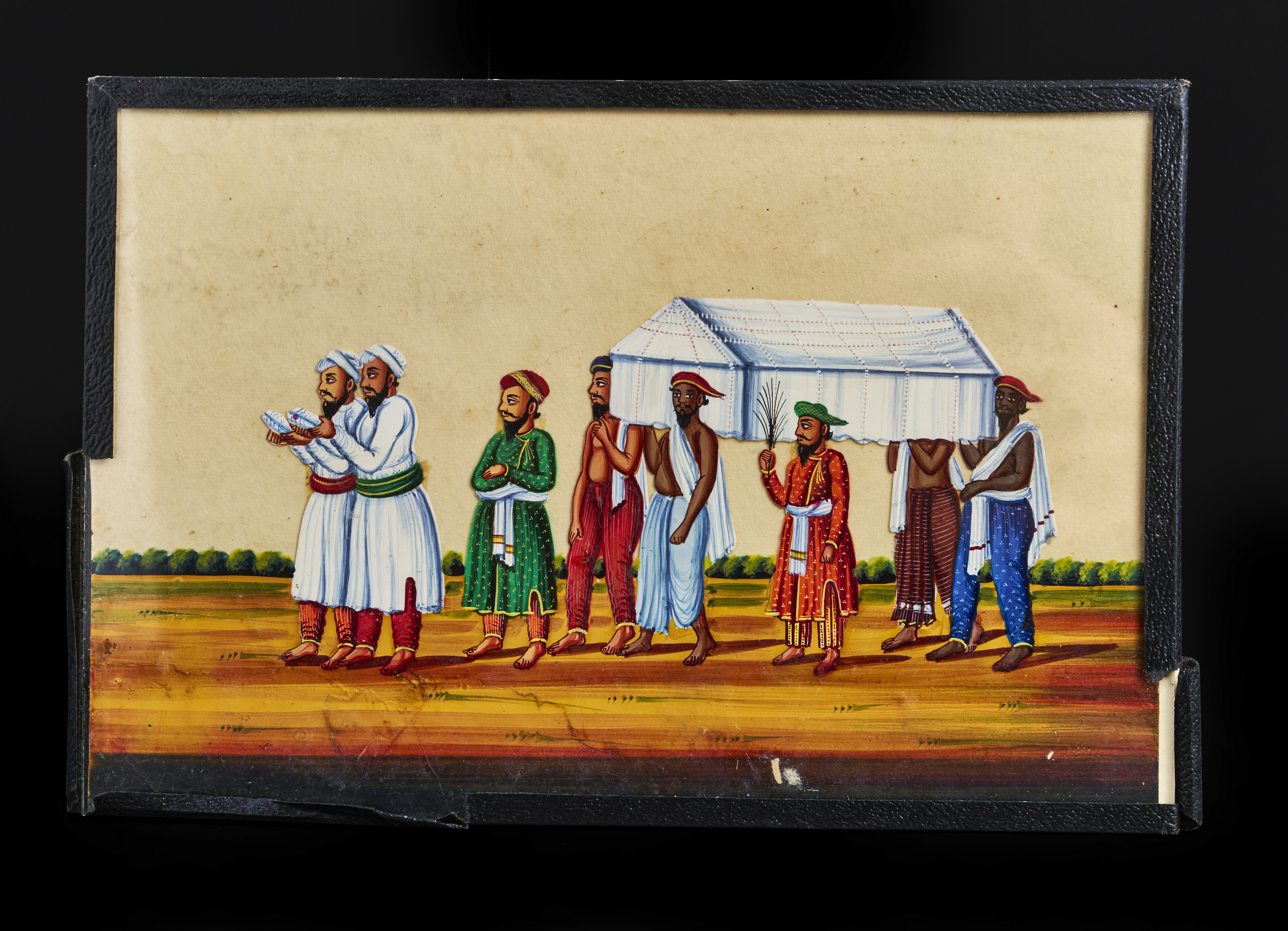 A rare and finely preserved set of thirteen Indian mica paintings from the Company School period, dating to the 19th century, vividly depicting scenes of everyday life and ceremonial occasions in colonial India.